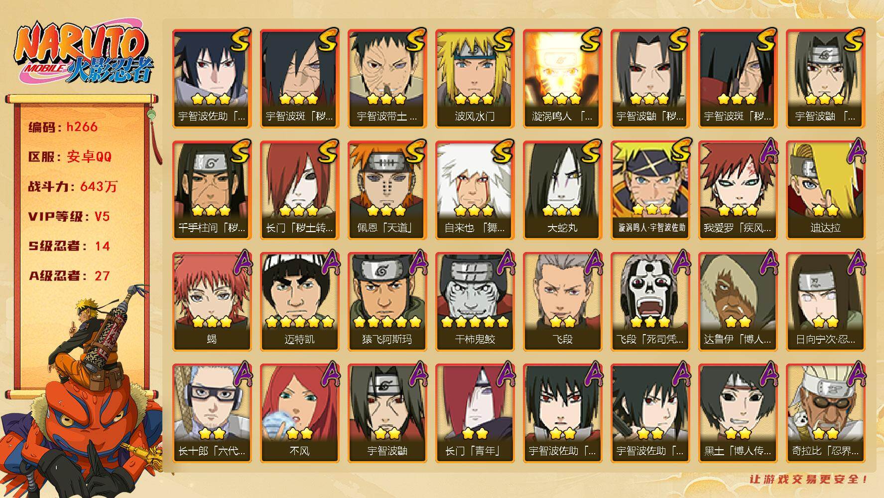 [15861677]14S级忍者数-27A级忍者数 【S级忍者】:长门「秽土转生」(3星),千手柱间「秽土转生」(3星),宇智波鼬「秽土转生」(3星),宇智波斑「秽土转生」(3星),宇智波斑「秽土转生·解」(3星),宇智波带土「忍界大战」(3星),宇智波鼬「须佐能乎」(3星),自来也「舞之豪杰」(3星),大蛇丸(3星),波风水门(3星),漩涡鸣人「九喇嘛连结」(3星),佩恩「天道」(3星),宇智波佐助「永恒万花筒」(3星),漩涡鸣人·宇智波佐助(3星) 【A级忍者】:长门「青年」(2星),达鲁伊「博人传」(2星),迪达拉(2星),大蛇丸「晓」(2星),奇拉比「忍界大战」(2星),飞段(2星),飞段「死司凭血」(3星),干柿鬼鲛(5星),漩涡博人「桃式显现」(2星),迈特凯(5星),我爱罗「疾风传」(3星),蝎(3星),猿飞阿斯玛(5星),宇智波鼬(2星),宇智波鼬「夏日限定」(2星),宇智波佐助「须佐能乎」(2星),宇智波佐助「万花筒写轮眼」(2星),药师兜「半蛇斗篷」(2星),照美冥「五代目水影」(2星),日向宁次「忍界大战」(2星),长十郎「六代目水影」(2星),黑土「博人传」(2星),秋道丁次「忍界大战」(2星),千代「近松十人卫」(2星),不风(2星),宇智波泉奈(2星),迈特凯「青春爆炸」(2星)