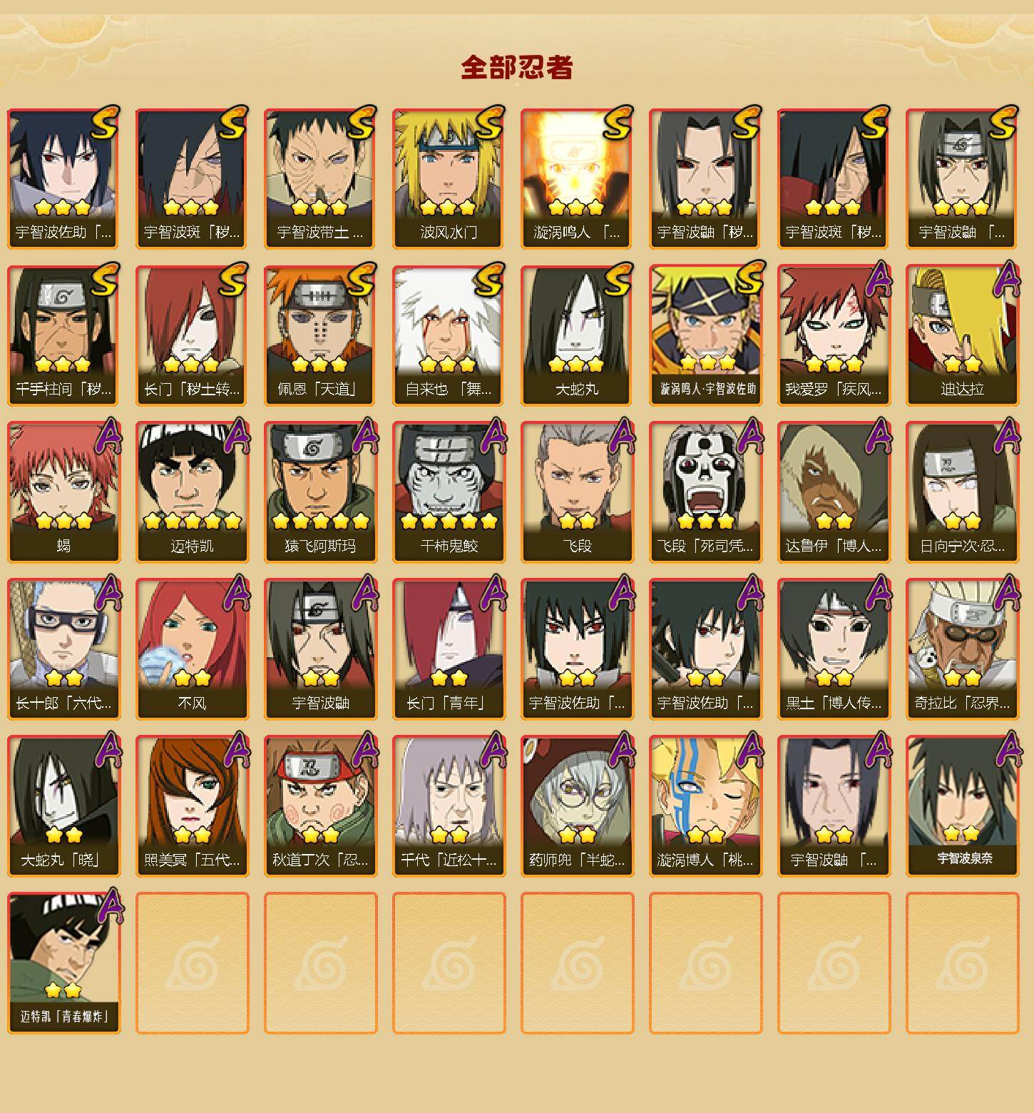 【A级忍者】:长门「青年」(2星),达鲁伊「博人传」(2星),迪达拉(2星),大蛇丸「晓」(2星),奇拉比「忍界大战」(2星),飞段(2星),飞段「死司凭血」(3星),干柿鬼鲛(5星),漩涡博人「桃式显现」(2星),迈特凯(5星),我爱罗「疾风传」(3星),蝎(3星),猿飞阿斯玛(5星),宇智波鼬(2星),宇智波鼬「夏日限定」(2星),宇智波佐助「须佐能乎」(2星),宇智波佐助「万花筒写轮眼」(2星),药师兜「半蛇斗篷」(2星),照美冥「五代目水影」(2星),日向宁次「忍界大战」(2星),长十郎「六代目水影」(2星),黑土「博人传」(2星),秋道丁次「忍界大战」(2星),千代「近松十人卫」(2星),不风(2星),宇智波泉奈(2星),迈特凯「青春爆炸」(2星)