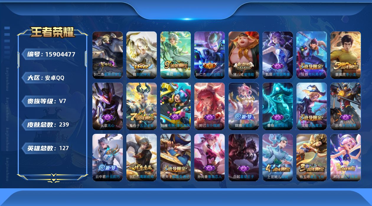 [15904477]安卓Q-V7-尊贵铂金I段位-127英雄-239皮肤-4传说-42史诗 【传说皮肤】:后羿神树通天,桑启鸣野蒿,镜炽阳神光,狄仁杰超时空战士 【限定皮肤】:狄仁杰阴阳师,虞姬凯尔特女王,赵云皇家上将,墨子神迹守卫,嬴政优雅恋人,孙尚香蔷薇恋人,庄周高山流水,孙膑妖精王,白起夜都怪侠,芈月幻夜卜梦,元歌无心,夏侯惇朔风刀,曹操烛龙,狄仁杰魔术师,狄仁杰万华元夜,达摩星际陆战队,达摩沙漠行僧,项羽海滩派对,老夫子醍醐杖,老夫子航海奇遇记,程咬金演武夺筹,王昭君午后时光,兰陵王金庭之子,牛魔御旌,后羿圣弓游侠,李元芳云中旅人,钟馗驱傩正仪,杨玉环遇见飞天,干将莫邪真爱魔法,雅典娜黎明之约,蔡文姬繁星吟游,太乙真人饕餮,鬼谷子原初探秘者,鬼谷子五谷丰年,黄忠火炮绅士,苏烈千军破阵,弈星混沌棋,沈梦溪大漠名商,明世隐疑决卦,明世隐吟游魔法,裴擒虎李小龙,裴擒虎擒涛扼浪,狂铁电玩高手,米莱狄御霄,米莱狄胡桃异想国,云中君纤云弄巧,猪八戒猪悟能,上官婉儿梁祝,嫦娥拒霜思,西施玲珑珍味,鲁班大师探海日志,桑启海盐诗旅,戈娅驭风魔法,艾琳女武神,阿古朵江河有灵,张良古海寻踪,鬼谷子天穹祈灯,沈梦溪龙舞盛年 【赛季限定】:孙膑妖精王,夏侯惇朔风刀,曹操烛龙,狄仁杰万华元夜,达摩沙漠行僧,老夫子醍醐杖,程咬金演武夺筹,兰陵王金庭之子,张良古海寻踪,牛魔御旌,李元芳云中旅人,虞姬凯尔特女王,钟馗驱傩正仪,雅典娜黎明之约,太乙真人饕餮,鬼谷子原初探秘者,苏烈千军破阵,弈星混沌棋,沈梦溪大漠名商,明世隐疑决卦,裴擒虎擒涛扼浪,米莱狄御霄,鲁班大师探海日志,桑启海盐诗旅,鬼谷子天穹祈灯 【战令限定】:墨子神迹守卫,白起夜都怪侠,芈月幻夜卜梦,达摩星际陆战队,老夫子航海奇遇记,王昭君午后时光,后羿圣弓游侠,干将莫邪真爱魔法,黄忠火炮绅士,明世隐吟游魔法,狂铁电玩高手,米莱狄胡桃异想国,西施玲珑珍味,戈娅驭风魔法 【史诗皮肤】:赵云皇家上将,赵云未来纪元,甄姬冰雪圆舞曲,狄仁杰魔术师,廉颇地狱岩魂,宫本武藏鬼剑武藏,孙尚香蔷薇恋人,孙尚香水果甜心,嬴政优雅恋人,妲己魅力维加斯,妲己女仆咖啡,墨子金属风暴,刘禅绅士熊喵,曹操幽灵船长,吕布末日机甲,刘邦德古拉伯爵,小乔缤纷独角兽,刘禅天才门将,李元芳逐浪之夏,白起星夜王子,阿轲节奏热浪,杨玉环遇见飞天,狄仁杰鹰眼统帅,上官婉儿梁祝,蔡文姬繁星吟游,裴