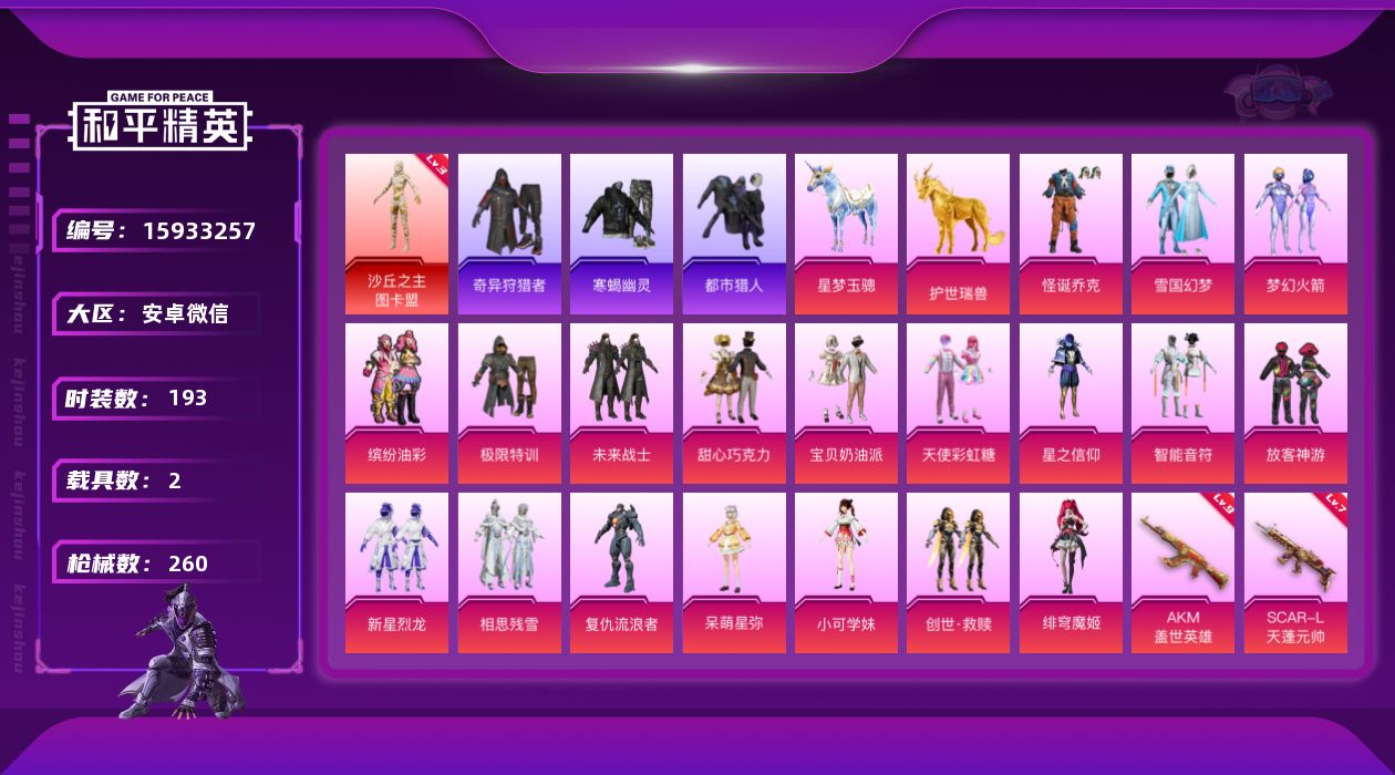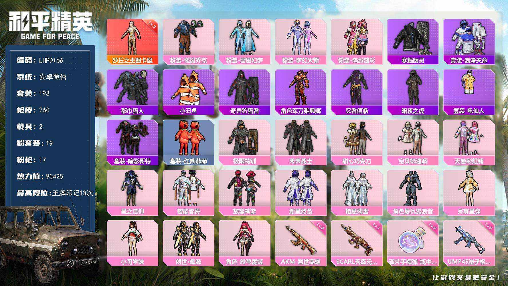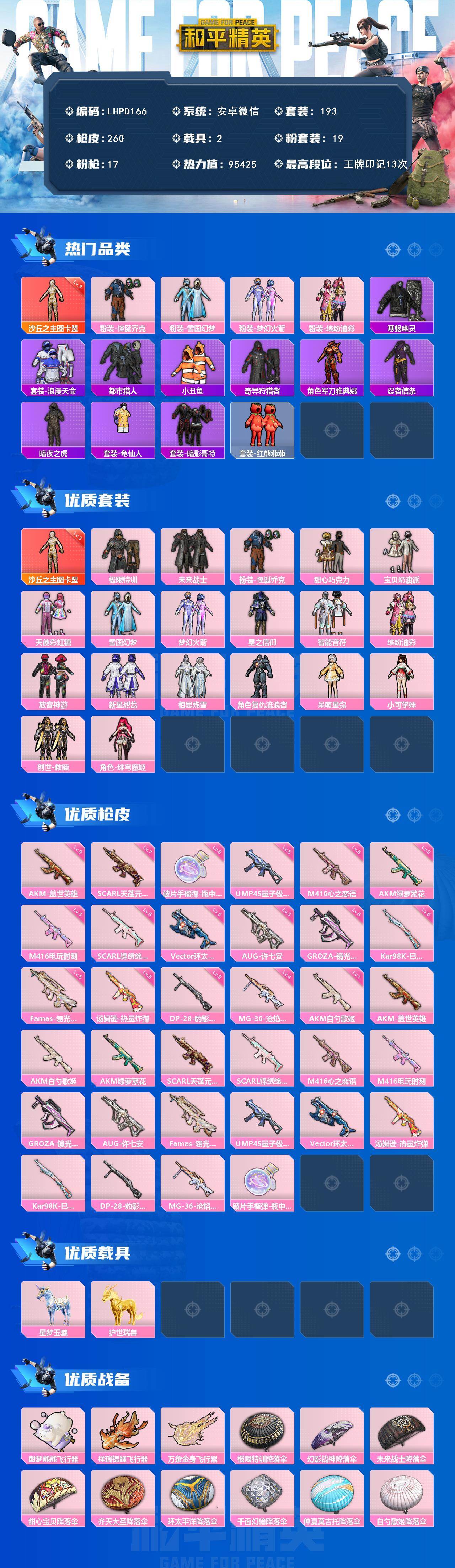 [15933257]【特价出售/店主推荐】安卓 微信-1神装-19粉装-17特效枪-2载具-6粉色飞行器-95425热力值-13王牌印记-193套装-260枪皮【红色神装等级】:沙丘之主-图卡盟(三级)【红色角色神装】:沙丘之主-图卡盟【热门品类】:粉装-怪诞乔克,粉装-雪国幻梦,粉装-梦幻火箭,粉装-缤纷油彩,套装-寒蝎幽灵,套装-浪漫天命,套装-都市猎人,套装-小丑鱼,套装-奇异狩猎者,角色-军刀雅典娜,套装-忍者信条,套装-暗夜之虎,套装-龟仙人,套装-暗影哥特,套装-红熊茄茄【粉色套装】:粉装-极限特训,粉装-未来战士,粉装-怪诞乔克,粉装-甜心巧克力,粉装-宝贝奶油派,粉装-天使彩虹糖,粉装-雪国幻梦,粉装-梦幻火箭,粉装-星之信仰,粉装-智能音符,粉装-缤纷油彩,粉装-放客神游,粉装-新星烈龙,粉装-相思残雪,角色-复仇流浪者,角色-呆萌星弥,角色-小可学妹,套装-创世·救赎,角色-绯穹魔姬【粉色枪皮等级】:AKM-盖世英雄(九级),AKM-白勺歌姬(一级),AKM-绿萝繁花(五级),SCAR-L-天蓬元帅(七级),SCAR-L-锦绣绵绵(五级),M416-心之恋语(五级),M416-电玩时刻(五级),GROZA-镜光银凌(五级),AUG-许七安(五级),Famas-翎光蝶翼(五级),UMP45-量子极限(五级),Vector-环太平洋(五级),汤姆逊-热量炸弹(五级),Kar98K-巳巳如意(五级),DP-28-豹影疾电(五级),MG-36-沧焰双生(四级),破片手榴弹-瓶中星球(六级)【粉色载具】:星梦玉骢,护世瑞兽【粉色枪皮】:AKM-盖世英雄,AKM-白勺歌姬,AKM-绿萝繁花,SCAR-L-天蓬元帅,SCAR-L-锦绣绵绵,M416-心之恋语,M416-电玩时刻,GROZA-镜光银凌,AUG-许七安,Famas-翎光蝶翼,UMP45-量子极限,Vector-环太平洋,汤姆逊-热量炸弹,Kar98K-巳巳如意,DP-28-豹影疾电,MG-36-沧焰双生,破片手榴弹-瓶中星球【粉色飞行器】:酣梦熊熊飞行器,祥瑞锦鲤飞行器,万象金身飞行器