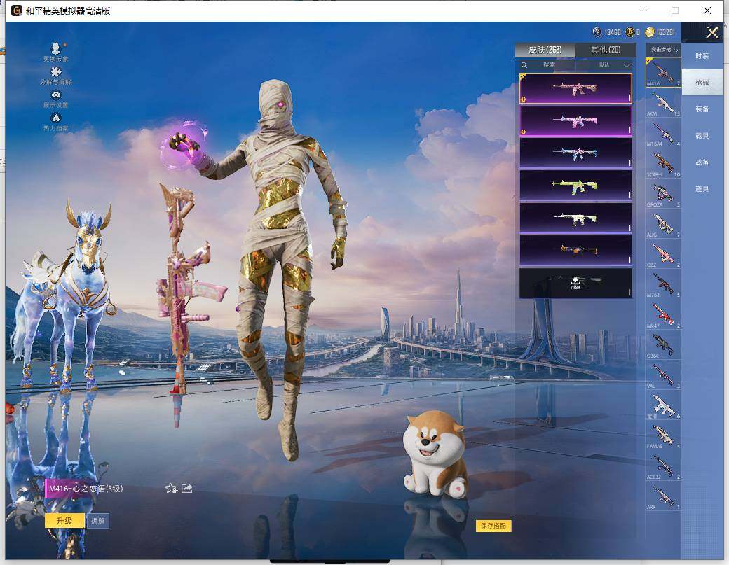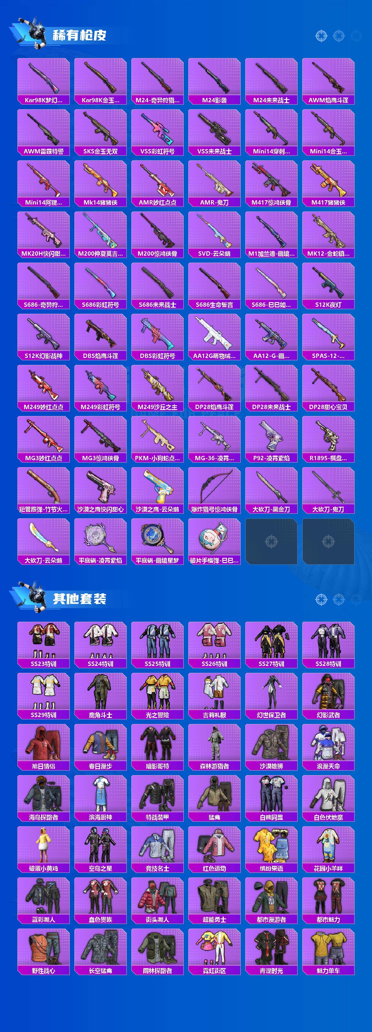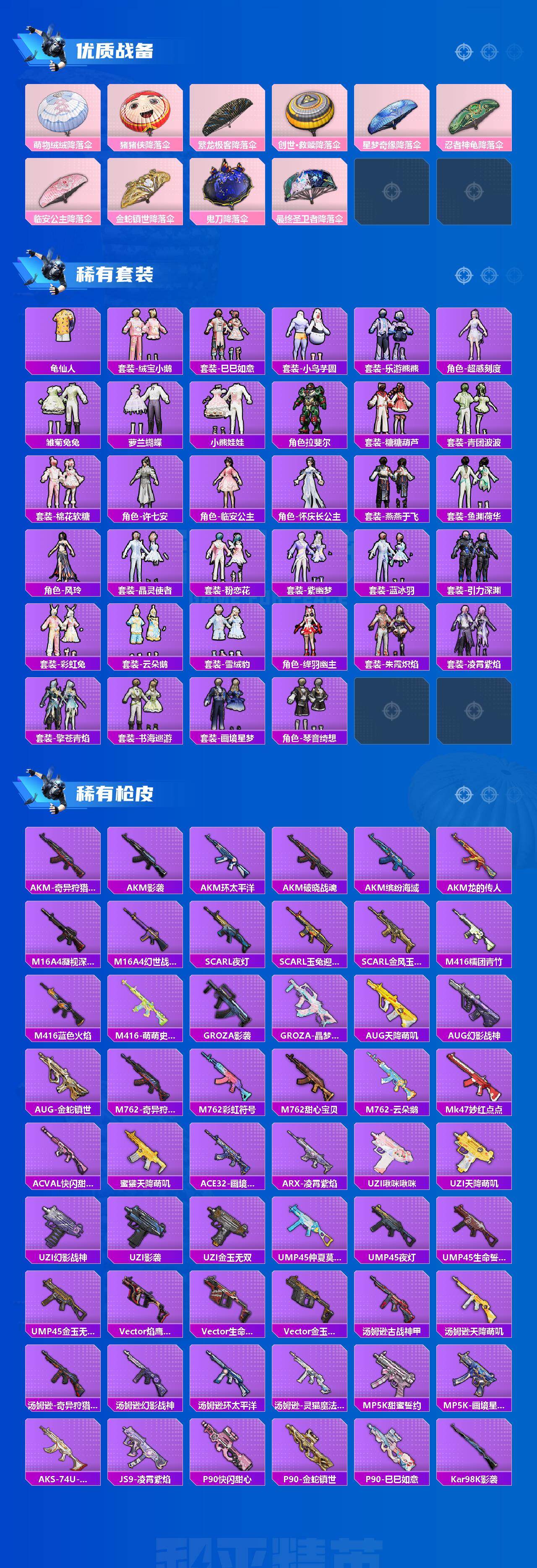 AKM-盖世英雄,AKM-白勺歌姬,AKM-绿萝繁花,SCAR-L-天蓬元帅,SCAR-L-锦绣绵绵,M416-心之恋语,M416-电玩时刻,GROZA-镜光银凌,AUG-许七安,UMP45-量子极限,Vector-环太平洋,Kar98K-巳巳如意