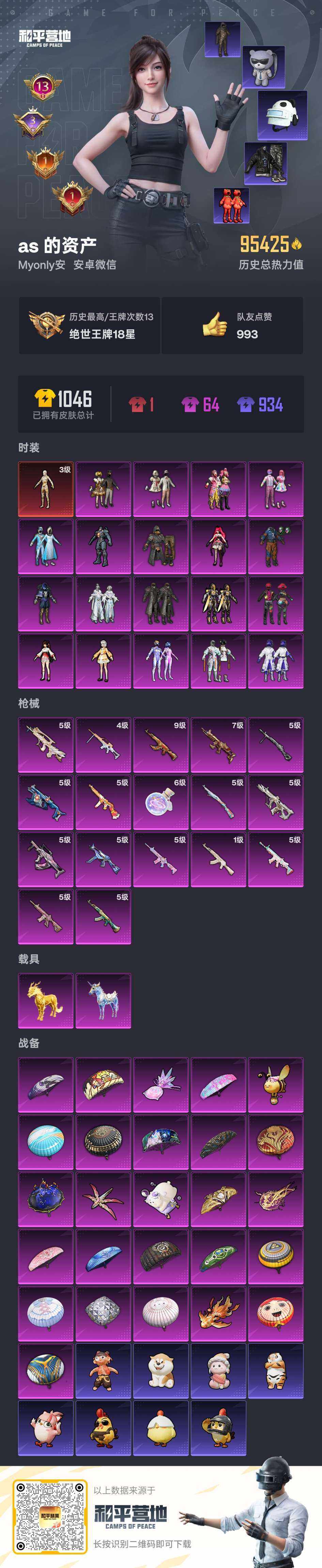 - [16409734]【店主推荐捡漏号!可直接换绑】安卓 手Q-2神装-13粉装-18特效枪-2载具-14粉色飞行器-109824热力值-11王牌印记-193套装-310枪皮【红色神装等级】:暮色玫影-艾丽娅(一级),沙丘之主-图卡盟(四级)【红色角色神装】:暮色玫影-艾丽娅,沙丘之主-图卡盟【热门品类】:粉装-梦幻火箭,粉装-音爆索尼克,套装-冥河战士,套装-深海小丑鱼,套装-小丑鱼,角色-2P战斗服款,套装-龟仙人,角色-8号机,角色-Mark.06【粉色套装】:粉装-梦幻火箭,粉装-金属狂野,粉装-甜蜜誓约,角色-洛天依,角色-歌者泠鸢,粉装-音爆索尼克,粉装-飒粉甜心,角色-烟云彩露,角色-初号机 觉醒Ver.,角色-月影灵韵,粉装-雪月幻音,角色-绯穹魔姬,角色-异瞳寒姬【粉色枪皮等级】:AKM-暮色玫影(三级),SCAR-L-纯梦嫁纱(四级),SCAR-L-锦绣绵绵(五级),M416-五爪金龙(七级),M416-电玩时刻(五级),GROZA-精灵之光(六级),AUG-星之彼岸(一级),AUG-星梦奇缘(三级),AUG-暖羊咩咩(五级),蜜獾-异瞳寒姬(三级),UMP45-量子极限(五级),UMP45-宇宙意志(三级),AKS-74U-森灵之息(五级),Kar98K-巳巳如意(五级),Mk14-盛世惊鸿(三级),M200-梦海之灵(三级),DP-28-暗夜鎏金(四级),DP-28-豹影疾电(五级)【粉色载具】:海龙奔腾,星梦玉骢【粉色枪皮】:AKM-暮色玫影,SCAR-L-纯梦嫁纱,SCAR-L-锦绣绵绵,M416-五爪金龙,M416-电玩时刻,GROZA-精灵之光,AUG-星之彼岸,AUG-星梦奇缘,AUG-暖羊咩咩,蜜獾-异瞳寒姬,UMP45-量子极限,UMP45-宇宙意志,AKS-74U-森灵之息,Kar98K-巳巳如意,Mk14-盛世惊鸿,M200-梦海之灵,DP-28-暗夜鎏金,DP-28-豹影疾电【粉色飞行器】:梦幻火箭飞行器,天之羽翼飞行器,千面幻镜飞行器,繁龙极客飞行器,镜域双华-灵镜之阶,龙翔九天飞行器,幻海精灵飞行器,深渊漩涡飞行器,曦光华影飞行器,凤舞九天飞行器,灵珠游龙飞行器,暮色之舞飞行器