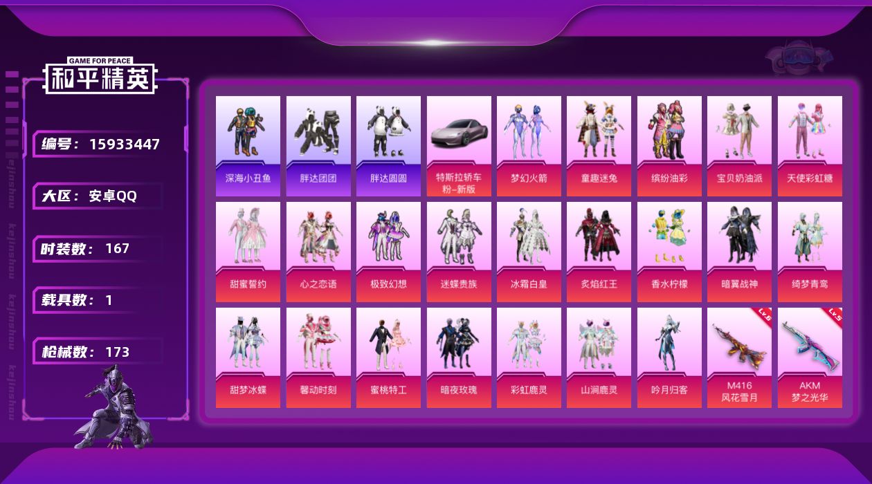 - [17217910]安卓 手Q-2粉装-5特效枪-1载具-1粉色飞行器-39883热力值-6王牌印记-111套装-128枪皮 【热门品类】:套装-小丑鱼 【粉色套装】:粉装-星夜魔法师,粉装-霞光圣骑 【粉色枪皮等级】:AKM-绿萝繁花(五级),SCAR-L-锦绣绵绵(五级),AKS-74U-森灵之息(五级),Kar98K-巳巳如意(五级),M249-绝对恒星(五级) 【粉色载具】:路特斯EVIJA(星际黄) 【粉色枪皮】:AKM-绿萝繁花,SCAR-L-锦绣绵绵,AKS-74U-森灵之息,Kar98K-巳巳如意,M249-绝对恒星 【粉色降落伞】:绝对恒星降落伞,暗星紫秘降落伞,青春物语降落伞,百合蜜语降落伞,无垠阁降落伞,异瞳寒姬降落伞,炫彩糖果降落伞 【稀有套装】:套装-巳巳如意,套装-雪国风尚,套装-炫彩糖果,角色-紫俏灵猫,套装-书海巡游,套装-画境星梦,套装-琴音绮想 【稀有枪皮】:AUG-冰晶雪宝,AKM-彩虹符号,AKM-灼热熔岩,AKM-破晓战魂,AKM-缤纷海域,AKM-龙的传人,M16A4-幻世战舞者,M16A4-甜心亚梦,M16A4-红色方程式,M16A4-蓝色火焰,SCAR-L-炫彩节奏,SCAR-L-玉兔迎春,SCAR-L-红色方程式,M416-糯团青竹,M416-红色方程式,M416-蓝色火焰,GROZA-异彩先驱,GROZA-青春物语,AUG-天降萌叽,AUG-耀粉歌者,QBZ-彩虹符号,QBZ-飞驰魅影,M762-天降萌叽,M762-彩虹符号,M762-牛气冲天,M762-登顶巅峰,G36C-青丘仙客,AC-VAL-天降萌叽,AC-VAL-甜心亚梦,蜜獾-天降萌叽,ACE32-画境星梦,UZI-啾咪啾咪,UZI-炫彩节奏,UMP45-涂山之恋,UMP45-蓝色火焰,Vector-彩虹符号,Vector-生命誓言,Vector-百合蜜语,汤姆逊-天降萌叽,汤姆逊-奇异狩猎者,汤姆逊-异彩先驱,MP5K-异彩先驱,MP5K-画境星梦,P90-飞驰魅影,P90-巳巳如意,Kar98K-彩虹符号,Kar98K-炫彩节奏,Kar98K-红色方程式,Kar98K-飞驰魅影,M24-炫彩节奏,AWM-圣堂之誓,SKS-炫彩节奏,Mini14-异彩先驱,Mini14-炫彩节奏,SLR-彩虹符号,莫辛纳甘-炙焰牛王,M417-惊鸿侠骨,M200-惊鸿侠骨,M1加兰德-