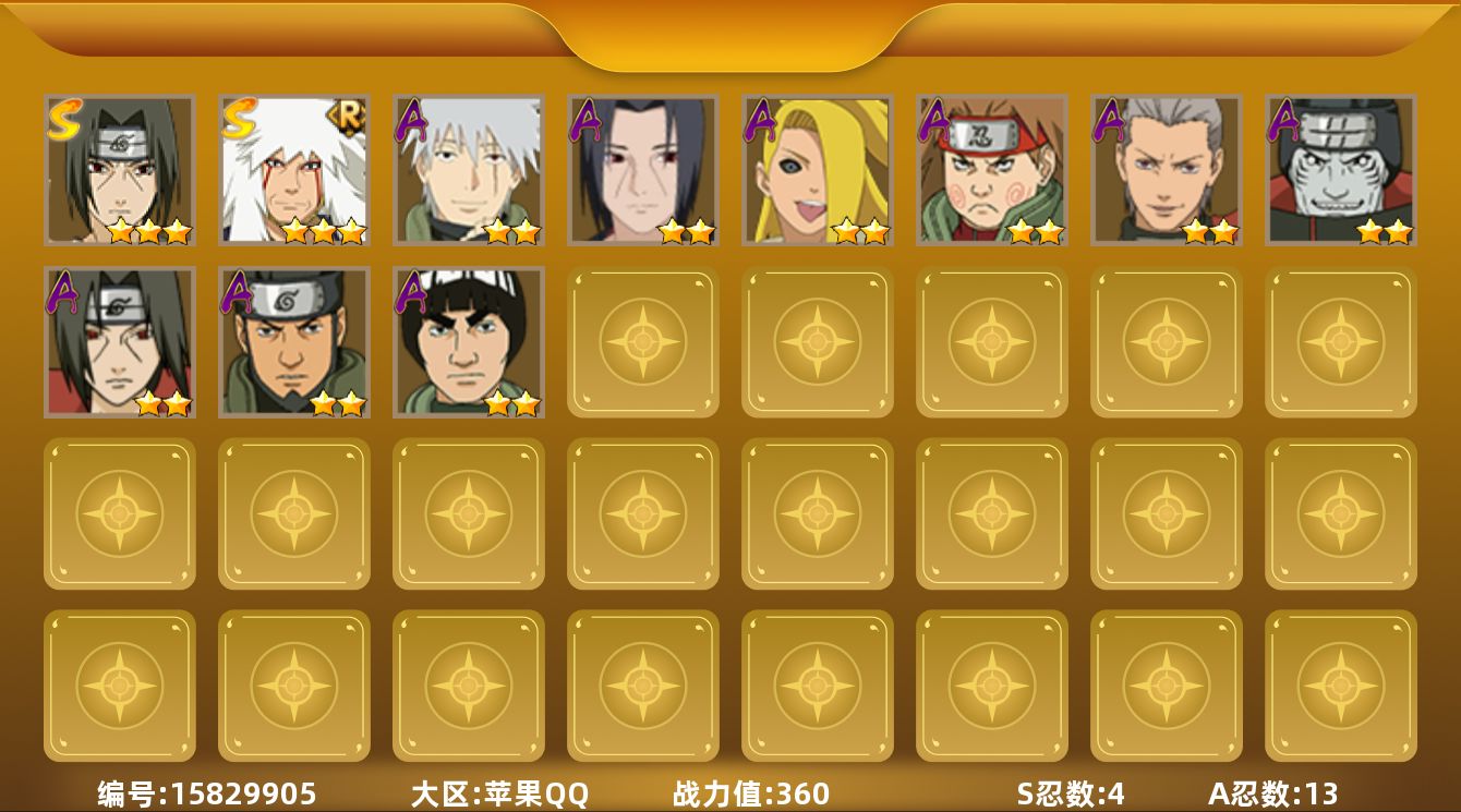 [15829905]V1/战力360W/S忍4/A忍13 3星宇智波鼬「须佐能乎」,3星自来也「舞之豪杰」,3星波风水门「九喇嘛连结」,3星漩涡鸣人·宇智波佐助,3星迈特凯,2星猿飞阿斯玛,2星干柿鬼鲛,2星飞段,2星宇智波鼬,2星迪达拉「秽土转生」,2星秋道丁次「忍界大战」,2星旗木卡卡西「幻之真容」,2星宇智波鼬「夏日限定」,2星桃地再不斩「秽土转生」,2星土台「忍界大战」,2星巳月「仙人模式」,2星迈特凯「青春爆炸」