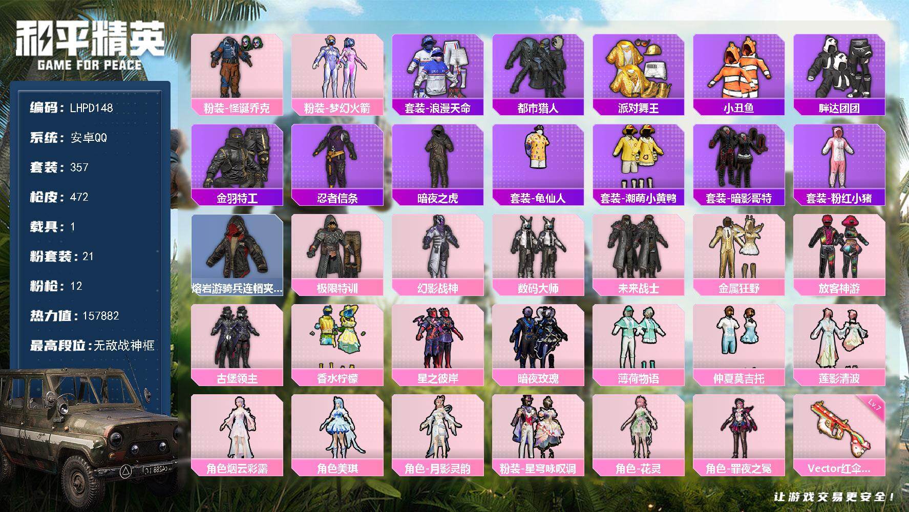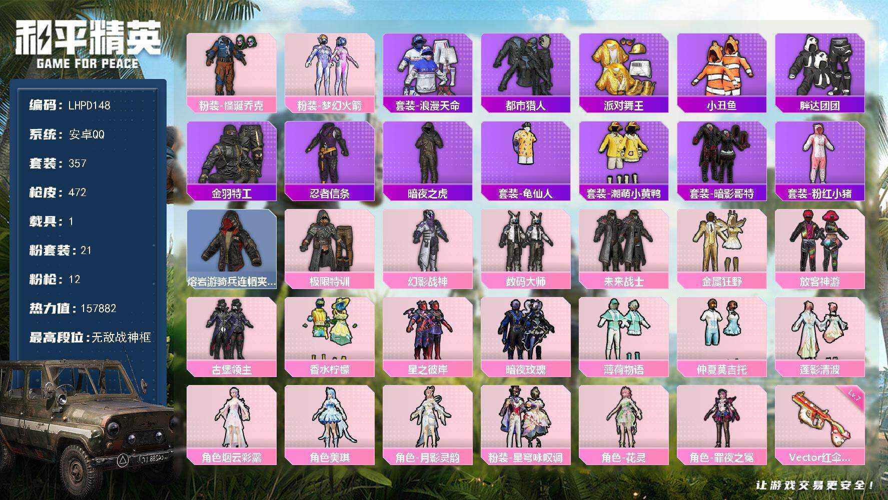 [15946777]安卓 手Q-无敌战神框-21粉装-12特效枪-1载具-4粉色飞行器-157882热力值-25王牌印记-357套装-472枪皮【热门品类】:粉装-怪诞乔克,粉装-梦幻火箭,套装-浪漫天命,套装-都市猎人,套装-派对舞王,套装-小丑鱼,套装-胖达团团,套装-金羽特工,套装-忍者信条,套装-暗夜之虎,套装-龟仙人,套装-潮萌小黄鸭,套装-暗影哥特,套装-粉红小猪,熔岩游骑兵连帽夹克【粉色套装】:粉装-极限特训,粉装-幻影战神,粉装-数码大师,粉装-未来战士,粉装-怪诞乔克,粉装-梦幻火箭,粉装-金属狂野,粉装-放客神游,粉装-古堡领主,粉装-香水柠檬,粉装-星之彼岸,粉装-暗夜玫瑰,粉装-薄荷物语,粉装-仲夏莫吉托,粉装-莲影清波,角色-烟云彩露,角色-美琪,角色-月影灵韵,粉装-星穹咏叹调,角色-花灵,角色-罪夜之冕【粉色枪皮等级】:AKM-炫紫旋律(七级),SCAR-L-锦绣绵绵(五级),M416-心之恋语(七级),GROZA-巴啦啦小魔仙(七级),AUG-星之彼岸(五级),AUG-暖羊咩咩(五级),Vector-红伞翩翩(七级),AKS-74U-森灵之息(五级),Kar98K-巳巳如意(五级),Mk14-甜梦熊击(五级),DP-28-豹影疾电(五级),破片手榴弹-瓶中星球(七级)【粉色载具】:焰龙咆哮【粉色枪皮】:AKM-炫紫旋律,SCAR-L-锦绣绵绵,M416-心之恋语,GROZA-巴啦啦小魔仙,AUG-星之彼岸,AUG-暖羊咩咩,Vector-红伞翩翩,AKS-74U-森灵之息,Kar98K-巳巳如意,Mk14-甜梦熊击,DP-28-豹影疾电,破片手榴弹-瓶中星球【粉色飞行器】:万象金身飞行器