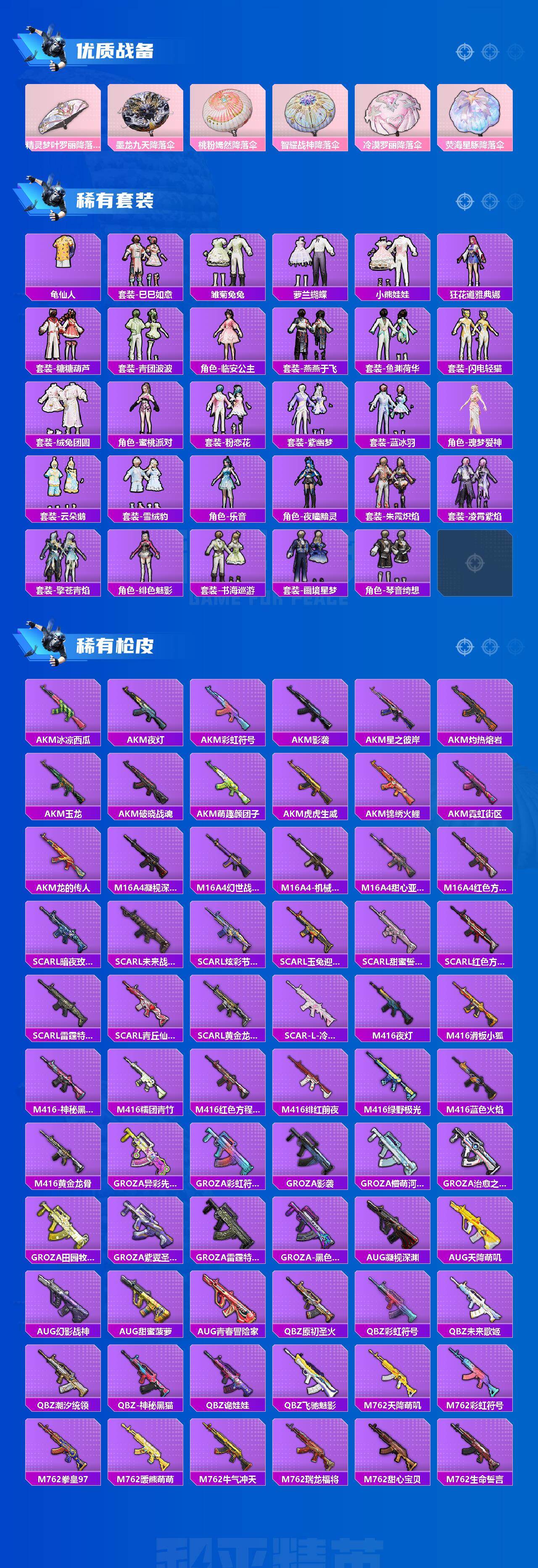 - [16138766]【特价出售/店主推荐】安卓 手Q-2粉装-8特效枪-0载具-1粉色飞行器-38360热力值-8王牌印记-79套装-129枪皮【热门品类】:套装-浪漫天命,套装-深海小丑鱼,套装-动感兔斯基人偶服,套装-龟仙人,套装-红红火火,角色-8号机【粉色套装】:粉装-未来歌姬,角色-萨利娅【粉色枪皮等级】:AKM-绿萝繁花(五级),SCAR-L-锦绣绵绵(五级),AUG-暖羊咩咩(五级),UMP45-量子极限(五级),Kar98K-巳巳如意(五级),MK12-雪月幻音(五级),DP-28-豹影疾电(五级),MG3-突变脉冲(五级)【粉色枪皮】:AKM-绿萝繁花,SCAR-L-锦绣绵绵,AUG-暖羊咩咩,UMP45-量子极限,Kar98K-巳巳如意,MK12-雪月幻音,DP-28-豹影疾电,MG3-突变脉冲