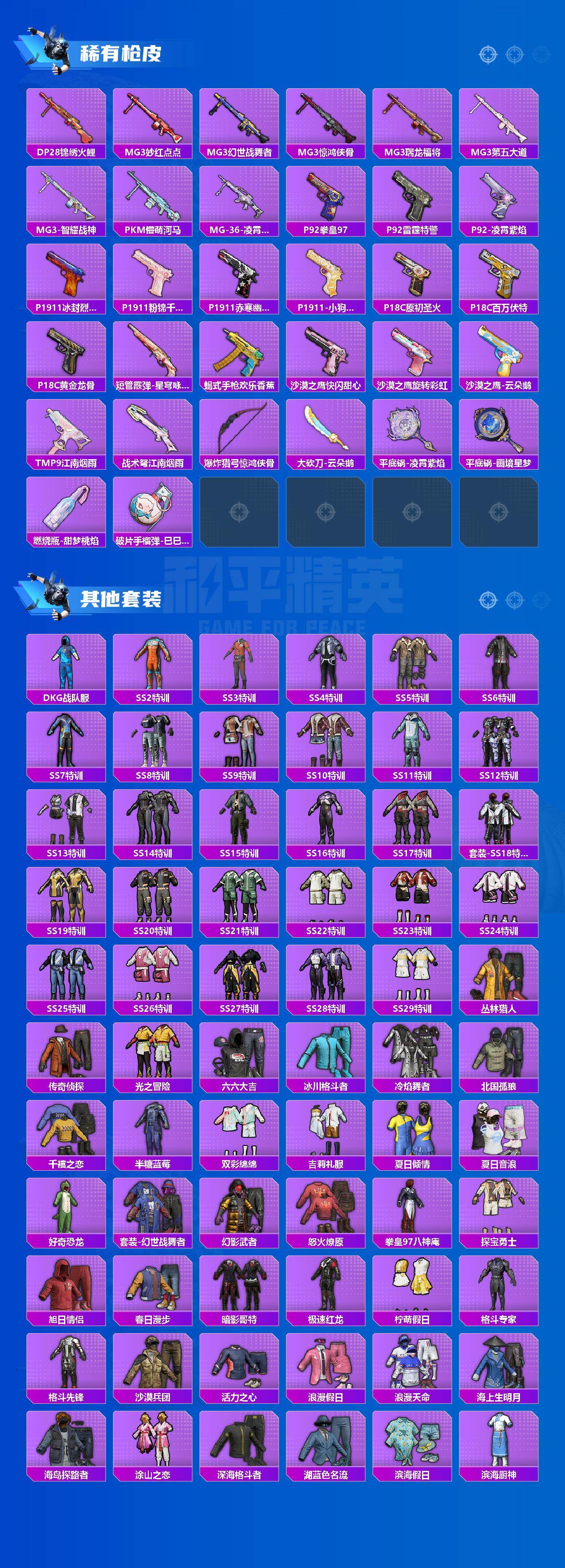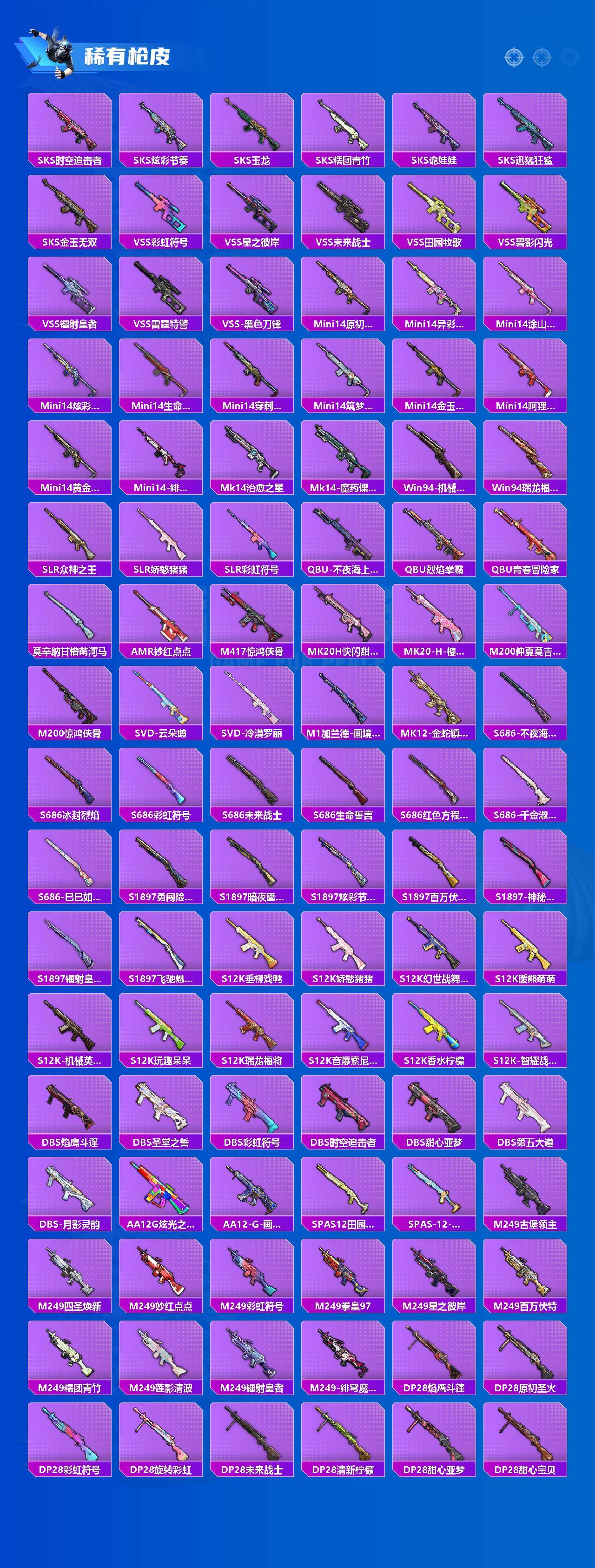 M416-黄金龙骨,M762-瑞龙福将,Kar98K-古堡领主,Kar98K-深海曼妙,Kar98K-终极赛罗,AWM-黄金龙骨,M249-古堡领主