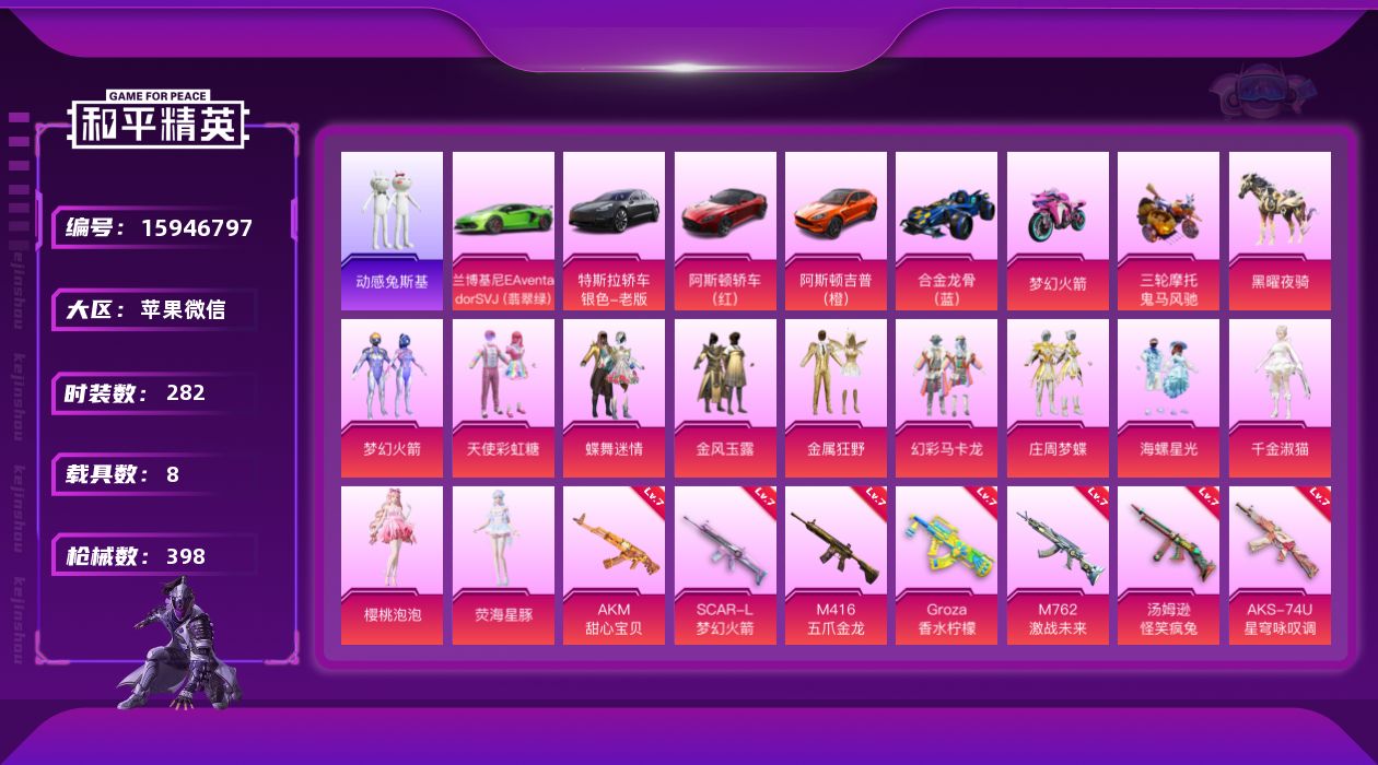 [15946797]【特价出售/店主推荐】苹果 微信-11粉装-11特效枪-8载具-7粉色飞行器-142064热力值-32王牌印记-282套装-398枪皮【热门品类】:粉装-梦幻火箭,套装-动感兔斯基人偶服,套装-龟仙人,套装-潮萌小黄鸭,套装-浪漫波比,套装-粉红小猪【粉色套装】:粉装-天使彩虹糖,粉装-蝶舞迷情,粉装-梦幻火箭,粉装-金风玉露,粉装-金属狂野,粉装-幻彩马卡龙,粉装-庄周梦蝶,粉装-海螺星光,角色-千金淑猫,角色-樱桃泡泡,角色-荧海星豚【粉色枪皮等级】:AKM-甜心宝贝(七级),AKM-炫紫旋律(四级),SCAR-L-梦幻火箭(七级),M416-五爪金龙(七级),GROZA-香水柠檬(七级),M762-激战未来(七级),汤姆逊-怪笑疯兔(七级),AKS-74U-星穹咏叹调(七级),Kar98K-巳巳如意(五级),Mk14-樱桃泡泡(七级),DP-28-豹影疾电(五级)【粉色载具】:特斯拉Model 3(冷光银),兰博基尼Aventador SVJ(翡翠绿),阿斯顿马丁DBS(红),阿斯顿马丁DBX(橙),合金龙骨(蓝),双人摩托-梦幻火箭,鬼马风驰,黑曜夜骑【粉色枪皮】:AKM-甜心宝贝,AKM-炫紫旋律,SCAR-L-梦幻火箭,M416-五爪金龙,GROZA-香水柠檬,M762-激战未来,汤姆逊-怪笑疯兔,AKS-74U-星穹咏叹调,Kar98K-巳巳如意,Mk14-樱桃泡泡,DP-28-豹影疾电【粉色飞行器】:梦幻火箭飞行器,炫紫旋律飞行器,庄周梦蝶飞行器,飞天猪飞行器,极意拳锋飞行器,暮色之舞飞行器