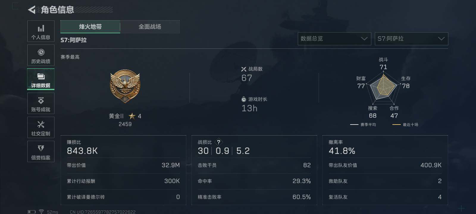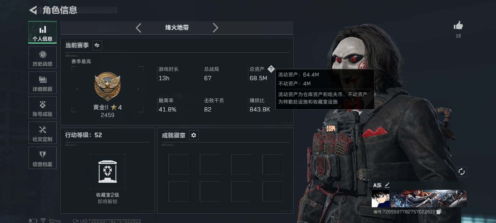 [15947927]68m总资产-3428k哈伏币-52烽火等级-黄金-1战场等级-无军衔