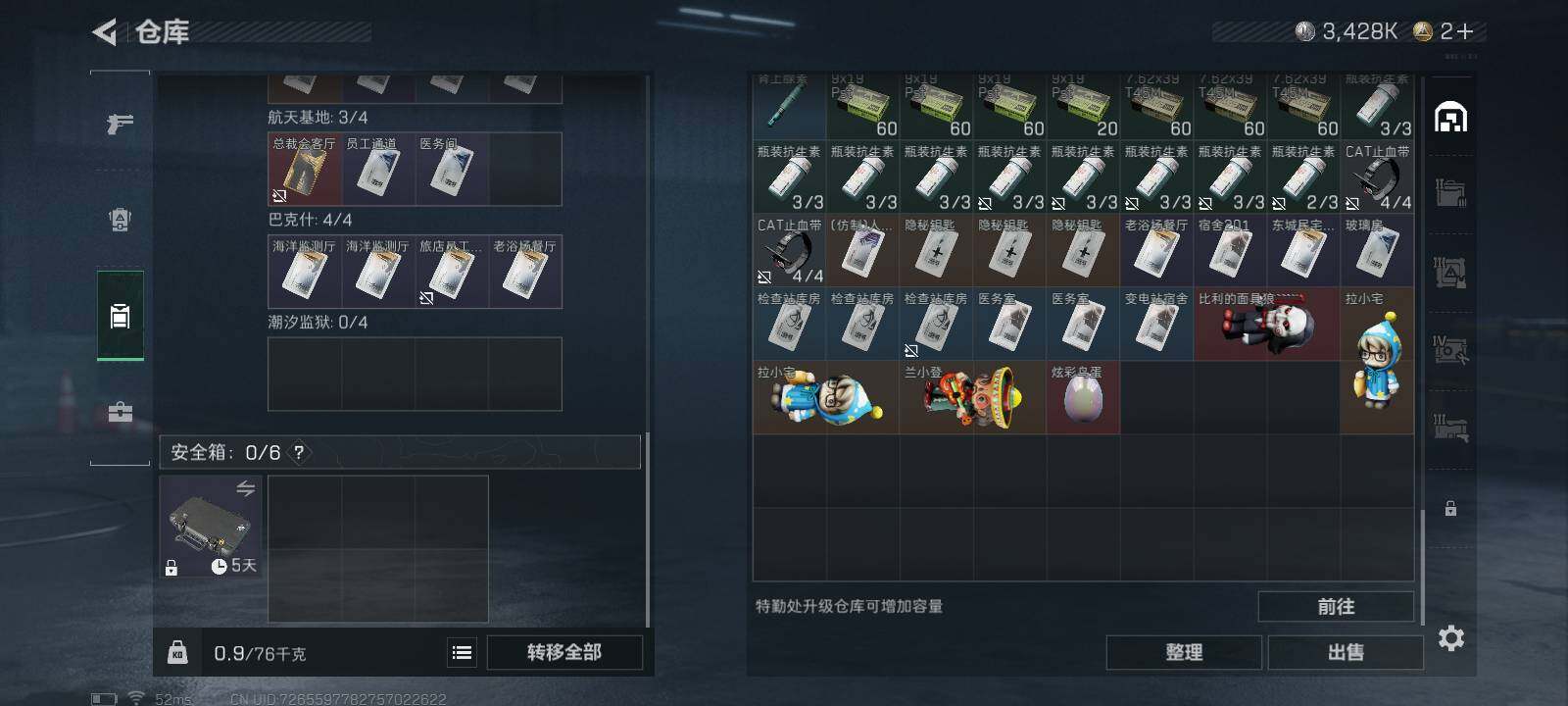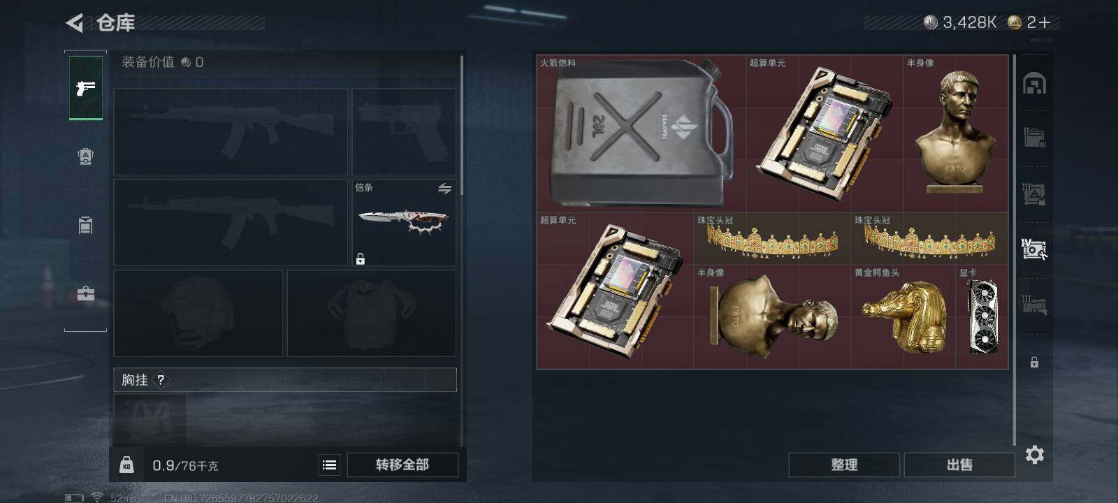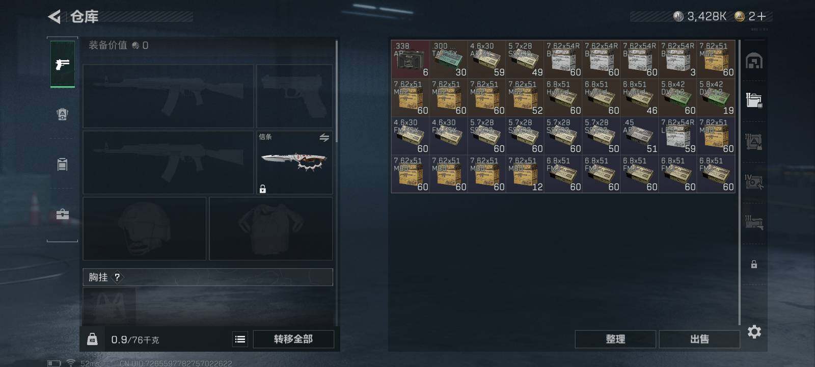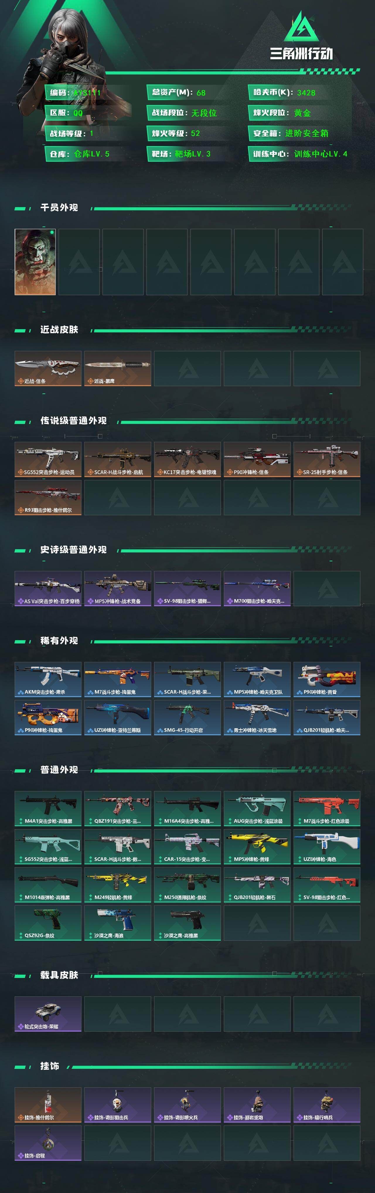 [15947927]68m总资产-3428k哈伏币-52烽火等级-黄金-1战场等级-无军衔 【干员外观】:红狼-电锯惊魂 【近战皮肤】:近战-信条,近战-黑鹰 【传说外观】:SG552突击步枪-运动员,SCAR-H战斗步枪-启航,KC17突击步枪-电锯惊魂,P90冲锋枪-信条,SR-25射手步枪-信条,R93狙击步枪-维什戴尔 【史诗外观】:AS Val突击步枪-百步穿杨,MP5冲锋枪-战术竞备,SV-98狙击步枪-猎鳄行动,M700狙击步枪-哈夫克警备 【稀有外观】:AKM突击步枪-肃杀,M7战斗步枪-捣蛋鬼,SCAR-H战斗步枪-荣耀列队,MP5冲锋枪-哈夫克卫队,P90冲锋枪-黄昏,P90冲锋枪-捣蛋鬼,UZI冲锋枪-亚特兰蒂斯,SMG-45-行动开启,勇士冲锋枪-冰天雪地,QJB201轻机枪-哈夫克卫队 【普通外观】:M4A1突击步枪-高雅黑,QBZ191突击步枪-三角洲力量,M16A4突击步枪-高雅黑,AUG突击步枪-浅蓝涂装,M7战斗步枪-红色涂装,SG552突击步枪-浅蓝涂装,SCAR-H战斗步枪-数码迷彩,CAR-15突击步枪-变色龙,MP5冲锋枪-黄蜂,UZI冲锋枪-海色,M1014霰弹枪-高雅黑,M249轻机枪-黄蜂,M250通用机枪-条纹,QJB201轻机枪-磐石,SV-98狙击步枪-红色涂装,QSZ92G-条纹,沙漠之鹰-海浪,沙漠之鹰-高雅黑 【载具外观】:轮式突击炮-荣耀 【挂饰】:挂饰-维什戴尔,挂饰-诡影狙击兵*2,挂饰-诡影喷火兵,挂饰-崩岩重炮*4,挂饰-暗行哨兵*3,挂饰-启程