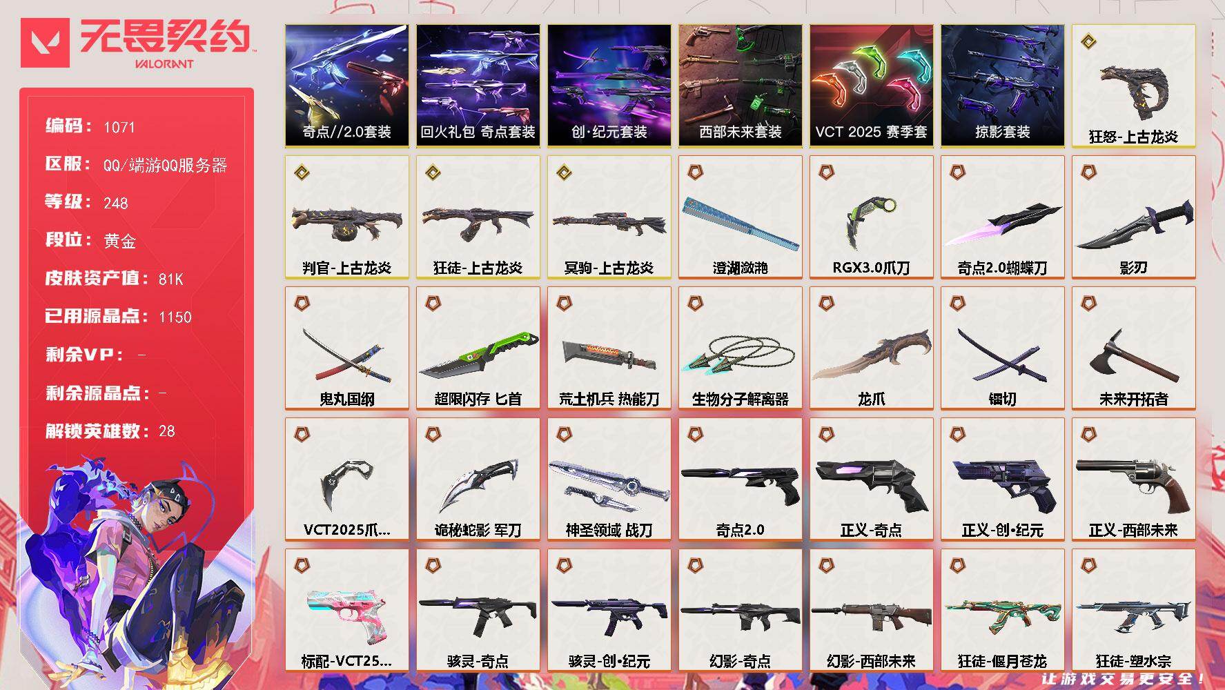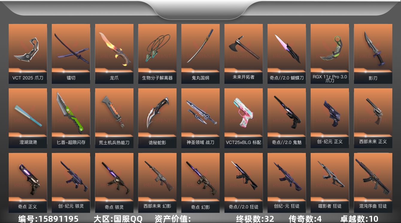 [15891195]【套装】:上古龙炎套装,VCT 2025 赛季套装,西部未来套装,创·纪元套装,奇点//2.0套装,回火礼包:奇点套装,掠影套装 【英雄】:幻棱,炼狱,维斯,暮蝶,钛狐,壹决,铁臂,捷风,雷兹,幽影,不死鸟,贤者,猎枭,蝰蛇,零,芮娜,奇乐,尚勃勒,霓虹,斯凯,夜露,星礈,K/O,海神,盖可,黑梦,钢锁 【近战武器】:近战武器-奇点//2.0 蝴蝶刀,近战武器-VCT 2025 爪刀,近战武器-RGX 11z Pro//3.0 爪刀,近战武器-镭切,近战武器-澄湖潋滟,近战武器-鬼丸国纲,近战武器-未来开拓者,近战武器-龙爪,近战武器-超限闪存 匕首,近战武器-荒土机兵 热能刀,近战武器-生物分子解离器,近战武器-影刃,近战武器-诡秘蛇影 军刀,近战武器-神圣领域 战刀 【狂徒】:狂徒-上古龙炎,狂徒-混沌序曲,狂徒-奇点//2.0,狂徒-塑水宗,狂徒-偃月苍龙,狂徒-创·纪元,狂徒-噬影者,狂徒-堕天遗武,狂徒-掠影,狂徒-盖亚的复仇,狂徒-紫阙金琅,狂徒-荒土机兵,狂徒-诡秘蛇影 【幻影】:幻影-奇点,幻影-西部未来,幻影-离子武器,幻影-超限闪存,幻影-神圣领域,幻影-纳米打击,幻影-末日之翼,幻影-西部未来 【戍卫】:戍卫-掠影,戍卫-浮光跃金,戍卫-逆冲蛮牛,戍卫-月球哨兵,戍卫-折光棱晶 【獠犬】:獠犬-神圣领域,獠犬-模拟赫兹,獠犬-逆冲蛮牛 【冥驹】:冥驹-上古龙炎,冥驹-掠影,冥驹-荒土机兵,冥驹-模拟赫兹,冥驹-星云暗涌 【飞将】:飞将-西部未来,飞将-末日之翼 【莽侠】:莽侠-创·纪元,莽侠-超限闪存,莽侠-诡秘蛇影,莽侠-月球哨兵 【战神】:战神-神圣领域,战神-浮光跃金 【奥丁】:奥丁-西部未来,奥丁-纳米打击,奥丁-末日之翼 【判官】:判官-上古龙炎,判官-诡秘蛇影,判官-纳米打击x 【雄鹿】:雄鹿-模拟赫兹,雄鹿-逆冲蛮牛,雄鹿-月球哨兵 【骇灵】:骇灵-奇点,骇灵-创·纪元,骇灵-荒土机兵,骇灵-浮光跃金,骇灵-星云暗涌 【蜂刺】:蜂刺-超限闪存,蜂刺-星云暗涌,蜂刺-折光棱晶 【标配】:标配-荒土机兵,标配-浮光跃金,标配-折光棱晶 【VCT手枪】:标配-VCT25 x BLG 【正义】:正义-奇点,正义-创·纪元,正义-西部未来,正义-掠影,正义-奇幻朋克//2.0,正义-超限闪存,正义-纳米打击,正义-月球哨兵 【鬼魅】:鬼魅