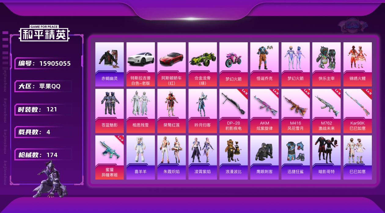 - PX_2052144- 苹果手Q-13王牌印记-6粉装-6特效枪-0载具-71309热力值-192套装-221枪皮-1卓越印记-0传奇印记 【6粉装】,飓风飞鹰,炫光之旅,寒光使者,莲影清波,金域紫灵,绚金战神 【6特效枪】AKM-绿萝繁花-5级 SCAR-L-锦绣绵绵-5级 M416-五爪金龙-7级 Kar98K-巳巳如意-5级 Mk14-甜梦熊击-5级 UMP45-量子极限-5级 【5稀有紫