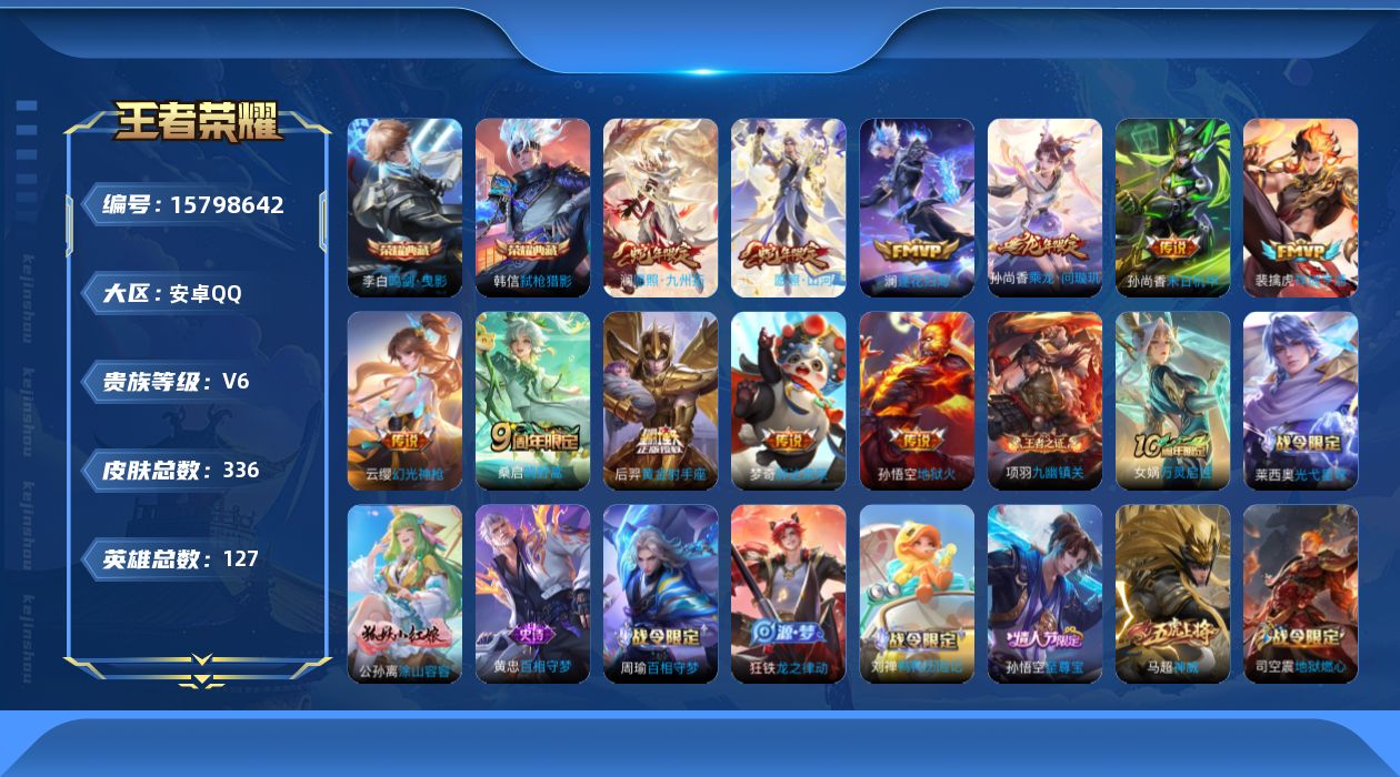 [15798642]安卓Q-V6-永恒钻石I段位-127英雄-336皮肤-2典藏皮肤-12传说-93史诗
