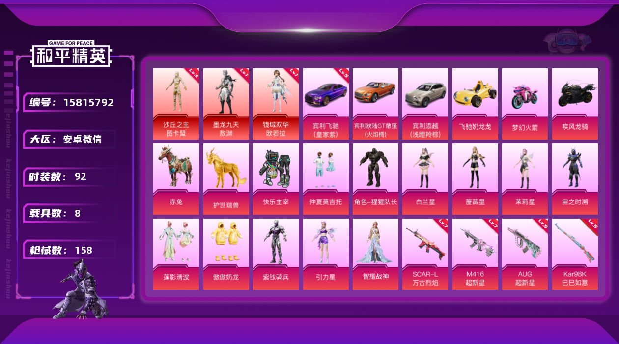 [15815792]送手机!带王者V10!392皮肤!差8个材料满级宾利!看图!安卓 微信-3神装-12粉装-15特效枪-8载具-7粉色飞行器-79632热力值-8王牌印记-92套装-158枪皮 【红色载具】:宾利飞驰(皇家紫)(五级) 【红色神装等级】:墨龙九天-敖渊(一级),镜域双华-欧若拉(一级),沙丘之主-图卡盟(三级) 【红色角色神装】:墨龙九天-敖渊,镜域双华-欧若拉,沙丘之主-图卡盟 【热门品类】:角色-忠猛周仓,套装-六号树人,套装-龟仙人,大砍刀-青龙偃月刀 【粉色套装】:粉装-快乐主宰,粉装-仲夏莫吉托,角色-猩猩队长,角色-白兰星,角色-蔷薇星,角色-茉莉星,角色-宙之时溯,粉装-莲影清波,粉装-傲傲奶龙,角色-紫钛骑兵,角色-引力星,角色-智耀战神 【粉色枪皮等级】:SCAR-L-梦幻火箭(三级),SCAR-L-万古烈焰(七级),SCAR-L-金蛇镇世(一级),M416-超新星(七级),M416-墨龙九天(一级),AUG-超新星(五级),P90-沙丘之主(三级),Kar98K-巳巳如意(五级),M24-镜域双华(三级),DP-28-豹影疾电(一级),MG3-酷泡奶龙(二级),PKM-江南烟雨(一级) 【粉色载具】:宾利欧陆GT敞篷(火焰橘),宾利飞驰(皇家紫),宾利添越(浅瞪羚棕),飞驰奶龙龙,双人摩托-梦幻火箭,疾风龙骑,僚机-萌酷奶龙,赤兔,护世瑞兽 【粉色枪皮】:SCAR-L-梦幻火箭,SCAR-L-万古烈焰,SCAR-L-金蛇镇世,M416-超新星,M416-墨龙九天,AUG-超新星,P90-沙丘之主,Kar98K-巳巳如意,M24-镜域双华,Mk14-闲梦青缨,DP-28-豹影疾电,MG3-酷泡奶龙,PKM-江南烟雨,烟雾弹-猫咪绅士,破片手榴弹-粉粉猫爪 【粉色飞行器】:梦幻火箭飞行器,超新星飞行器,沙丘之主天马,镜域双华-灵镜之阶,龙翔九天飞行器,幻海精灵飞行器 【粉色降落伞】:快乐主宰降落伞,梦幻火箭降落伞,暗夜玫瑰降落伞,天星战神降落伞,拂晓神骑降落伞,超新星降落伞,万古烈焰降落伞,莲影清波降落伞,龙行天下降落伞,萌酷奶龙降落伞,圣堂之誓降落伞,沙丘之主降落伞,镜域双华降落伞,墨龙九天降落伞,鬼刀降落伞,冷漠罗丽降落伞 【稀有套装】:套装-龟仙人,角色-风玲,角色-海琴烟,角色-幽秘之星,角色-灵公主 【稀有枪皮】:AKM-破晓战魂,AKM-