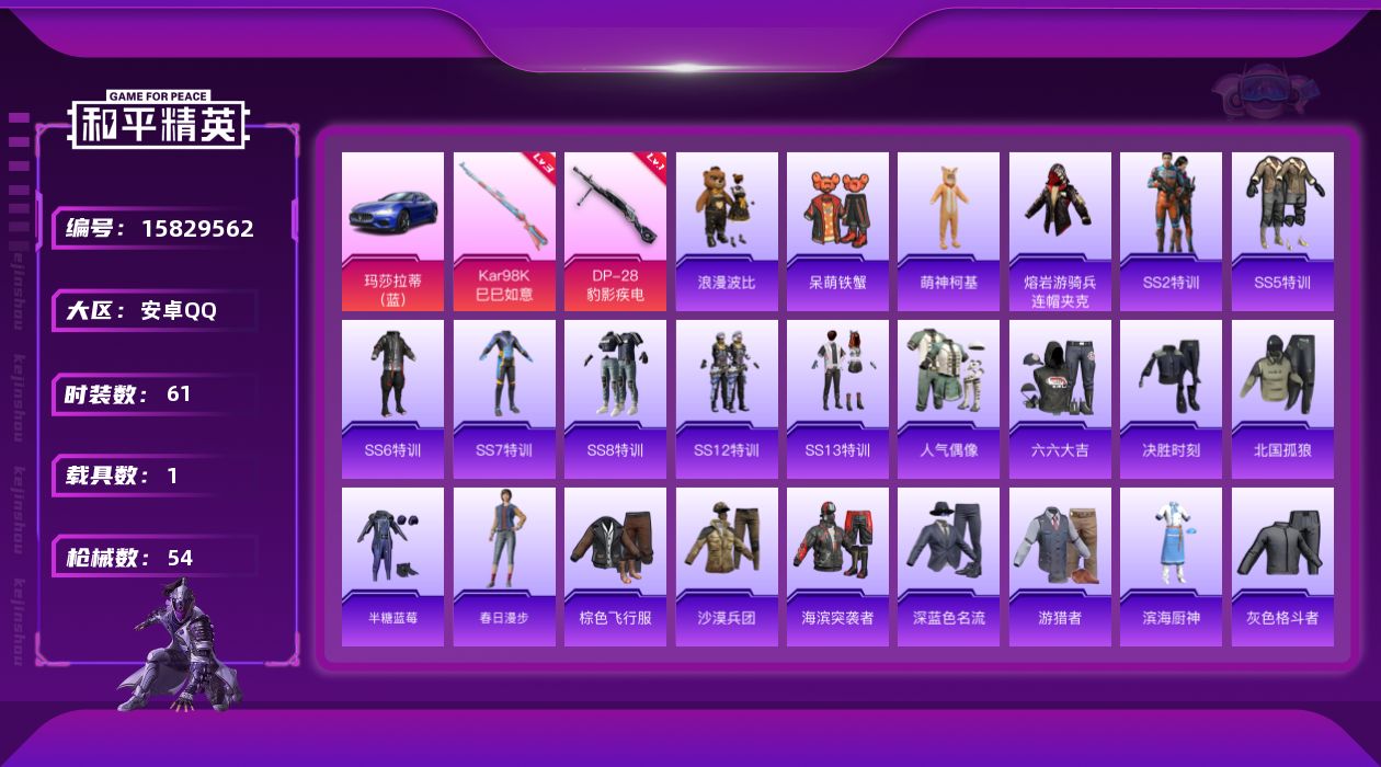 [15829562]【特价出售/店主推荐】安卓 手Q-0粉装-2特效枪-1载具-0粉色飞行器-16555热力值-2王牌印记-61套装-54枪皮 【热门品类】:套装-SS1特训,套装-浪漫波比,熔岩游骑兵连帽夹克 【粉色枪皮等级】:Kar98K-巳巳如意(三级),DP-28-豹影疾电(一级) 【粉色载具】:玛莎拉蒂Ghibli(蓝) 【粉色枪皮】:Kar98K-巳巳如意,DP-28-豹影疾电 【粉色降落伞】:天启纪元降落伞 【稀有枪皮】:AKM-冰凉西瓜,M16A4-凝视深渊,M16A4-生命誓言,M16A4-蓝色火焰,SCAR-L-炫彩节奏,SCAR-L-生命誓言,SCAR-L-红色方程式,SCAR-L-黄金龙骨,M416-红色方程式,M416-蓝色火焰,G36C-星穹咏叹调,UZI-天降萌叽,UZI-生命誓言,UZI-金风玉露,UMP45-夜灯,汤姆逊-勇闯险境,汤姆逊-幻影战神,P90-巳巳如意,Kar98K-勇闯险境,Kar98K-红色方程式,M24-冰封烈焰,SKS-勇闯险境,SKS-玉龙,Mini14-生命誓言,S686-冰封烈焰,S1897-勇闯险境,M249-破晓战魂,DP-28-彩虹符号,DP-28-清新柠檬,P92-雷霆特警,P1911-冰封烈焰,P18C-黄金龙骨,蝎式手枪-欢乐香蕉 【其他套装】:套装-SS2特训,套装-SS5特训,套装-SS6特训,套装-SS7特训,套装-SS8特训,套装-SS12特训,套装-SS13特训,套装-人气偶像,套装-六六大吉,套装-决胜时刻,套装-北国孤狼,套装-半糖蓝莓,套装-春日漫步,套装-棕色飞行服,套装-沙漠兵团,套装-海滨突袭者,套装-深蓝色名流,套装-游猎者,套装-滨海厨神,套装-灰色格斗者,套装-燃烧卡路里,套装-猛禽,套装-甜蜜告白,套装-疯狂小兔子,套装-登山爱好者,套装-破晓情侣,套装-竞技勇士朋克,套装-绯格组合,套装-荣耀,套装-蓝色运动,套装-跃动心情,套装-迎春赐吉,套装-霓虹街区,套装-黄色伏地魔,套装-黄色名流,套装-黑色伏地魔,套装-特战英豪,套装-刚毅裁决者,套装-苍穹猎鹰,套装-沙漠毒蛇,套装-漫步者,套装-甜蜜菠萝,套装-战地菁英,套装-派对绅士,套装-极地朋克,套装-午夜朋克,套装-呆萌铁蟹,套装-幻影公爵,套装-夜莺强袭者,套装-坚韧舞者,套装-凛冬战士,套装-雪山精英,套装-雪山征服者,