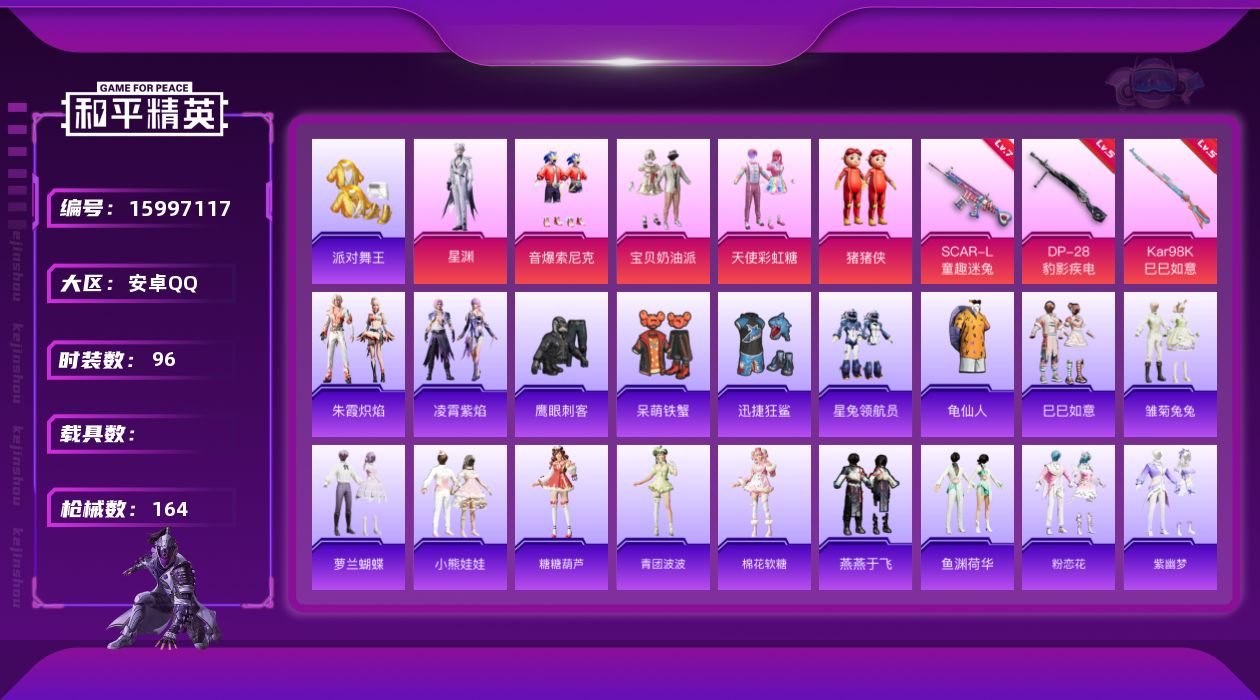 [15997117]安卓 手Q-5粉装-3特效枪-0载具-1粉色飞行器-48257热力值-6王牌印记-96套装-164枪皮 【热门品类】:粉装-音爆索尼克,套装-派对舞王,套装-龟仙人 【粉色套装】:粉装-宝贝奶油派,粉装-天使彩虹糖,粉装-音爆索尼克,玩偶服-猪猪侠,角色-星渊 【粉色枪皮等级】:SCAR-L-童趣迷兔(七级),Kar98K-巳巳如意(五级),DP-28-豹影疾电(五级) 【粉色枪皮】:SCAR-L-童趣迷兔,Kar98K-巳巳如意,DP-28-豹影疾电 【粉色飞行器】:暖熊萌萌飞行器
