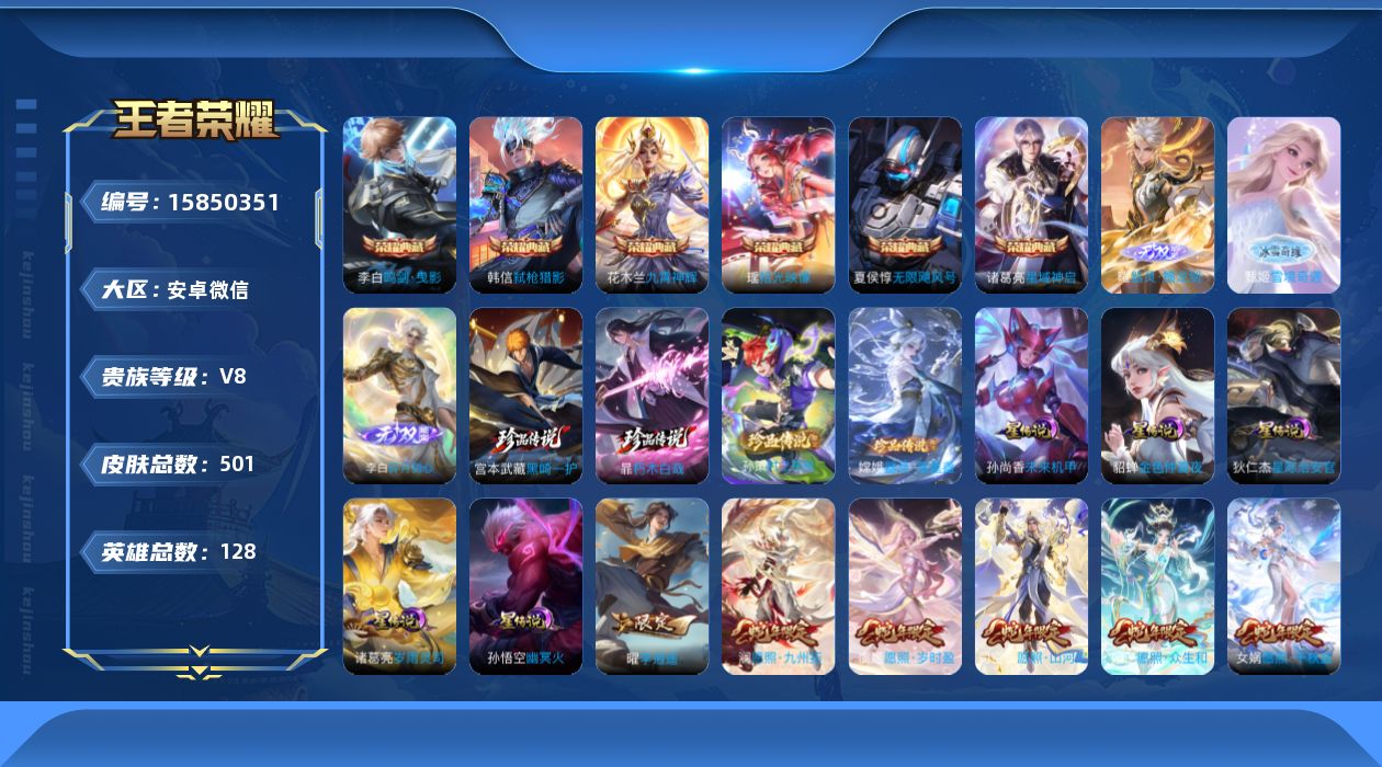[15850351]安卓WX-V9-至尊星耀II段位-128英雄-501皮肤-6典藏皮肤-1典藏英雄-3无双-4珍品传说-6星传说-53传说-163史诗-差17676到V10