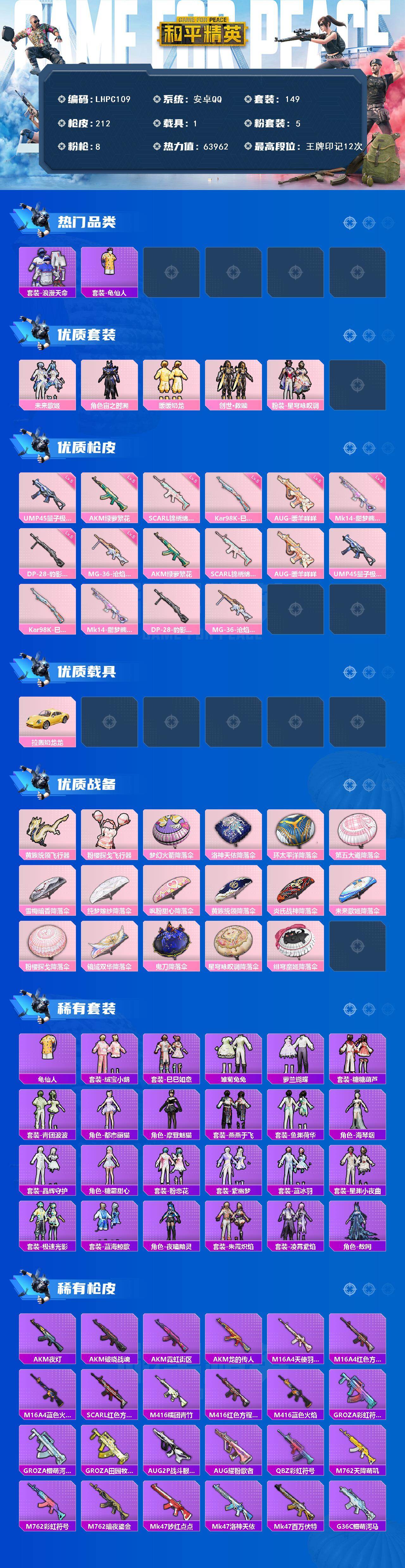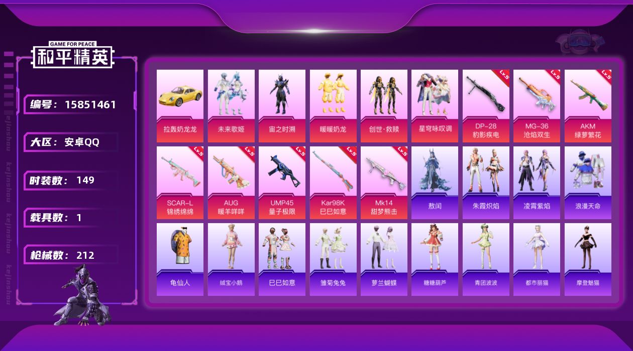 [15851461]安卓 手Q-5粉装-8特效枪-1载具-2粉色飞行器-63962热力值-12王牌印记-149套装-212枪皮 【热门品类】:套装-浪漫天命,套装-龟仙人 【粉色套装】:粉装-未来歌姬,角色-宙之时溯,粉装-暖暖奶龙,套装-创世·救赎,粉装-星穹咏叹调 【粉色枪皮等级】:AKM-绿萝繁花(五级),SCAR-L-锦绣绵绵(五级),AUG-暖羊咩咩(五级),UMP45-量子极限(五级),Kar98K-巳巳如意(五级),Mk14-甜梦熊击(五级),DP-28-豹影疾电(五级),MG-36-沧焰双生(五级) 【粉色载具】:拉轰奶龙龙 【粉色枪皮】:AKM-绿萝繁花,SCAR-L-锦绣绵绵,AUG-暖羊咩咩,UMP45-量子极限,Kar98K-巳巳如意,Mk14-甜梦熊击,DP-28-豹影疾电,MG-36-沧焰双生 【粉色飞行器】:黄族统领飞行器,粉樱探戈飞行器 【粉色降落伞】:梦幻火箭降落伞,洛神天依降落伞,环太平洋降落伞,第五大道降落伞,雪梅暗香降落伞,纯梦嫁纱降落伞,飒粉甜心降落伞,黄族统领降落伞,炎氏战神降落伞,未来歌姬降落伞,粉樱探戈降落伞,镜域双华降落伞,鬼刀降落伞,星穹咏叹调降落伞,绯穹魔姬降落伞 【稀有套装】:套装-龟仙人,套装-绒宝小鹅,套装-巳巳如意,套装-雏菊兔兔,套装-萝兰蝴蝶,套装-糖糖葫芦,套装-青团波波,角色-都市丽猫,角色-摩登魅猫,套装-燕燕于飞,套装-鱼渊荷华,角色-海琴烟,套装-晶辉守护,角色-糖霜甜心,套装-粉恋花,套装-紫幽梦,套装-蓝冰羽,套装-星渊小夜曲,套装-极速光影,套装-蓝海鲸歌,角色-夜瞳黯灵,套装-朱霞炽焰,套装-凌霄紫焰,角色-敖闰 【稀有枪皮】:AKM-夜灯,AKM-破晓战魂,AKM-霓虹街区,AKM-龙的传人,M16A4-天使羽翼,M16A4-红色方程式,M16A4-蓝色火焰,SCAR-L-红色方程式,M416-糯团青竹,M416-红色方程式,M416-蓝色火焰,GROZA-彩虹符号,GROZA-懵萌河马,GROZA-田园牧歌,AUG-2P战斗服款,AUG-耀粉歌者,QBZ-彩虹符号,M762-天降萌叽,M762-彩虹符号,M762-暗夜鎏金,Mk47-妙红点点,Mk47-洛神天依,Mk47-百万伏特,G36C-懵萌河马,G36C-星穹咏叹调,AC-VAL-天降萌叽,AC-VAL-快闪甜心,蜜獾-天降萌叽,蜜獾-娇憨