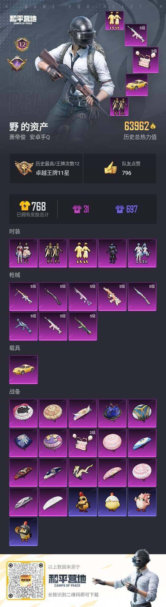 [15851461]安卓 手Q-5粉装-8特效枪-1载具-2粉色飞行器-63962热力值-12王牌印记-149套装-212枪皮
