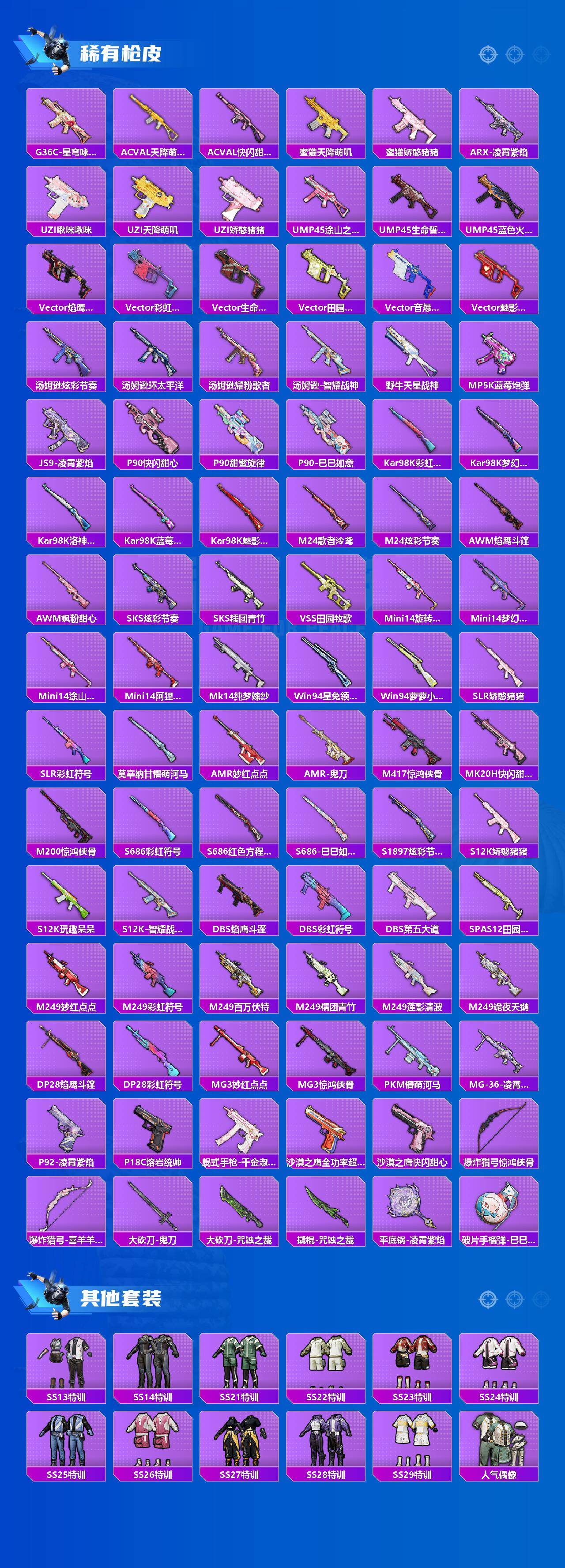【稀有枪皮】:AKM-夜灯,AKM-破晓战魂,AKM-霓虹街区,AKM-龙的传人,M16A4-天使羽翼,M16A4-红色方程式,M16A4-蓝色火焰,SCAR-L-红色方程式,M416-糯团青竹,M416-红色方程式,M416-蓝色火焰,GROZA-彩虹符号,GROZA-懵萌河马,GROZA-田园牧歌,AUG-2P战斗服款,AUG-耀粉歌者,QBZ-彩虹符号,M762-天降萌叽,M762-彩虹符号,M762-暗夜鎏金,Mk47-妙红点点,Mk47-洛神天依,Mk47-百万伏特,G36C-懵萌河马,G36C-星穹咏叹调,AC-VAL-天降萌叽,AC-VAL-快闪甜心,蜜獾-天降萌叽,蜜獾-娇憨
