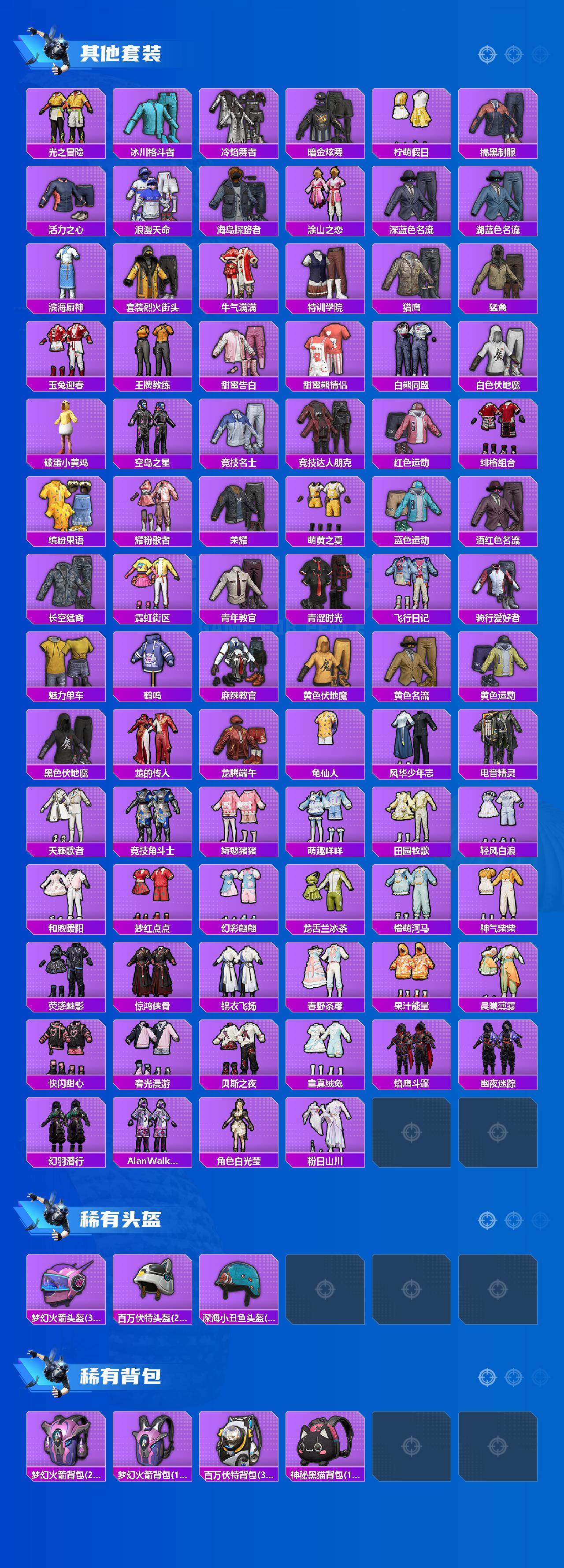 【稀有套装】:套装-龟仙人,套装-绒宝小鹅,套装-巳巳如意,套装-雏菊兔兔,套装-萝兰蝴蝶,套装-糖糖葫芦,套装-青团波波,角色-都市丽猫,角色-摩登魅猫,套装-燕燕于飞,套装-鱼渊荷华,角色-海琴烟,套装-晶辉守护,角色-糖霜甜心,套装-粉恋花,套装-紫幽梦,套装-蓝冰羽,套装-星渊小夜曲,套装-极速光影,套装-蓝海鲸歌,角色-夜瞳黯灵,套装-朱霞炽焰,套装-凌霄紫焰,角色-敖闰