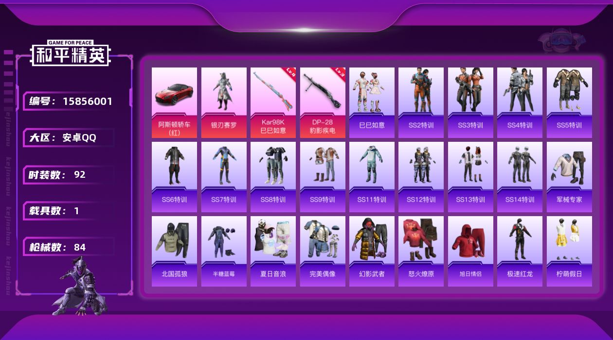 [15856001]【店主推荐捡漏号!可直接换绑】安卓 手Q-1粉装-2特效枪-1载具-1粉色飞行器-27524热力值-1王牌印记-92套装-84枪皮【热门品类】:套装-SS1特训【粉色套装】:粉装-银刃赛罗【粉色枪皮等级】:Kar98K-巳巳如意(四级),DP-28-豹影疾电(三级)【粉色载具】:阿斯顿马丁DBS(红)【粉色枪皮】:Kar98K-巳巳如意,DP-28-豹影疾电