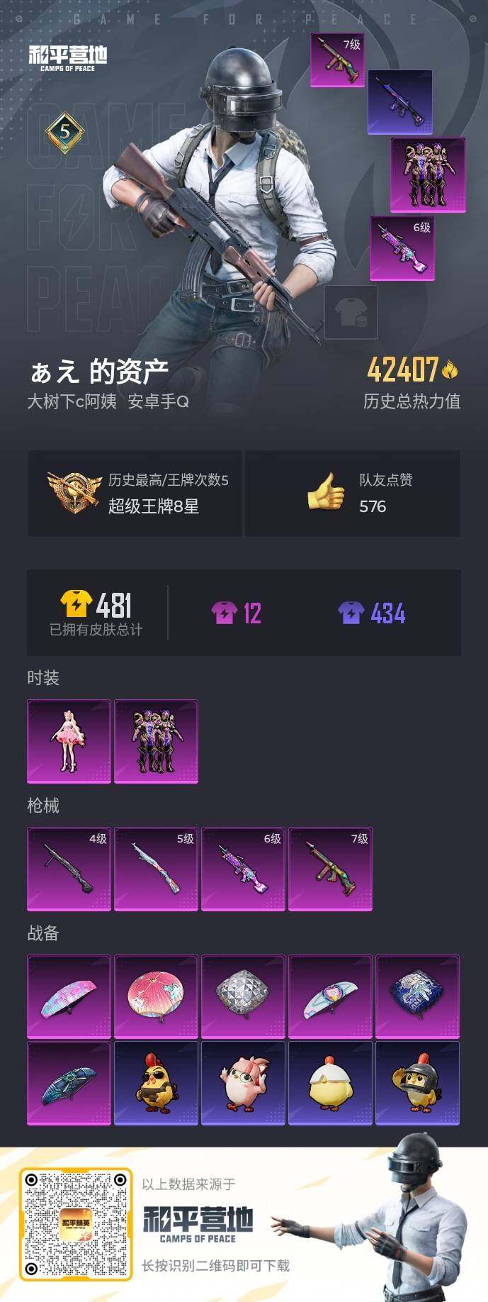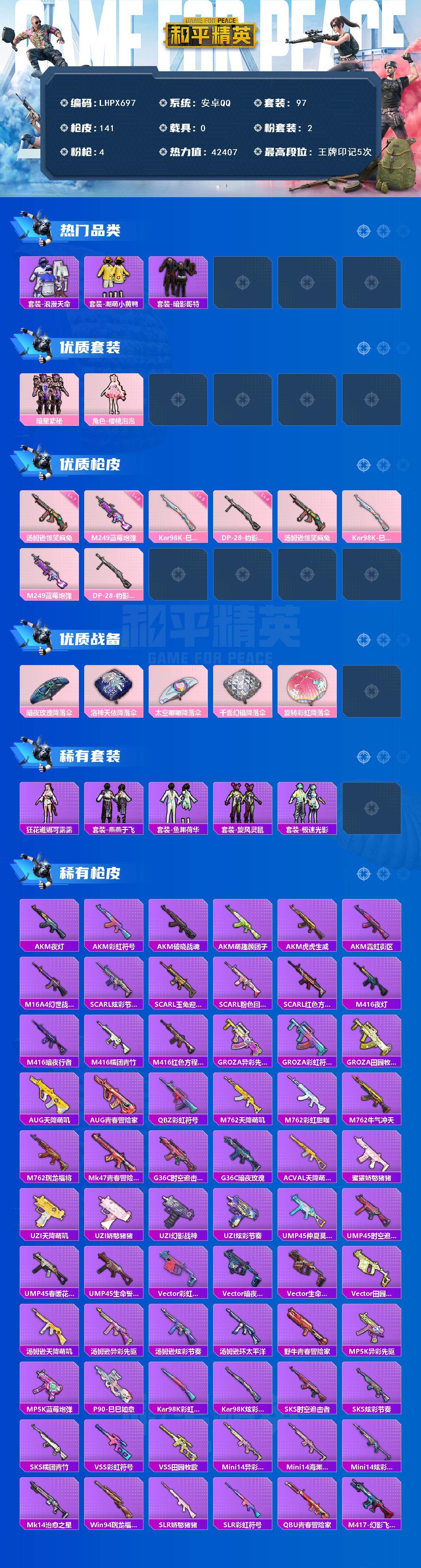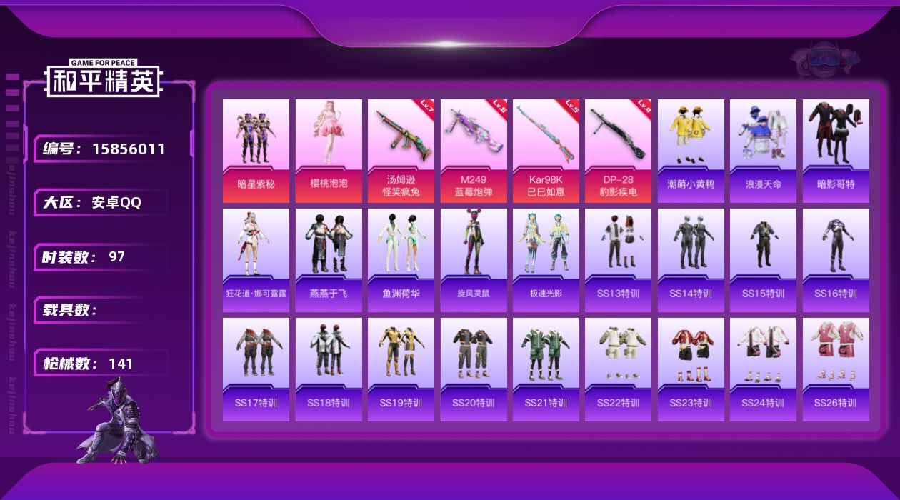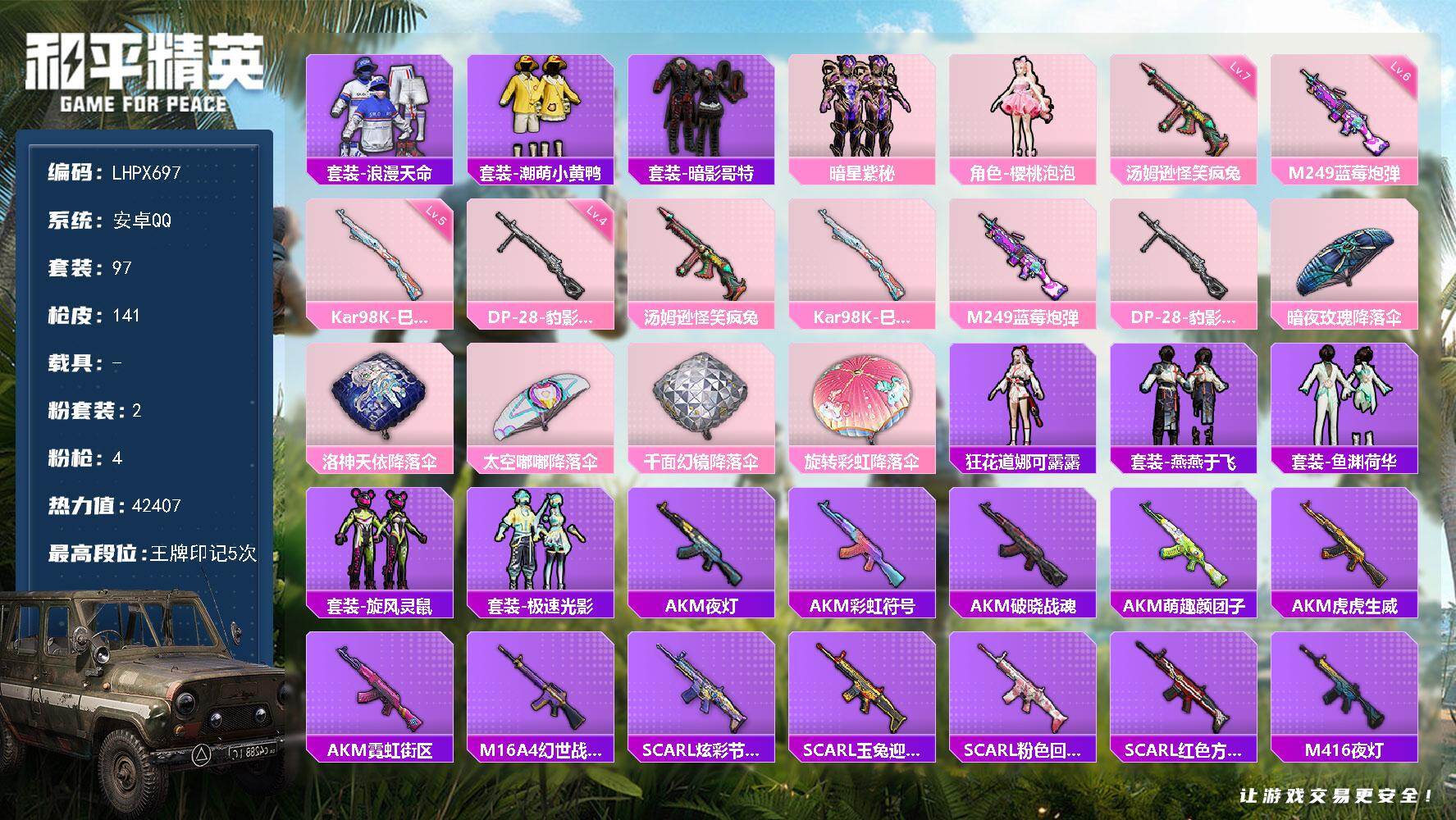[15856011]【店主推荐捡漏号!可直接换绑】安卓 手Q-2粉装-4特效枪-0载具-0粉色飞行器-42407热力值-5王牌印记-97套装-141枪皮【热门品类】:套装-浪漫天命,套装-潮萌小黄鸭,套装-暗影哥特【粉色套装】:粉装-暗星紫秘,角色-樱桃泡泡 【粉色枪皮等级】:汤姆逊-怪笑疯兔(七级),Kar98K-巳巳如意(五级),M249-蓝莓炮弹(六级),DP-28-豹影疾电(四级)【粉色枪皮】:汤姆逊-怪笑疯兔,Kar98K-巳巳如意,M249-蓝莓炮弹,DP-28-豹影疾电