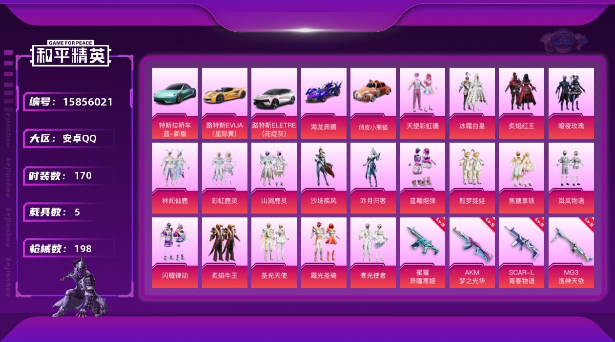 [15856021]【店主推荐捡漏号!可直接换绑】安卓 手Q-18粉装-5特效枪-5载具-5粉色飞行器-78248热力值-9王牌印记-170套装-198枪皮【热门品类】:套装-SS1特训,套装-龟仙人,套装-浪漫波比【粉色套装】:粉装-天使彩虹糖,粉装-冰霜白皇,粉装-炙焰红王,粉装-暗夜玫瑰,粉装-林间仙鹿,粉装-彩虹鹿灵,粉装-山涧鹿灵,粉装-沙场疾风,粉装-吟月归客,粉装-蓝莓炮弹,粉装-酣梦娃娃,粉装-焦糖拿铁,粉装-岚岚物语,粉装-闪耀律动,粉装-炙焰牛王,粉装-圣光天使,粉装-霞光圣骑,粉装-寒光使者【粉色枪皮等级】:AKM-梦之光华(五级),SCAR-L-青春物语(五级),蜜獾-异瞳寒姬(五级),DP-28-幻梦音符(四级),MG3-洛神天依(五级)【粉色载具】:特斯拉Roadster(水滴蓝),路特斯EVIJA(星际黄),路特斯ELETRE(花绽灰),海龙奔腾,俏皮小熊猫【粉色枪皮】:AKM-梦之光华,SCAR-L-青春物语,蜜獾-异瞳寒姬,DP-28-幻梦音符,MG3-洛神天依【粉色飞行器】:梦幻火箭飞行器,童趣迷兔飞行器,绮梦青鸾飞行器,林间仙鹿飞行器