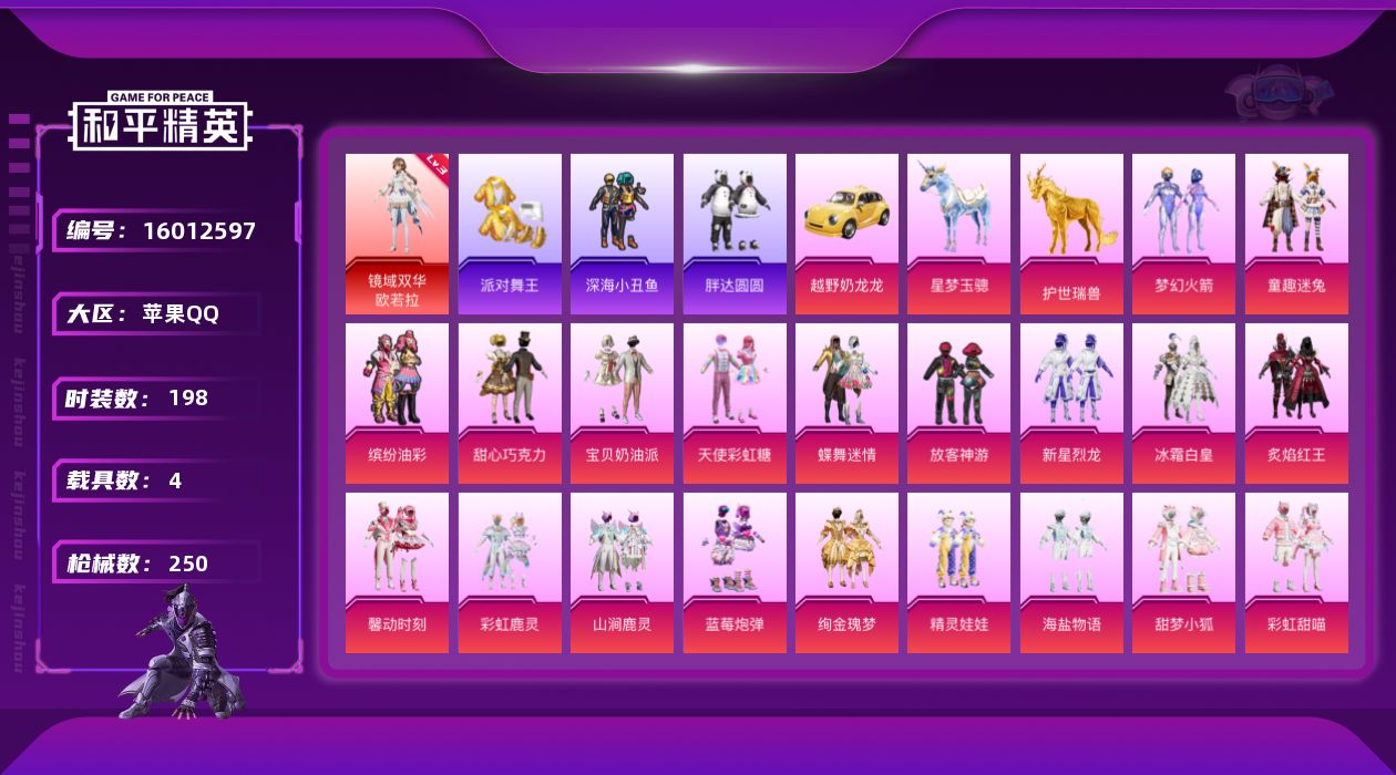 [16012597]【特价出售/店主推荐】苹果 手Q-1神装-30粉装-12特效枪-4载具-14粉色飞行器-103583热力值-16王牌印记-198套装-250枪皮【红色神装等级】:镜域双华-欧若拉(三级)【红色角色神装】:镜域双华-欧若拉【热门品类】:粉装-梦幻火箭,粉装-童趣迷兔,粉装-缤纷油彩,套装-浪漫天命,套装-派对舞王,套装-深海小丑鱼,套装-小丑鱼,套装-胖达圆圆,套装-龟仙人,套装-暗影哥特,套装-糯粉咩咩,套装-软软马卡龙,角色-Mark.06,套装-红熊茄茄【粉色套装】:粉装-甜心巧克力,粉装-宝贝奶油派,粉装-天使彩虹糖,粉装-蝶舞迷情,粉装-梦幻火箭,粉装-缤纷油彩,粉装-放客神游,粉装-新星烈龙,粉装-冰霜白皇,粉装-童趣迷兔,粉装-炙焰红王,粉装-馨动时刻,粉装-彩虹鹿灵,粉装-山涧鹿灵,粉装-蓝莓炮弹,粉装-绚金瑰梦,粉装-精灵娃娃,粉装-海盐物语,粉装-甜梦小狐,粉装-彩虹甜喵,粉装-冰川幽秘,粉装-寒光使者,粉装-第五大道,角色-白勺歌姬,角色-圣堂之誓,角色-千金淑猫,粉装-桃粉嫣然,粉装-星月云朵,角色-荧海星豚【粉色枪皮等级】:AKM-甜心宝贝(五级),SCAR-L-童趣迷兔(五级),SCAR-L-锦绣绵绵(五级),M416-心之恋语(六级),M416-墨龙九天(三级),GROZA-精灵之光(三级),UMP45-雪国精灵(六级),Kar98K-巳巳如意(五级),M24-镜域双华(三级),M249-彩虹甜喵(三级),DP-28-千金淑猫(五级),DP-28-豹影疾电(五级)【粉色载具】:越野奶龙龙,僚机-萌兔起飞,星梦玉骢,护世瑞兽【粉色枪皮】:AKM-甜心宝贝,SCAR-L-童趣迷兔,SCAR-L-锦绣绵绵,M416-心之恋语,M416-墨龙九天,GROZA-精灵之光,UMP45-雪国精灵,Kar98K-巳巳如意,M24-镜域双华,M249-彩虹甜喵,DP-28-千金淑猫,DP-28-豹影疾电【粉色飞行器】:酣梦熊熊飞行器,春暖花开飞行器,镜光幻境飞行翼,沙丘之主天马,镜域双华-灵镜之阶,龙翔九天飞行器,深渊漩涡飞行器,曦光华影飞行器,万象金身飞行器,彩虹独角兽飞行器,圣域金龙飞行器,幻星舰长飞行器
