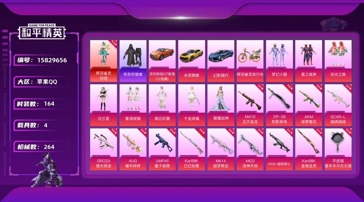 [15829656]苹果 手Q-1神装-8粉装-13特效枪-4载具-9粉色飞行器-85353热力值-17王牌印记-164套装-264枪皮【红色神装等级】:辉羽雀灵-初翊(二级)【红色角色神装】:辉羽雀灵-初翊【热门品类】:粉装-梦幻火箭,套装-浪漫天命,套装-奇异狩猎者,套装-龟仙人,套装-暗影哥特【粉色套装】:粉装-梦幻火箭,粉装-星之彼岸,粉装-炫光之旅,角色-白兰星,粉装-蜜语绒猫,角色-烟云彩露,角色-千金淑猫,角色-智耀战神【粉色枪皮等级】:AKM-绿萝繁花(五级),AKM-幽焰骑士(三级),SCAR-L-锦绣绵绵(五级),M416-五爪金龙(六级),GROZA-镜光银凌(五级),AUG-暖羊咩咩(五级),UMP45-量子极限(五级),Kar98K-巳巳如意(五级),Kar98K-圣域龙灵(三级),Mk14-甜梦熊击(五级),DP-28-豹影疾电(五级),MG3-洛神天依(四级),平底锅-喜羊羊与灰太狼(二级)【粉色载具】:宾利欧陆GT敞篷(火焰橘),永恒黄蜂,幻影随行,僚机-萌兔起飞,辉羽雀灵自行车【粉色枪皮】:AKM-绿萝繁花,AKM-幽焰骑士,SCAR-L-锦绣绵绵,M416-五爪金龙,GROZA-镜光银凌,AUG-暖羊咩咩,UMP45-量子极限,Kar98K-巳巳如意,Kar98K-圣域龙灵,Mk14-甜梦熊击,DP-28-豹影疾电,MG3-洛神天依,平底锅-喜羊羊与灰太狼【粉色飞行器】:梦幻火箭飞行器,镜域双华-灵镜之阶,绝色倾城飞行器,龙翔九天飞行器,深渊漩涡飞行器,万象金身飞行器,圣域金龙飞行器,雀灵庇佑飞行器
