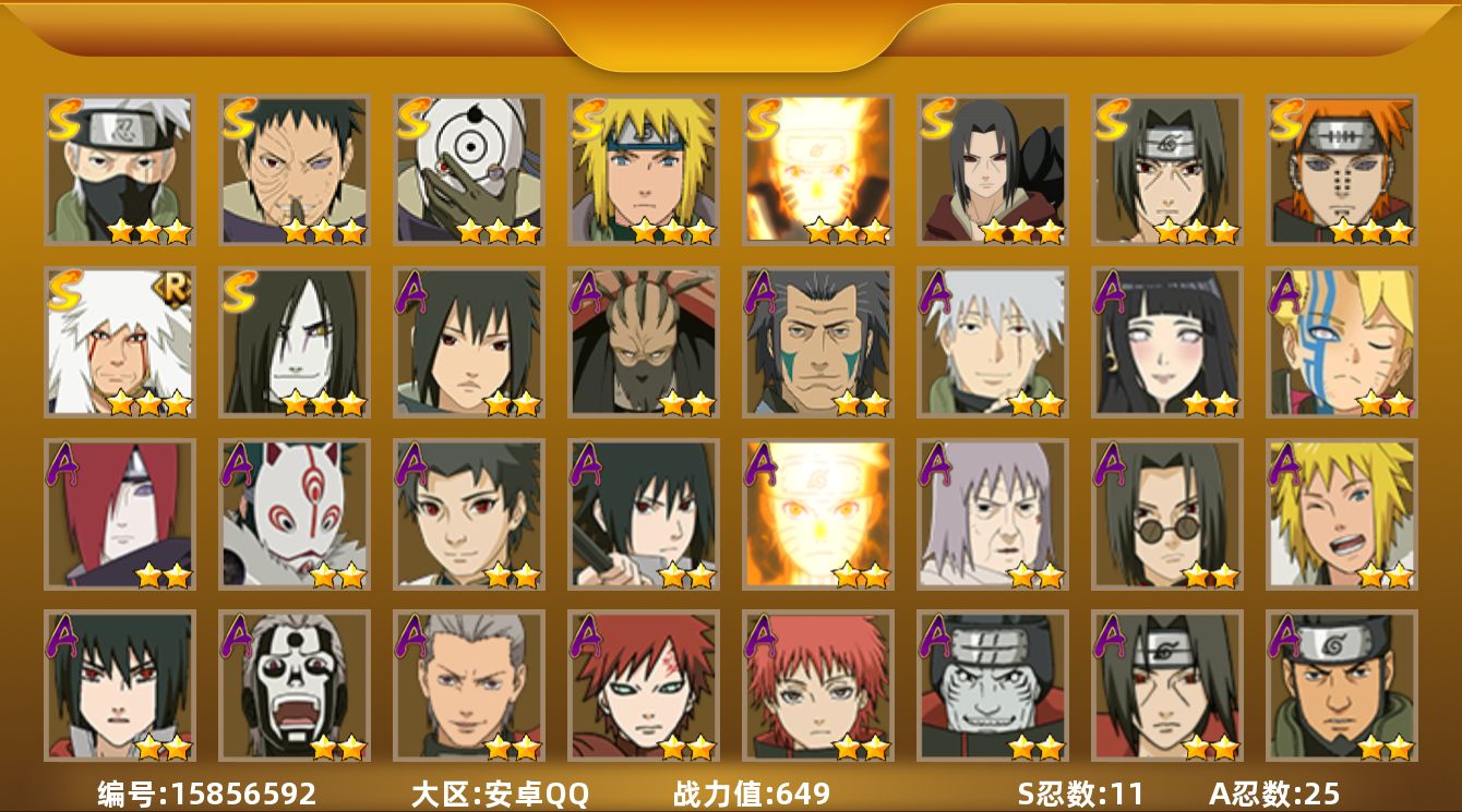 [15856592]11S级忍者数-25A级忍者数 【S级忍者】:宇智波鼬「秽土转生」(3星),宇智波带土「忍界大战」(3星),宇智波鼬「须佐能乎」(3星),旗木卡卡西「须佐能乎」(3星),自来也「舞之豪杰」(3星),大蛇丸(3星),波风水门(3星),漩涡鸣人「九喇嘛连结」(3星),佩恩「天道」(3星),宇智波斑 「白面具」(3星宇智波斑「白面具」),漩涡鸣人·宇智波佐助(3星) 【A级忍者】:长门「青年」(2星),波风水门「新春限定」(2星),飞段(3星),飞段「死司凭血」(2星),干柿鬼鲛(4星),漩涡博人「桃式显现」(2星),漩涡鸣人「九尾查克拉」(2星),迈特凯(3星),旗木卡卡西「幻之真容」(2星),桃地再不斩「秽土转生」(2星),我爱罗「疾风传」(3星),蝎(2星),蝎「绯流琥」(2星),猿飞阿斯玛(3星),宇智波止水「新春限定」(2星),宇智波鼬(2星),宇智波鼬「新春限定」(2星),宇智波佐助「须佐能乎」(2星),宇智波佐助「万花筒写轮眼」(2星),日向雏田「最终章」(2星),神秘面具男「忍者之路」(2星),千代「近松十人卫」(2星),宇智波泉奈(2星),不动(2星),迈特凯「青春爆炸」(2星)