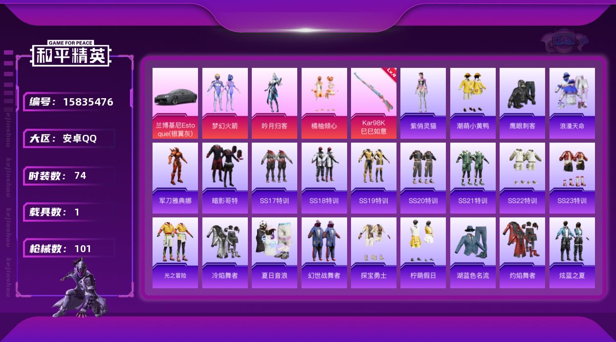 [15835476]【特价出售/店主推荐】安卓 手Q-3粉装-1特效枪-1载具-2粉色飞行器-30211热力值-7王牌印记-74套装-101枪皮 【热门品类】:粉装-梦幻火箭,套装-浪漫天命,角色-军刀雅典娜,套装-潮萌小黄鸭,套装-暗影哥特 【粉色套装】:粉装-梦幻火箭,粉装-吟月归客,粉装-橘柚倾心 【粉色枪皮等级】:Kar98K-巳巳如意(四级) 【粉色载具】:兰博基尼Estoque(银翼灰) 【粉色枪皮】:Kar98K-巳巳如意 【粉色飞行器】:齐天大圣飞行器 【粉色降落伞】:甜心宝贝降落伞,星之彼岸降落伞,洛神天依降落伞,风花雪月降落伞,极意拳锋降落伞,炫彩糖果降落伞 【稀有套装】:套装-雪国风尚,套装-炫彩糖果,角色-紫俏灵猫 【稀有枪皮】:AUG-冰晶雪宝,AKM-彩虹符号,AKM-破晓战魂,AKM-虎虎生威,M16A4-幻世战舞者,M16A4-蓝色火焰,SCAR-L-炫彩节奏,SCAR-L-玉兔迎春,SCAR-L-红色方程式,M416-红色方程式,M416-蓝色火焰,GROZA-异彩先驱,GROZA-恐龙拽拽,GROZA-春暖花开,GROZA-田园牧歌,GROZA-紫翼圣骑,AUG-灵符少年,AUG-耀粉歌者,QBZ-绚金瑰梦,QBZ-飞驰魅影,M762-天降萌叽,M762-瑞龙福将,Mk47-洛神天依,AC-VAL-天降萌叽,蜜獾-天降萌叽,蜜獾-娇憨猪猪,UZI-娇憨猪猪,UZI-影袭,UZI-炫彩节奏,UMP45-夜灯,UMP45-时空追击者,UMP45-蓝色火焰,Vector-田园牧歌,汤姆逊-天降萌叽,汤姆逊-异彩先驱,汤姆逊-耀粉歌者,MP5K-异彩先驱,P90-飞驰魅影,Kar98K-影袭,Kar98K-梦幻火箭,Kar98K-炫彩节奏,Kar98K-飞驰魅影,M24-炫彩节奏,VSS-田园牧歌,Mini14-异彩先驱,Mini14-炫彩节奏,Mini14-耀粉歌者,Win94-瑞龙福将,SLR-娇憨猪猪,SLR-月影鸳鸯,AMR-暗夜行者,MK20-H-墨染幽兰,M200-仲夏莫吉托,S686-彩虹符号,S686-生命誓言,S686-红色方程式,S1897-炫彩节奏,S1897-飞驰魅影,S12K-瑞龙福将,S12K-破晓战魂,S12K-垂柳戏鸭,S12K-娇憨猪猪,S12K-幻世战舞者,S12K-极意拳锋,SPAS-12-田园牧歌,M249-破晓战魂