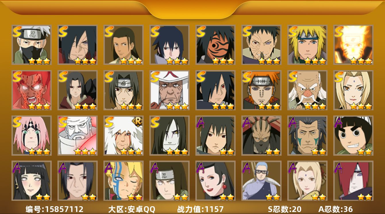 【S级忍者】:宇智波鼬「秽土转生」(3星),宇智波斑「秽土转生·解」(3星),大野木「忍界大战」(3星),春野樱「忍界大战」(3星),宇智波带土「忍界大战」(3星),宇智波鼬「须佐能乎」(3星),旗木卡卡西「须佐能乎」(3星),宇智波斑「木叶创立」(3星),千手柱间「木叶创立」(3星),自来也「舞之豪杰」(3星),大蛇丸(3星),纲手(3星),猿飞日斩(3星),波风水门(3星),神秘面具男「红夜之刃」(3星),漩涡鸣人「九喇嘛连结」(3星),迈特凯「死门」(3星),佩恩「天道」(3星),宇智波佐助「永恒万花筒」(3星),大筒木金式(3星)