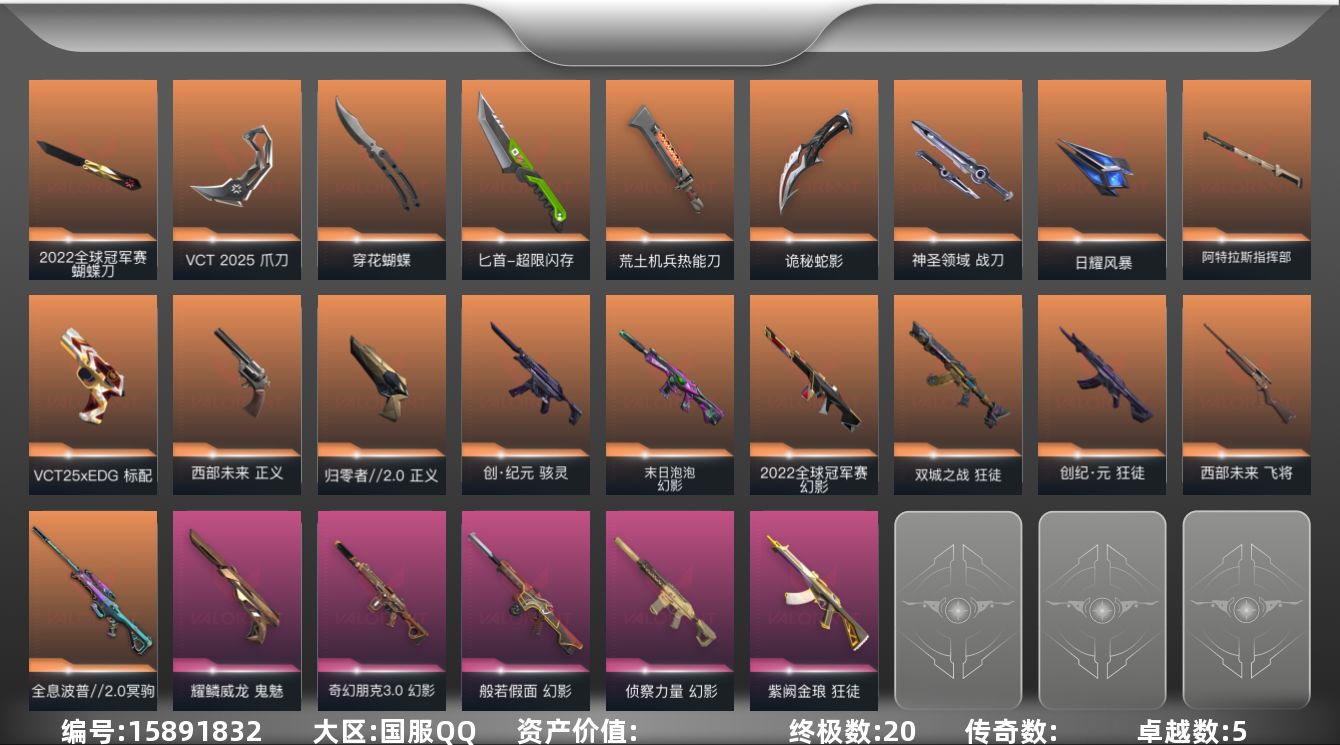 [15891832]【套装】:2022全球冠军赛套装,无畏契约季前邀请赛套装,VCT 2025 赛季套装 【英雄】:幻棱,炼狱,维斯,暮蝶,钛狐,壹决,铁臂,捷风,雷兹,幽影,不死鸟,贤者,猎枭,蝰蛇,零,芮娜,奇乐,尚勃勒,霓虹,斯凯,夜露,星礈,K/O,海神,盖可,黑梦,钢锁 【近战武器】:近战武器-2022全球冠军赛 蝴蝶刀,近战武器-无畏契约季前邀请赛 悲悯之刃,近战武器-穿花蝴蝶,近战武器-VCT 2025 爪刀,近战武器-超限闪存 匕首,近战武器-荒土机兵 热能刀,近战武器-诡秘蛇影 军刀,近战武器-神圣领域 战刀,近战武器-日耀风暴 遗器,近战武器-阿特拉斯指挥部 甩棍 【狂徒】:狂徒-双城之战,狂徒-创·纪元,狂徒-紫阙金琅,狂徒-荒土机兵,狂徒-诡秘蛇影 【幻影】:幻影-2022全球冠军赛,幻影-末日泡泡,幻影-般若假面,幻影-侦察力量,幻影-奇幻朋克//3.0,幻影-超限闪存,幻影-神圣领域,幻影-纳米打击,幻影-末日之翼 【戍卫】:戍卫-浮光跃金,戍卫-逆冲蛮牛,戍卫-月球哨兵,戍卫-折光棱晶 【獠犬】:獠犬-神圣领域,獠犬-模拟赫兹,獠犬-逆冲蛮牛 【冥驹】:冥驹-全息波普//2.0,冥驹-荒土机兵,冥驹-模拟赫兹,冥驹-星云暗涌 【飞将】:飞将-西部未来,飞将-末日之翼 【莽侠】:莽侠-超限闪存,莽侠-诡秘蛇影,莽侠-月球哨兵 【战神】:战神-神圣领域,战神-浮光跃金 【奥丁】:奥丁-纳米打击,奥丁-末日之翼 【判官】:判官-诡秘蛇影,判官-纳米打击x 【雄鹿】:雄鹿-模拟赫兹,雄鹿-逆冲蛮牛,雄鹿-月球哨兵 【骇灵】:骇灵-创·纪元,骇灵-荒土机兵,骇灵-浮光跃金,骇灵-星云暗涌 【蜂刺】:蜂刺-超限闪存,蜂刺-星云暗涌,蜂刺-折光棱晶 【标配】:标配-荒土机兵,标配-浮光跃金,标配-折光棱晶 【VCT手枪】:标配-VCT25 x EDG 【正义】:正义-归零者//2.0,正义-西部未来,正义-超限闪存,正义-纳米打击,正义-戍卫者,正义-月球哨兵 【鬼魅】:鬼魅-耀鳞威龙,鬼魅-诡秘蛇影,鬼魅-缄默者,鬼魅-模拟赫兹,鬼魅-星云暗涌 【狂怒】:狂怒-神圣领域,狂怒-逆冲蛮牛 【短炮】:短炮-末日之翼 【卡面】:进入射程 卡面,分崩离析 卡面,纳米打击 卡面,抑制技术 卡面,激斗汉堡 卡面,瓦娃脸雪糕 P2 卡面,从黄昏到黎明 卡面,荒土机兵 卡面,银弹猎