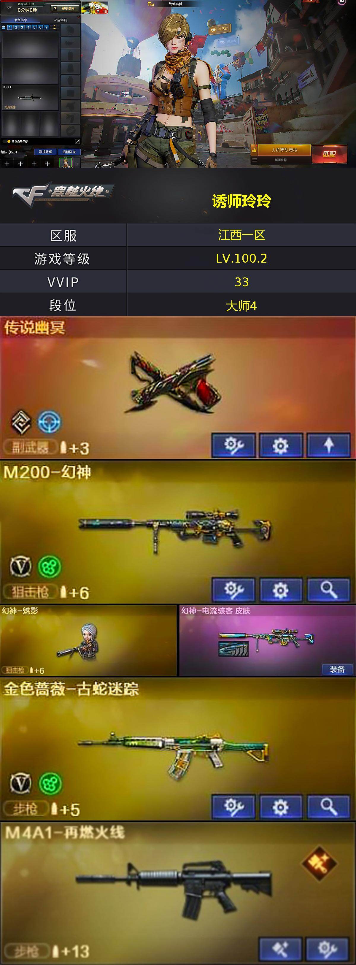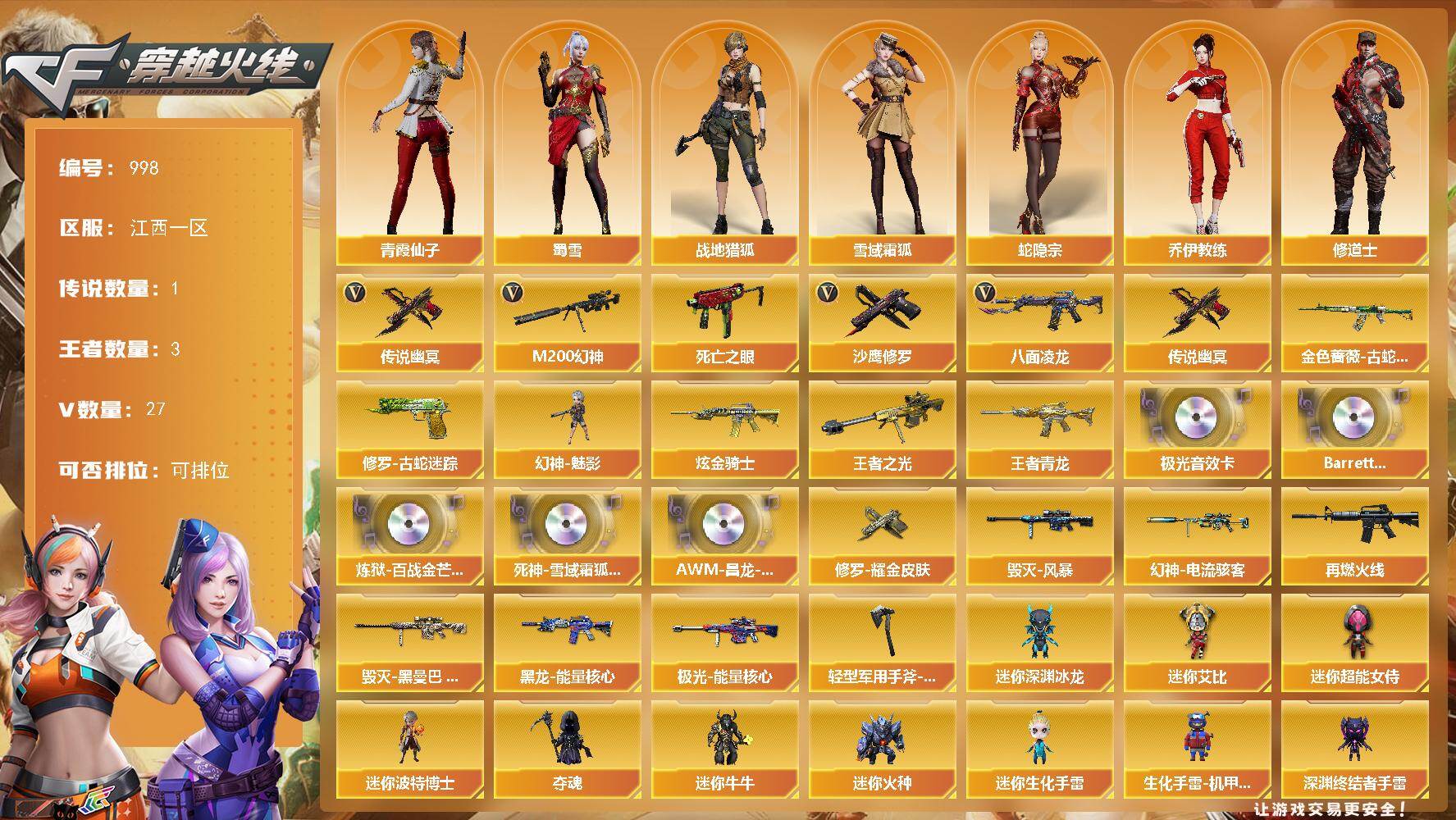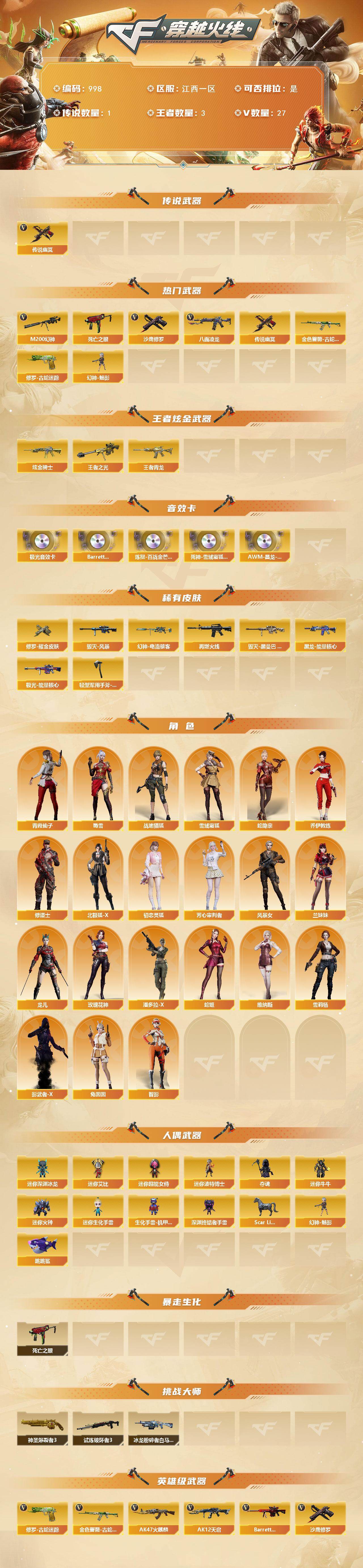 - [14658586]33V/100级/元帅/6王者/3英雄/QBZ03-金色蔷薇/Scar Light-白虎/M200-幻神/C.A.T/M4A1-黑骑士/加特林-炼狱/王者之啸/王者之击/AWM-裁决-凤灵皮肤/雷神-耀金皮肤/火麒麟-轻羽皮肤/毁灭-BEAN-2020MVP/毁灭-英雄计划 皮肤/轻型军用手斧-再燃火线/迷迭香/王者樱-热浪之夏/乔伊教练/云海玲珑/嘉年华灵狐/灵动武士/龙儿-小淘气/潘多拉-甜心教官/天龙-曼陀罗/AWM-灵狐-15周年嘉年华/生化手雷-机甲核心/超级对讲机/6炼狱/冰龙粉碎者-白马银枪/神圣爆裂者-末日/AK47-火麒麟/AK47-麒麟/M4A1-黑龙/M4A1-雷神/M4A1-武圣/AK47-黑鲨/M4A1-龙血/无影-神兵利器/AK47-黑武士-锦绣游龙/黑骑士-海王/Barrett-毁灭/AWM-裁决/烈龙-悦心-觉醒版/AA-12-雷霆/沙鹰-天神/屠龙/龙啸/麒麟刺-百战金芒/王者之啸-觉醒版/高爆手雷-云龙/闪光弹-云龙/烟雾弹-云龙/M4A1-赤狱骑士/CFS限定背包/女皇终结者-魔龙之吻/救世主-黑桃战神/黄金生化钩/绿色巨人/灵魂忍者/变异宝贝/迷雾幽灵/生化弹匣/夺命之镰/防化服/金色流光-枪王排位/星辰流光-枪王排位/流光-鎏金之域/防弹头盔/防弹衣/C4工具钳/手雷包