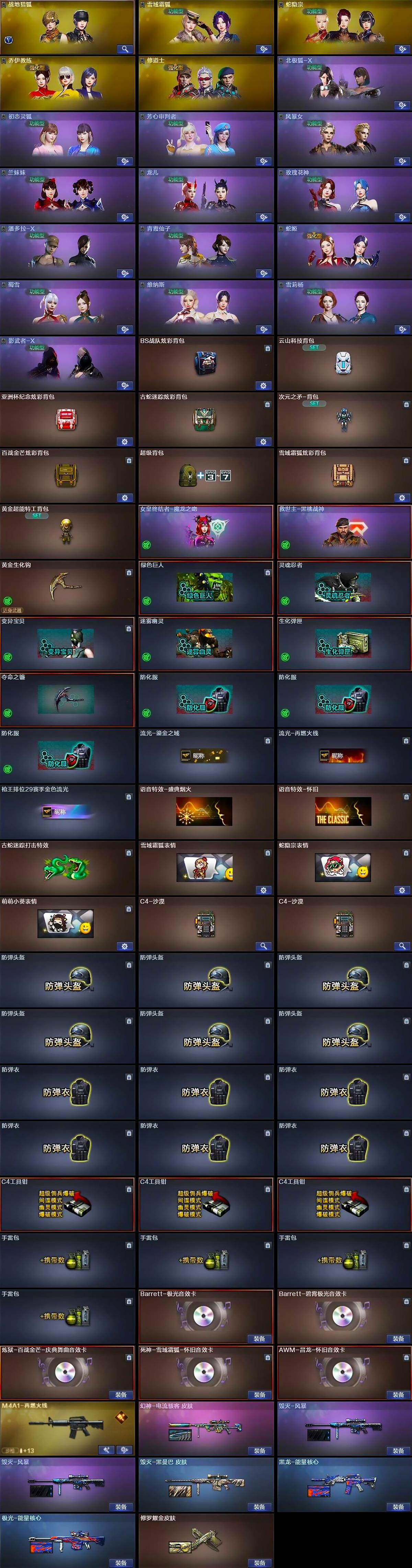 【道具】:BS战队炫彩背包,云山科技背包,亚洲杯纪念炫彩背包,古蛇迷踪炫彩背包,次元之矛-背包,百战金芒炫彩背包,超级背包,雪域霜狐炫彩背包,黄金超能特工背包,女皇终结者-魔龙之吻,救世主-黑桃战神,黄金生化钩,绿色巨人,灵魂忍者,变异宝贝,迷雾幽灵,生化弹匣,夺命之镰,防化服*3,流光-鎏金之域,流光-再燃火线,枪王排位29赛季金色流光,语音特效-盛典烟火,语音特效-怀旧,古蛇迷踪打击特效,雪域霜狐表情,蛇隐宗表情,萌萌小葵表情,C4-沙漠*2,防弹头盔*6,防弹衣*6,C4工具钳*3,手雷包*4