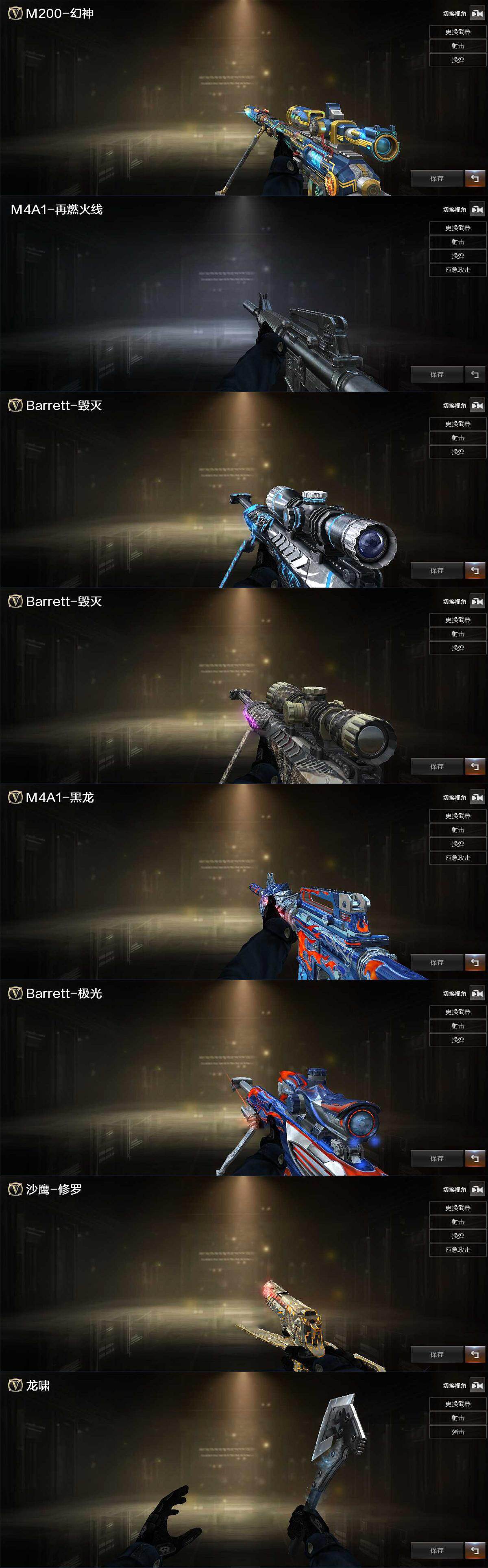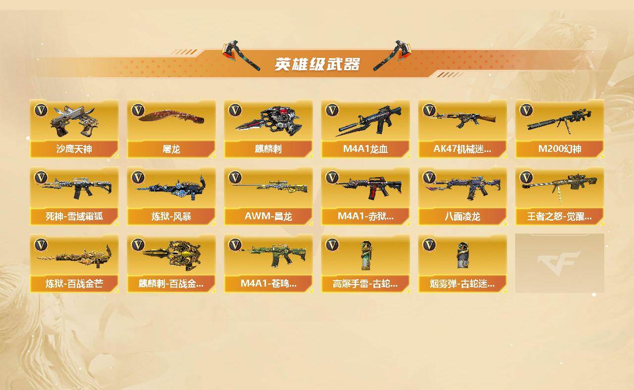 【英雄级武器】:AK47-火麒麟*2,AK12-天启,AK47-机械迷城,M4A1-龙血,八面凌龙,金色蔷薇-古蛇迷踪,死神-雪域霜狐,Barrett-极光*2,M200-幻神,王者之怒-觉醒版,炼狱-百战金芒,炼狱-风暴,沙鹰-修罗,沙鹰-天神,修罗-古蛇迷踪,屠龙,麒麟刺,麒麟刺-百战金芒,高爆手雷-古蛇迷踪,烟雾弹-古蛇迷踪,M4A1-赤狱骑士,M4A1-苍鸣雷神,AWM-昌龙