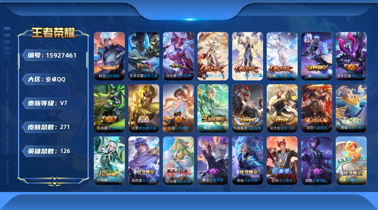 [15927461]安卓Q-V7-永恒钻石III段位-126英雄-271皮肤-1典藏皮肤-2星元-12传说-68史诗