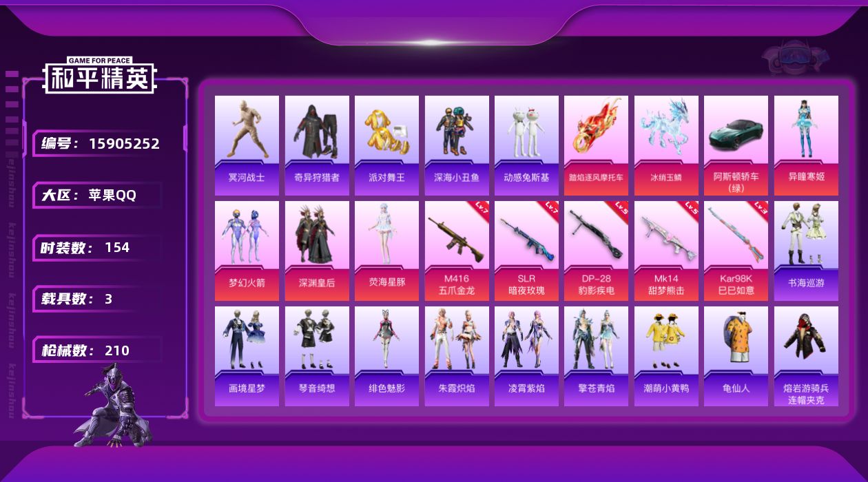 [15905252]【特价出售/店主推荐】苹果,手Q-1神装-4粉装-6特效枪-3载具-5粉色飞行器-69822热力值-12王牌印记-154套装-210枪皮
