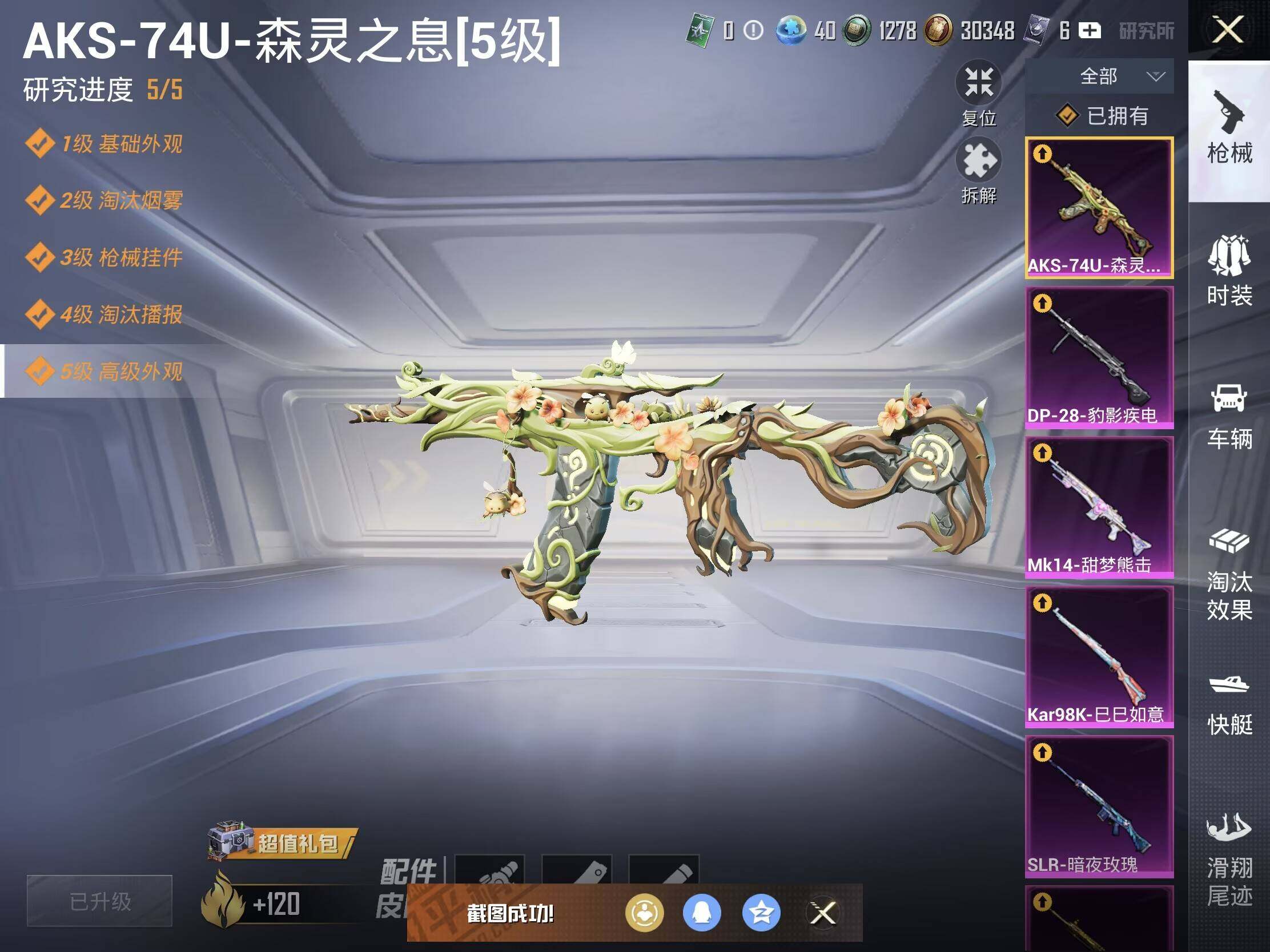 【粉色枪皮】:M416-五爪金龙,AKS-74U-森灵之息,Kar98K-巳巳如意,Mk14-甜梦熊击,SLR-暗夜玫瑰,DP-28-豹影疾电