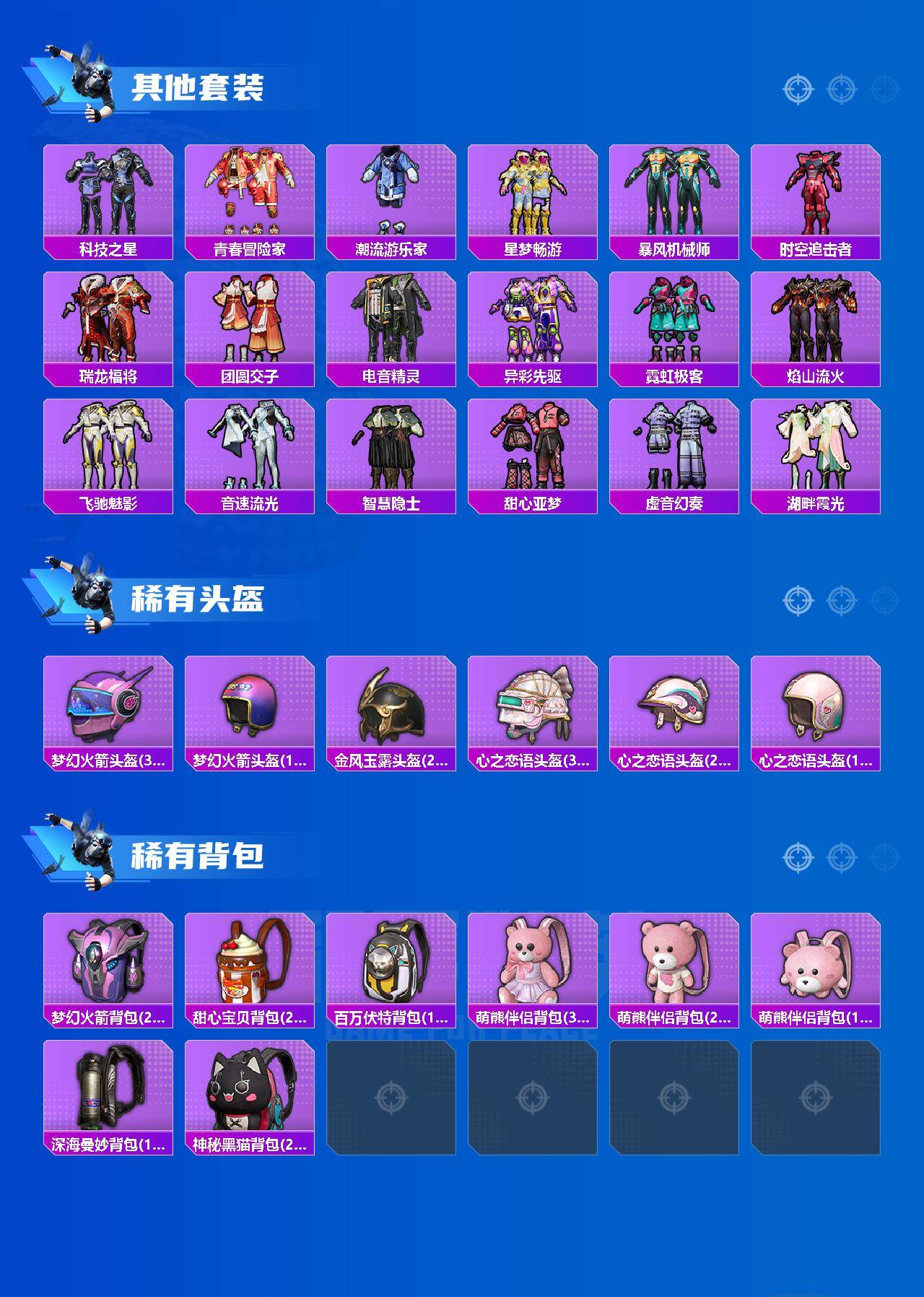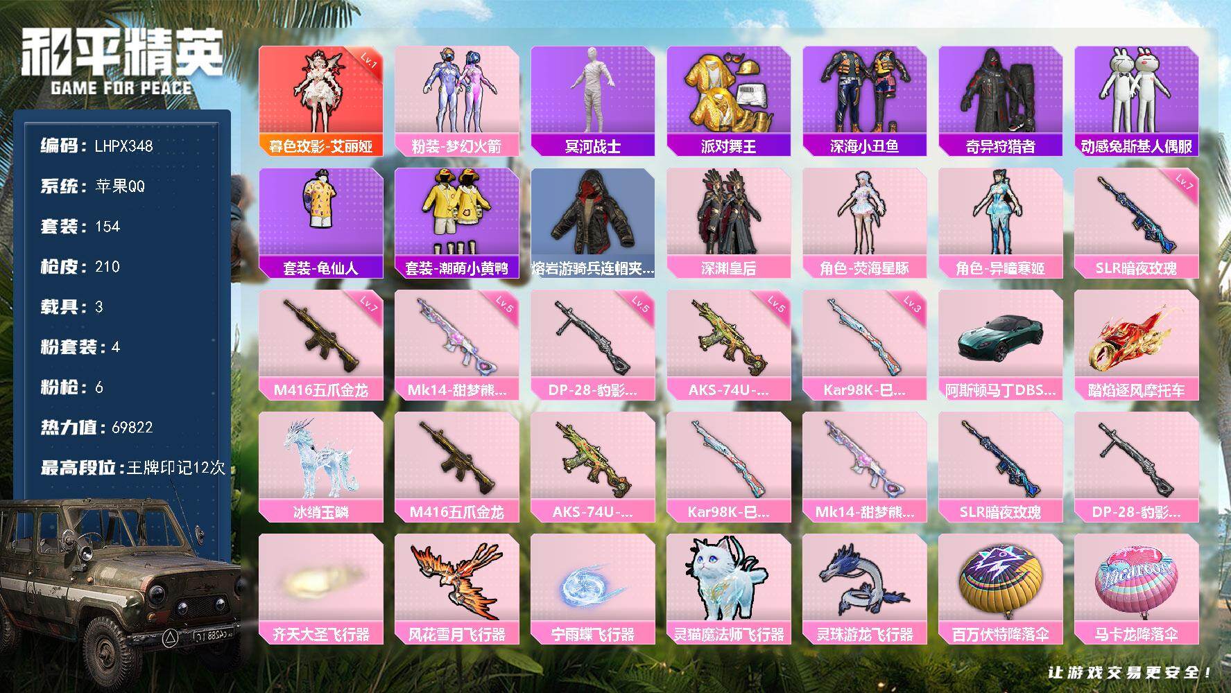 [15905252]【特价出售/店主推荐】苹果,手Q-1神装-4粉装-6特效枪-3载具-5粉色飞行器-69822热力值-12王牌印记-154套装-210枪皮 【热门品类】:粉装-梦幻火箭,套装-冥河战士,套装-派对舞王,套装-深海小丑鱼,套装-奇异狩猎者,套装-动感兔斯基人偶服,套装-龟仙人,套装-潮萌小黄鸭,熔岩游骑兵连帽夹克 【粉色套装】:粉装-深渊皇后,粉装-梦幻火箭,角色-荧海星豚,角色-异瞳寒姬 【粉色枪皮等级】:M416-五爪金龙(七级),AKS-74U-森灵之息(五级),Kar98K-巳巳如意(三级),Mk14-甜梦熊击(五级),SLR-暗夜玫瑰(七级),DP-28-豹影疾电(五级) 【粉色载具】:阿斯顿马丁DBS(绿),踏焰逐风摩托车,冰绡玉鳞 【粉色枪皮】:M416-五爪金龙,AKS-74U-森灵之息,Kar98K-巳巳如意,Mk14-甜梦熊击,SLR-暗夜玫瑰,DP-28-豹影疾电 【粉色飞行器】:齐天大圣飞行器,风花雪月飞行器,宁雨蝶飞行器,灵猫魔法师飞行器,灵珠游龙飞行器 【粉色降落伞】:百万伏特降落伞,马卡龙降落伞,潮汐统领降落伞,银刃赛罗降落伞,筑梦精灵降落伞,未来歌姬降落伞,金丰海韵降落伞,智耀战神降落伞,最终圣卫者降落伞,宁雨蝶降落伞,荧海星豚降落伞,灵猫魔法师降落伞,魔童闹海 敖丙降落伞,炫彩糖果降落伞 【稀有套装】:套装-龟仙人,套装-雪国风尚,套装-紫幽梦,套装-蓝冰羽,套装-星影赞美诗,套装-彩虹兔,套装-云朵鹅,套装-雪绒豹,角色-乐音,角色-夜瞳黯灵,套装-朱霞炽焰,套装-凌霄紫焰,套装-擎苍青焰,角色-绯色魅影,套装-书海巡游,套装-画境星梦,套装-琴音绮想,角色-月烬之祷 【稀有枪皮】:AKM-四圣焕新,AKM-奇异狩猎者,AKM-彩虹符号,AKM-破晓战魂,AKM-萌趣颜团子,AKM-虎虎生威,AKM-灵猫魔法师,M16A4-冥河战士,M16A4-幻世战舞者,M16A4-甜心亚梦,SCAR-L-炫彩节奏,SCAR-L-玉兔迎春,SCAR-L-金风玉露,SCAR-L-黄金龙骨,SCAR-L-冷漠罗丽,M416-滑板小狐,M416-潮汐统领,M416-红色方程式,M416-绯红前夜,M416-蓝色火焰,GROZA-异彩先驱,GROZA-彩虹符号,GROZA-治愈之星,GROZA-荧海星豚,AUG-甜蜜菠萝,AUG-青春冒险家,QBZ-原初