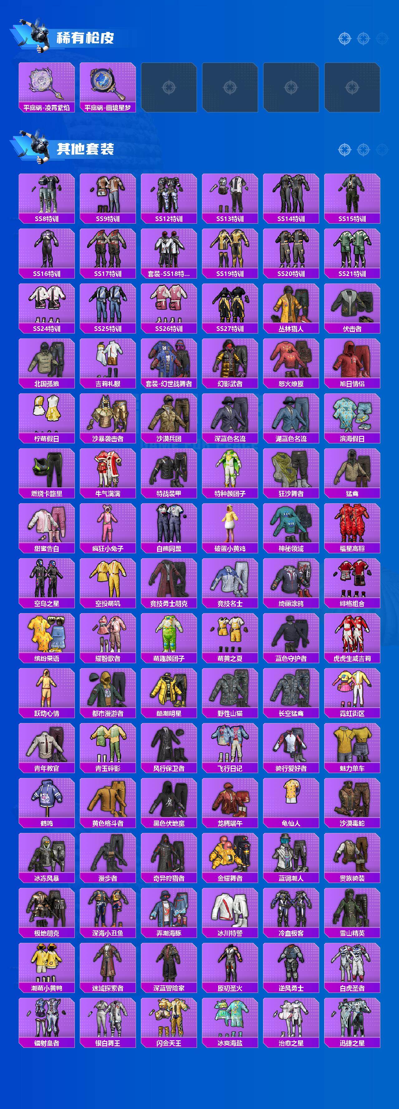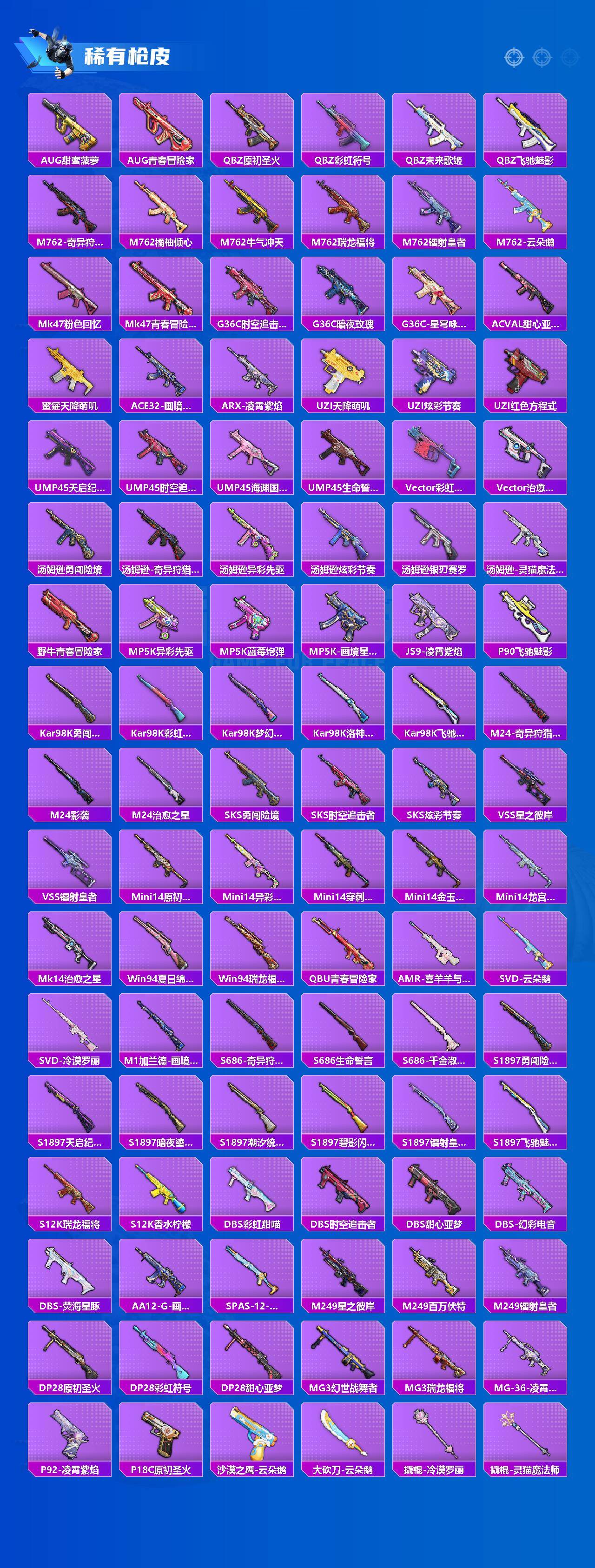 【稀有枪皮】:AKM-四圣焕新,AKM-奇异狩猎者,AKM-彩虹符号,AKM-破晓战魂,AKM-萌趣颜团子,AKM-虎虎生威,AKM-灵猫魔法师,M16A4-冥河战士,M16A4-幻世战舞者,M16A4-甜心亚梦,SCAR-L-炫彩节奏,SCAR-L-玉兔迎春,SCAR-L-金风玉露,SCAR-L-黄金龙骨,SCAR-L-冷漠罗丽,M416-滑板小狐,M416-潮汐统领,M416-红色方程式,M416-绯红前夜,M416-蓝色火焰,GROZA-异彩先驱,GROZA-彩虹符号,GROZA-治愈之星,GROZA-荧海星豚,AUG-甜蜜菠萝,AUG-青春冒险家,QBZ-原初
