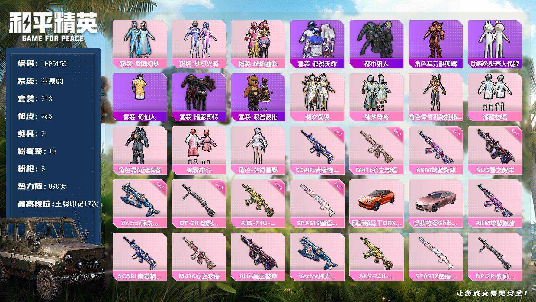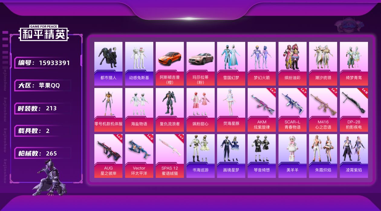 [15933391]【特价出售/店主推荐】苹果 手Q-10粉装-8特效枪-2载具-5粉色飞行器-89005热力值-17王牌印记-213套装-265枪皮【热门品类】:粉装-雪国幻梦,粉装-梦幻火箭,粉装-缤纷油彩,套装-浪漫天命,套装-都市猎人,角色-军刀雅典娜,套装-动感兔斯基人偶服,套装-龟仙人,套装-暗影哥特,套装-浪漫波比【粉色套装】:粉装-雪国幻梦,粉装-梦幻火箭,粉装-缤纷油彩,粉装-潮汐统领,粉装-绮梦青鸾,角色-零号机款机体服,粉装-海盐物语,角色-复仇流浪者,粉装-飒粉甜心,角色-荧海星豚【粉色枪皮等级】:AKM-炫紫旋律(七级),SCAR-L-青春物语(七级),M416-心之恋语(七级),AUG-星之彼岸(五级),Vector-环太平洋(五级),AKS-74U-森灵之息(五级),SPAS-12-蜜语绒猫(一级),DP-28-豹影疾电(五级)【粉色载具】:阿斯顿马丁DBX(橙),玛莎拉蒂Ghibli(粉)【粉色枪皮】:AKM-炫紫旋律,SCAR-L-青春物语,M416-心之恋语,AUG-星之彼岸,Vector-环太平洋,AKS-74U-森灵之息,SPAS-12-蜜语绒猫,DP-28-豹影疾电【粉色飞行器】:梦幻火箭飞行器,心之恋语飞行翼,星之彼岸飞行器,极意拳锋飞行器
