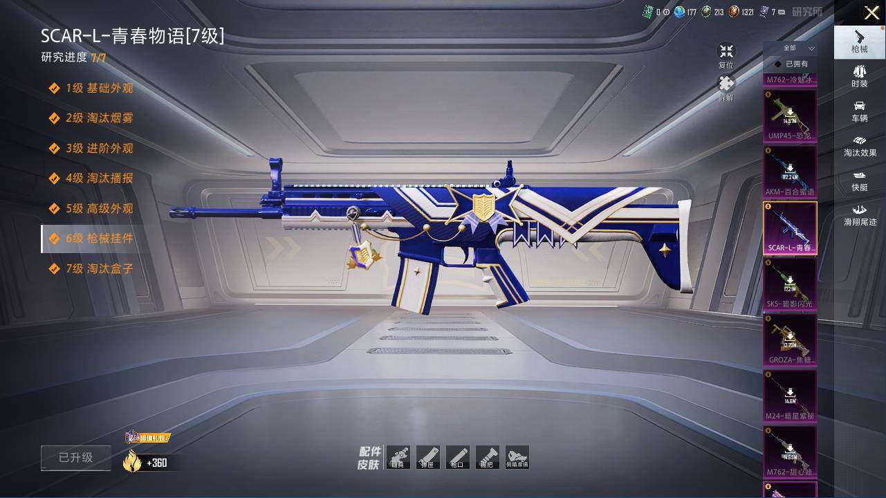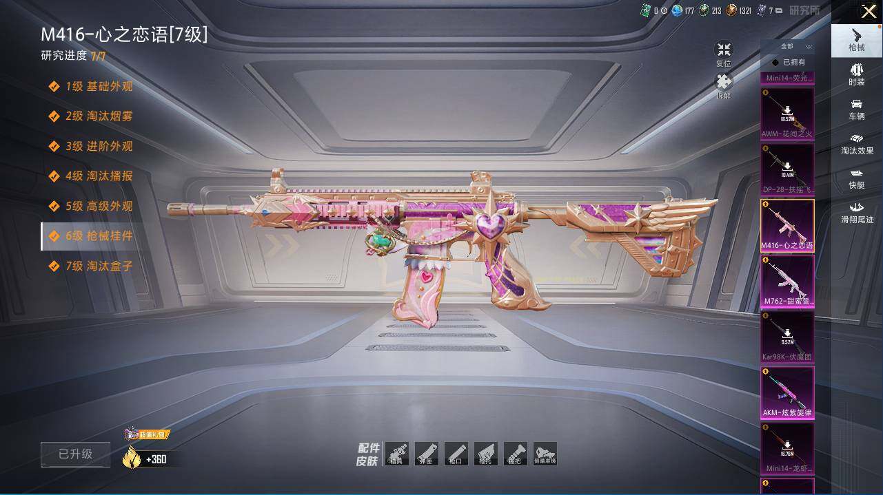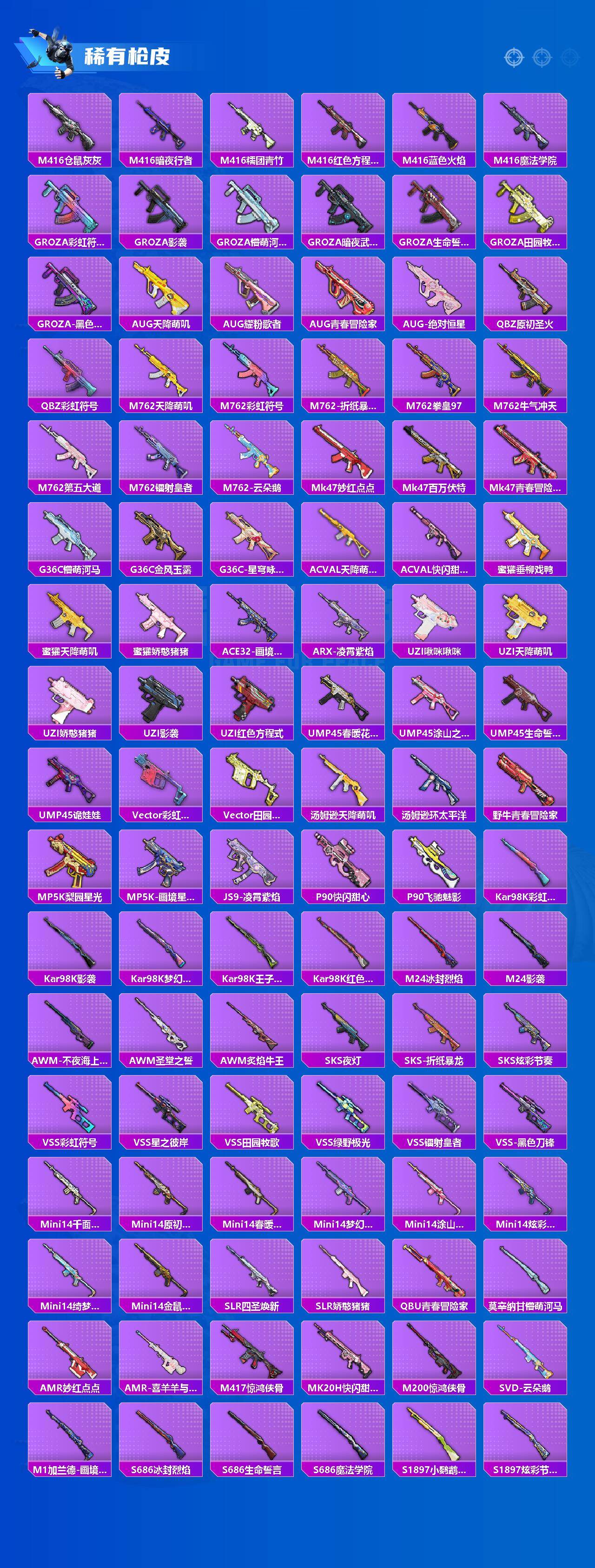 AKM-炫紫旋律,SCAR-L-青春物语,M416-心之恋语,AUG-星之彼岸,Vector-环太平洋,SPAS-12-蜜语绒猫