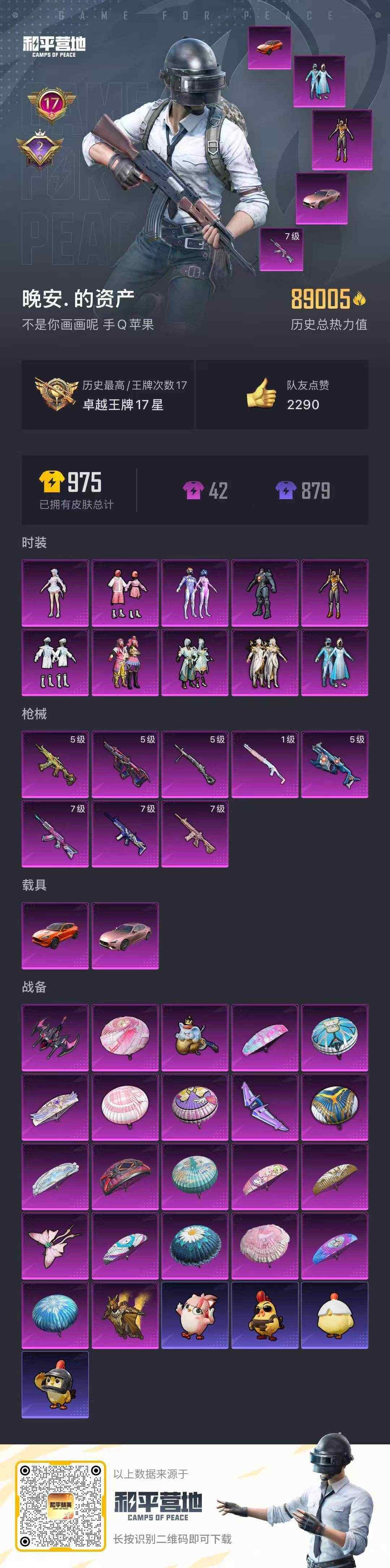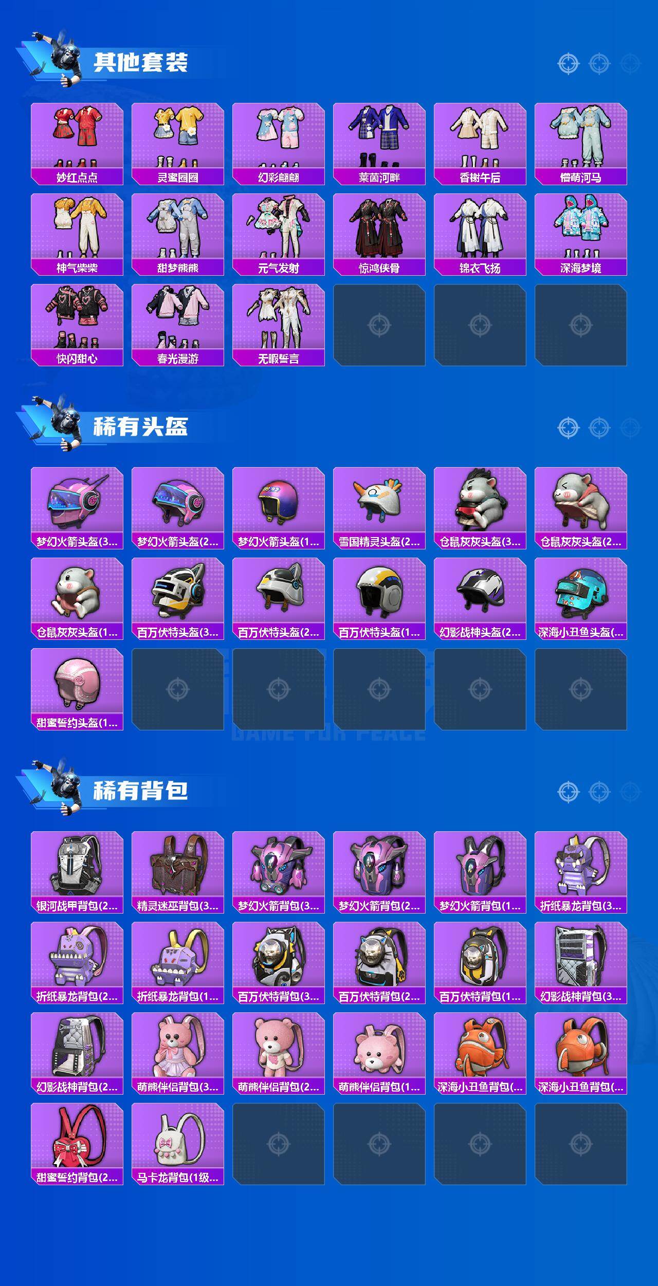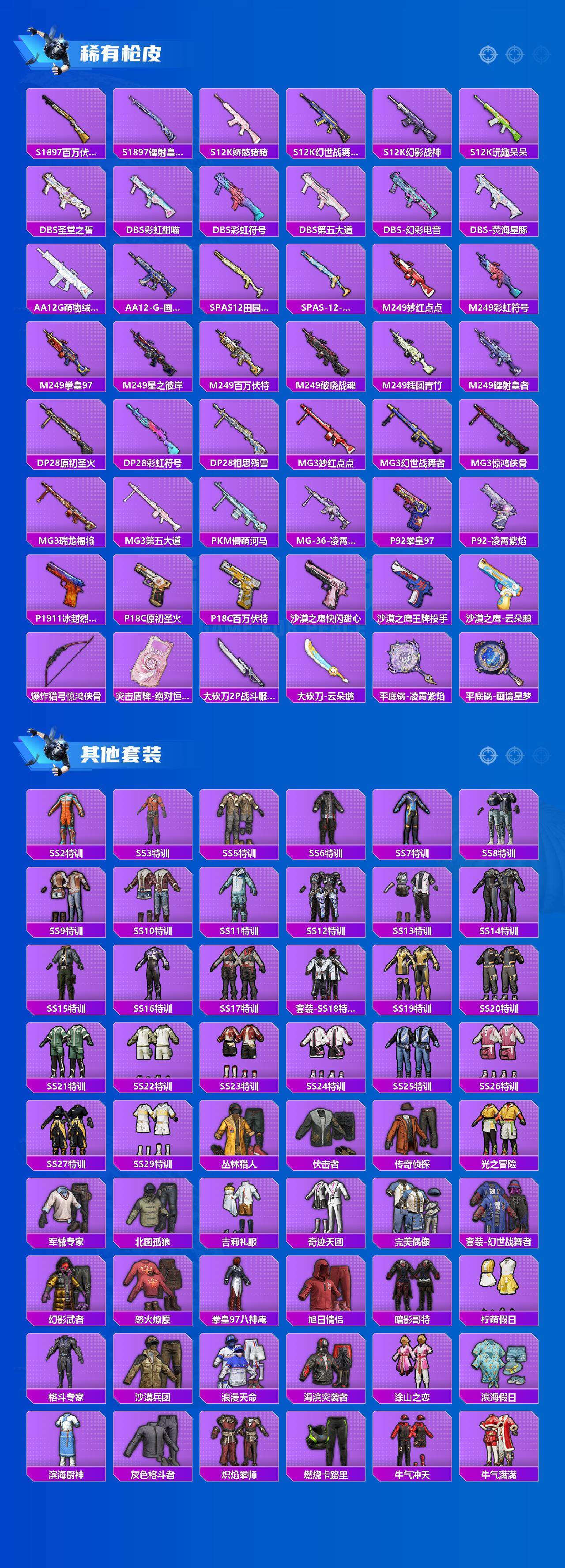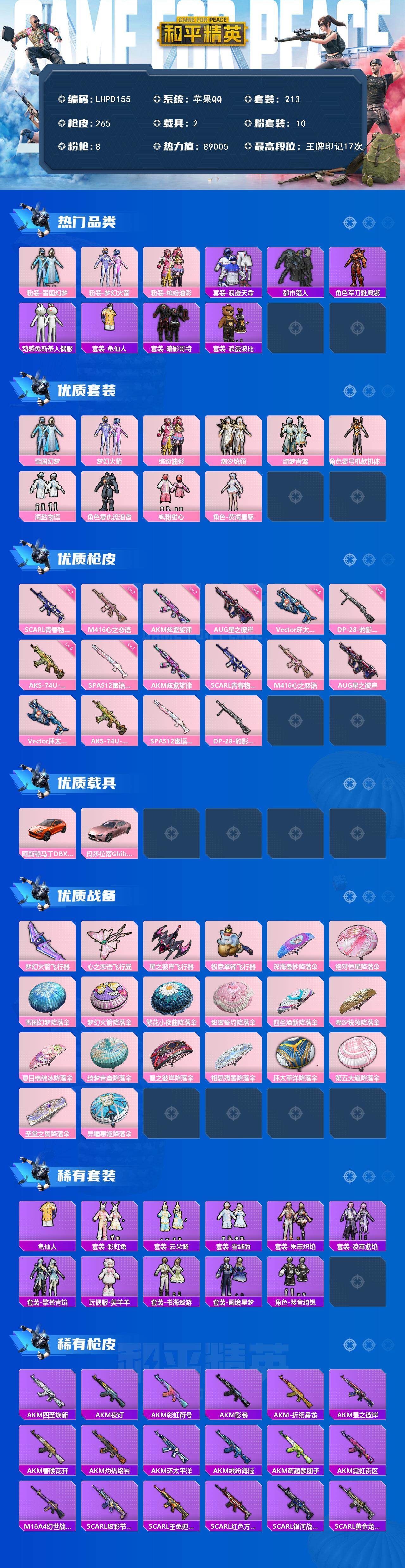 - [11601325]10粉装 7特效枪 21印记 可二次 可修改实名 优质装备:Mini14荧光虫舞,深渊皇后,宝贝奶油派,天使彩虹糖,M416风花雪月,AKM绿萝繁花,七级M416-风花雪月,七级Mini14-荧光虫舞,M416电玩时刻,AUG-暖羊咩咩,星穹咏叹调,Kar98K-巳巳如意 热门装扮:吟月归客,薄荷物语,垂柳戏鸭,飒粉甜心,光极星,金丰海韵,软萌银虎,激萌罗小黑,迅捷狂鲨,鹰眼刺客,深海小丑鱼,暗夜魅影 五级特效枪:五级Kar98K-巳巳如意,五级DP-28-豹影疾电,五级AUG-暖羊咩咩,五级M416-电玩时刻,五级AKM-绿萝繁花 紫色装扮:SS22特训,莱茵河畔,飞狐塔尔斯,妙红点点,幻彩翩翩,SS23特训,俏皮奶喵,暖心橘喵,娇憨猪猪,萌趣咩咩,SS21特训,SS30特训套装,军械专家,人气偶像,冰川特警,冷焰舞者,千禧之恋,青涩时光,SS20特训,SS31特训套装,云朵鹅,雪绒豹,SS33特训套装,顶瓜瓜,青春冒险家,潮流游乐家,SS15特训,闪银刀客,时空追击者,暴风机械师,星辰守护者,SS16特训,冰爽风暴,星梦畅游,镭射皇者,闪金天王,银白舞王,SS13特训,冰爽海盐,治愈之星,迅捷之星,科技之星,SS14特训,萌趣颜团子,特种颜团子,虚音幻奏,雪兔飞飞,飞驰魅影,音速流光,极速竞梦,SS19特训,浑天鲲鹏,甜心亚梦,豚鼠丹丹,瑞龙福将,团圆交子,SS17特训,异彩先驱,缤纷焰火,SS18特训,吉莉礼服,长空猛禽,迎春赐吉,都市魅力,酒红色名流,酷潮明星,野性战魂,雨林探路者,雪山精英,雪鹰学院,霓虹极客,霓虹街区,青年教官,缤纷果语,耀眼新星,蓝彩潮人,蓝色守护者,蓝色运动,虎虎生威吉莉,街头潮人,超能勇士,青春校园,蜜露汐语,蓝海鲸歌,风行保卫者,龙的传人,飞行日记,魅力单车,鹤鸣,麻辣教官,黄色伏地魔,黄色名流,黄色运动,黎明保卫者,黑色伏地魔,龙腾端午,龟仙人,冰河战士,龙魂突击队,蝶变,香桃花海,绮丽涂鸦,极地朋克,极速红龙,柠萌假日,棕色飞行服,橘黑制服,沙漠兵团,海岛探路者,涂山之恋,深蓝色名流,湖蓝色名流,幻世战舞者,夏日音浪,完美偶像,帅气教官,幻影武者,战地督导,探宝勇士,滨海假日,甜蜜熊情侣,登山爱好者,白熊同盟,白色伏地魔,破晓战魂,破蛋小黄鸡,王牌教练,福星高照,空岛之星,空投萌叽,竞技达人朋克,红色运动,猛禽,滨海厨神,