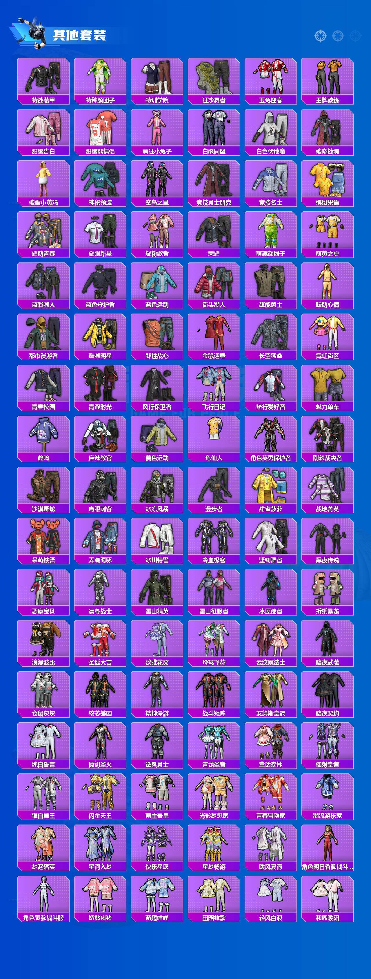 套装-雪国幻梦,套装-梦幻火箭,套装-缤纷油彩,套装-都市猎人,套装-浪漫波比,套装-潮汐统领,套装-绮梦青鸾,角色-零号机款机体服,套装-海盐物语,角色-复仇流浪者,套装-飒粉甜心,奇迹天团套装,套装-鹰眼刺客,套装-呆萌铁蟹,套装-暗夜武装,套装-仓鼠灰灰