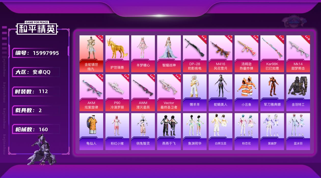 [15997995]【店主推荐捡漏号!可直接换绑】地铁满天赋/安卓 手Q-1神装-2粉装-9特效枪-2载具-5粉色飞行器-54241热力值-8王牌印记-112套装-160枪皮【红色神装等级】:金蛇镇世-烛九(三级)【红色角色神装】:金蛇镇世-烛九【热门品类】:套装-小丑鱼,角色-军刀雅典娜,套装-金羽特工,套装-龟仙人,套装-粉红小猪【粉色载具】:僚机-圣域龙宝,护世瑞兽【粉色套装】:角色-智耀战神,角色-羊梦糖心【粉色枪皮等级】:AKM-炫紫旋律(四级),M416-风花雪月(五级),Vector-最终圣卫者(三级),汤姆逊-热量炸弹(五级),P90-冷漠罗丽(四级),Kar98K-巳巳如意(五级),AWM-湮灭星辰(四级),Mk14-甜梦熊击(五级),DP-28-豹影疾电(五级)【粉色枪皮】:AKM-炫紫旋律,M416-风花雪月,Vector-最终圣卫者,汤姆逊-热量炸弹,P90-冷漠罗丽,Kar98K-巳巳如意,AWM-湮灭星辰,Mk14-甜梦熊击,DP-28-豹影疾电【粉色飞行器】:齐天大圣飞行器,凤舞九天飞行器,万象金身飞行器,终晖之翼飞行器