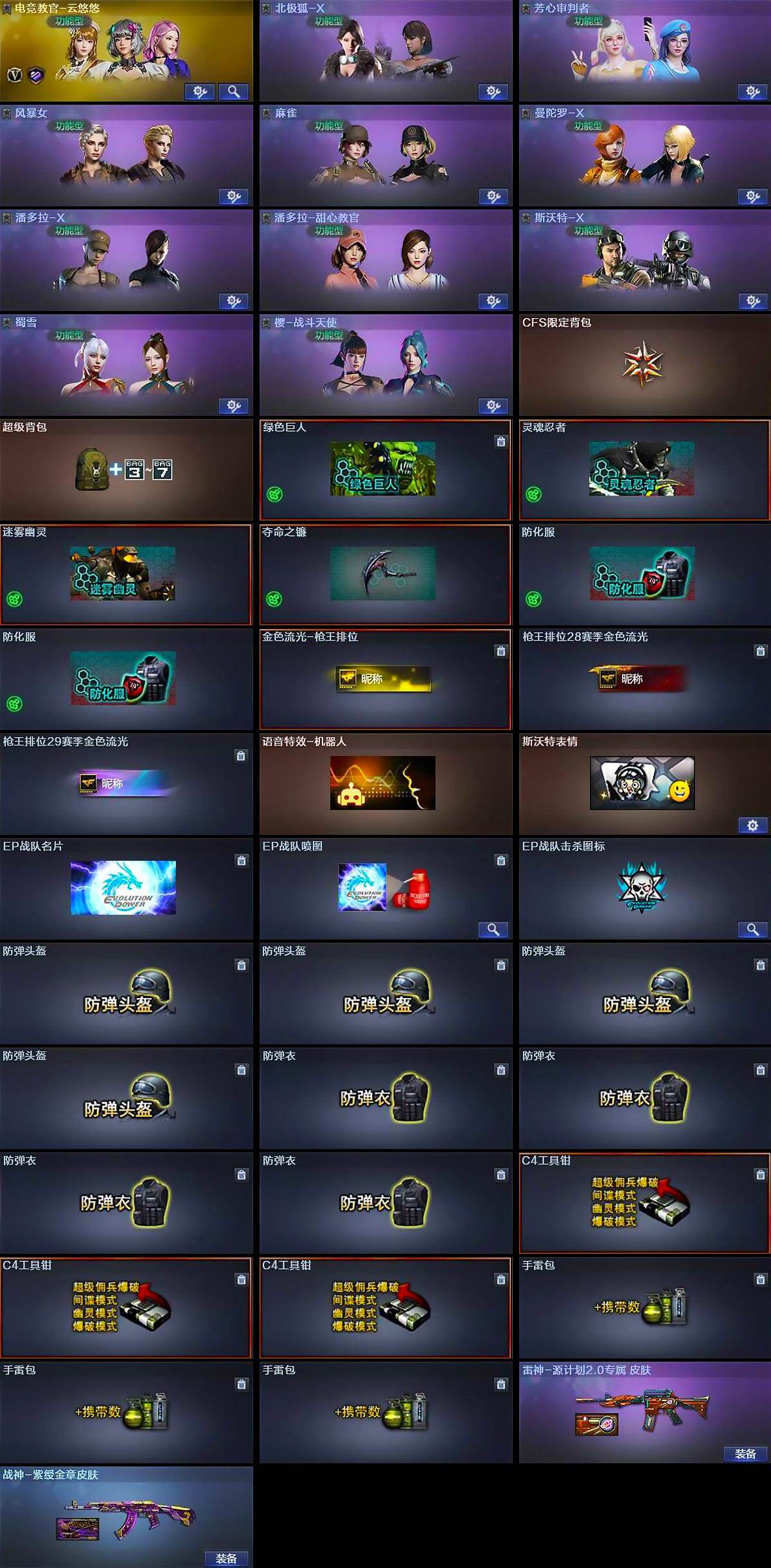 【道具】:CFS限定背包,超级背包,绿色巨人,灵魂忍者,迷雾幽灵,夺命之镰,防化服*2,金色流光-枪王排位,枪王排位28赛季金色流光,枪王排位29赛季金色流光,语音特效-机器人,斯沃特表情,EP战队名片,EP战队喷图,EP战队击杀图标,防弹头盔*4,防弹衣*4,C4工具钳*3,手雷包*3
