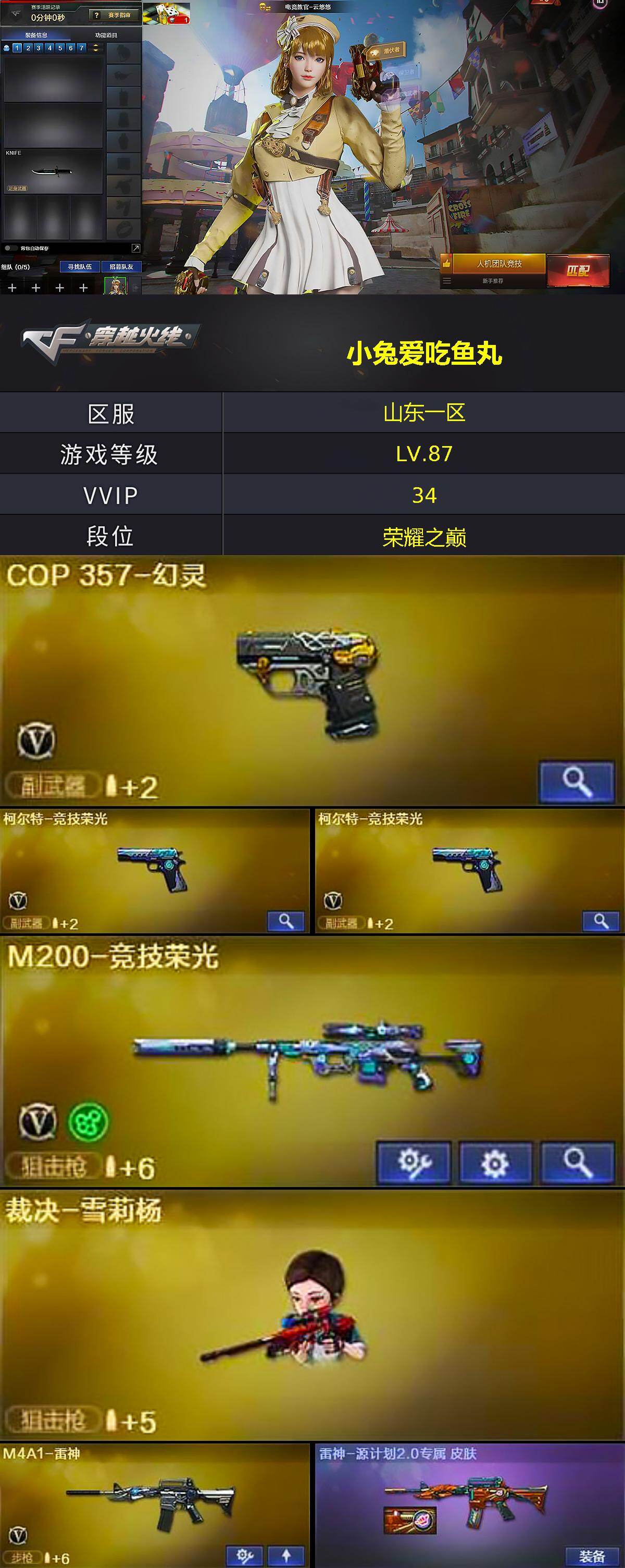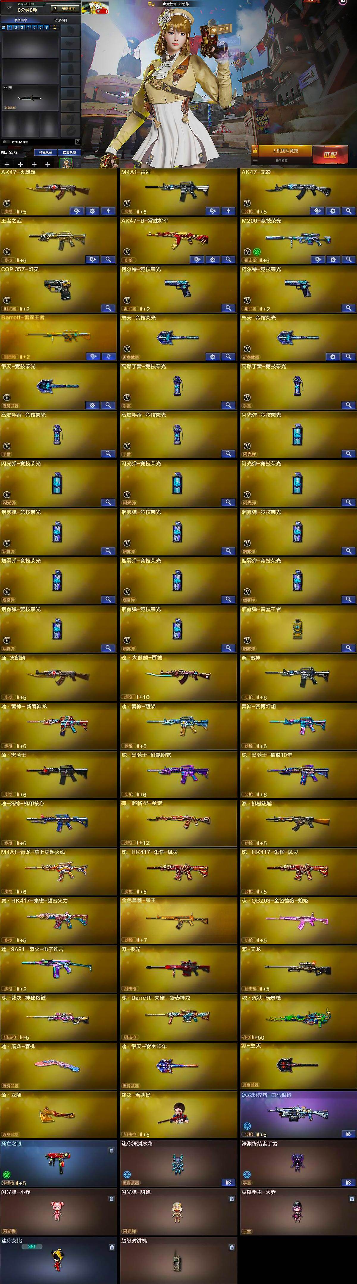 - [14787408]云南一区-156V-20王者-3炫金 【热门武器】:QBZ03-金色蔷薇,Scar Light-白虎,HK417-朱雀,M4A1-青龙,M200-幻神,M200-竞技荣光,死亡之眼,荣耀世冠-柯尔特,Cat-刀锋,炼狱-迷你小钢,M4A1-黑骑士*3,汤姆逊-烈龙*6,RPK-盘龙*4,加特林-炼狱*3,斯泰尔-蝴蝶,雷神-小红,COP-白鲨*2,USP-雷暴,COP-堕天神,COP 357-