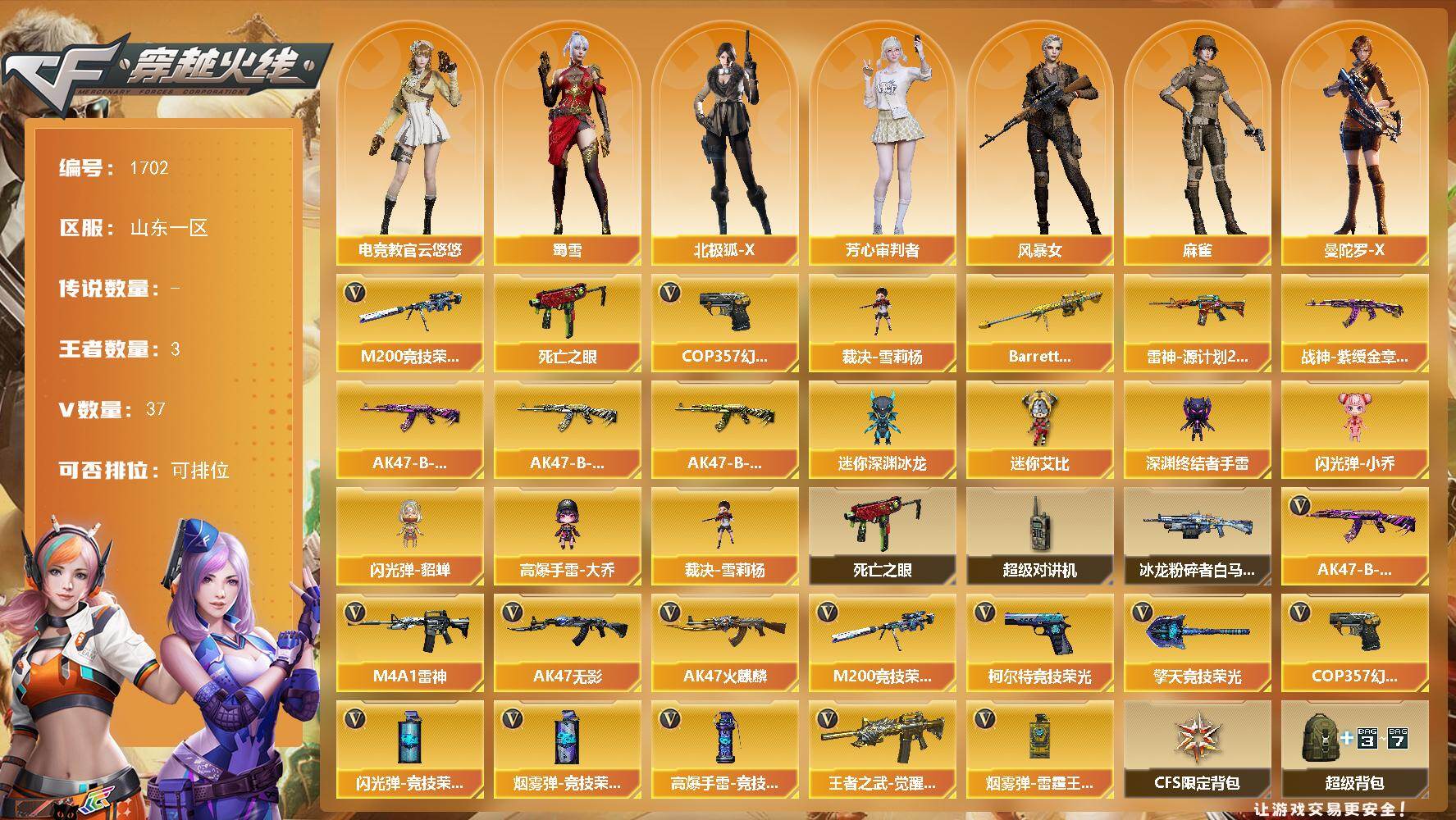 [15882576]山东一区-37V-3王者-0炫金 【热门武器】:M200-竞技荣光,死亡之眼,裁决-雪莉杨,COP 357-幻灵 【王者炫金武器】:Barrett-雷霆王者 【皮肤】:雷神-源计划2.0专属 皮肤,战神-紫绶金章皮肤,AK47-B-常胜将军-曹操,AK47-B-常胜将军-刘备,AK47-B-常胜将军-孙权 【角色】:电竞教官-云悠悠,北极狐-X,芳心审判者,风暴女,麻雀,曼陀罗-X,潘多拉-X,潘多拉-甜心教官,斯沃特-X,蜀雪,樱-战斗天使 【人偶武器】:裁决-雪莉杨,迷你深渊冰龙,深渊终结者手雷,闪光弹-小乔,闪光弹-貂蝉,高爆手雷-大乔,迷你艾比 【暴走生化】:死亡之眼,超级对讲机 【挑战大师】:冰龙粉碎者-白马银枪 【英雄级武器】:AK47-火麒麟,M4A1-雷神,AK47-无影,王者之武-觉醒版,AK47-B-常胜将军,M200-竞技荣光,COP 357-幻灵,柯尔特-竞技荣光*2,擎天-竞技荣光*3,高爆手雷-竞技荣光*4,闪光弹-竞技荣光*4,烟雾弹-竞技荣光*8,烟雾弹-雷霆王者-觉醒版 【道具】:CFS限定背包,超级背包,绿色巨人,灵魂忍者,迷雾幽灵,夺命之镰,防化服*2,金色流光-枪王排位,枪王排位28赛季金色流光,枪王排位29赛季金色流光,语音特效-机器人,斯沃特表情,EP战队名片,EP战队喷图,EP战队击杀图标,防弹头盔*4,防弹衣*4,C4工具钳*3,手雷包*3 【特殊枪械】: